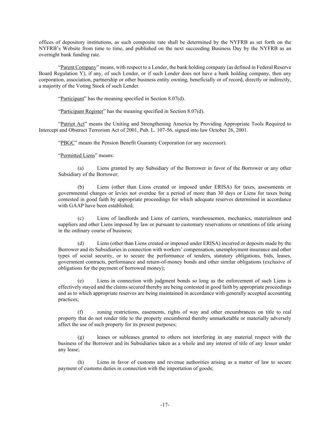 -17- offices of depository institutions, as such composite rate shall be determined by the NYFRB as set forth on the NYFRB’s Website from time to time, and published on the next succeeding Business Day by the NYFRB as an overnight bank funding rate. “Parent Company” means, with respect to a Lender, the bank holding company (as defined in Federal Reserve Board Regulation Y), if any, of such Lender, or if such Lender does not have a bank holding company, then any corporation, association, partnership or other business entity owning, beneficially or of record, directly or indirectly, a majority of the Voting Stock of such Lender. “Participant” has the meaning specified in Section 8.07(d). “Participant Register” has the meaning specified in Section 8.07(d). “Patriot Act” means the Uniting and Strengthening America by Providing Appropriate Tools Required to Intercept and Obstruct Terrorism Act of 2001, Pub. L. 107-56, signed into law October 26, 2001. “PBGC” means the Pension Benefit Guaranty Corporation (or any successor). “Permitted Liens” means: (a) Liens granted by any Subsidiary of the Borrower in favor of the Borrower or any other Subsidiary of the Borrower; (b) Liens (other than Liens created or imposed under ERISA) for taxes, assessments or governmental charges or levies not overdue for a period of more than 30 days or Liens for taxes being contested in good faith by appropriate proceedings for which adequate reserves determined in accordance with GAAP have been established; (c) Liens of landlords and Liens of carriers, warehousemen, mechanics, materialmen and suppliers and other Liens imposed by law or pursuant to customary reservations or retentions of title arising in the ordinary course of business; (d) Liens (other than Liens created or imposed under ERISA) incurred or deposits made by the Borrower and its Subsidiaries in connection with workers’ compensation, unemployment insurance and other types of social security, or to secure the performance of tenders, statutory obligations, bids, leases, government contracts, performance and return-of-money bonds and other similar obligations (exclusive of obligations for the payment of borrowed money); (e) Liens in connection with judgment bonds so long as the enforcement of such Liens is effectively stayed and the claims secured thereby are being contested in good faith by appropriate proceedings and as to which appropriate reserves are being maintained in accordance with generally accepted accounting practices; (f) zoning restrictions, easements, rights of way and other encumbrances on title to real property that do not render title to the property encumbered thereby unmarketable or materially adversely affect the use of such property for its present purposes; (g) leases or subleases granted to others not interfering in any material respect with the business of the Borrower and its Subsidiaries taken as a whole and any interest of title of any lessor under any lease; (h) Liens in favor of customs and revenue authorities arising as a matter of law to secure payment of customs duties in connection with the importation of goods;