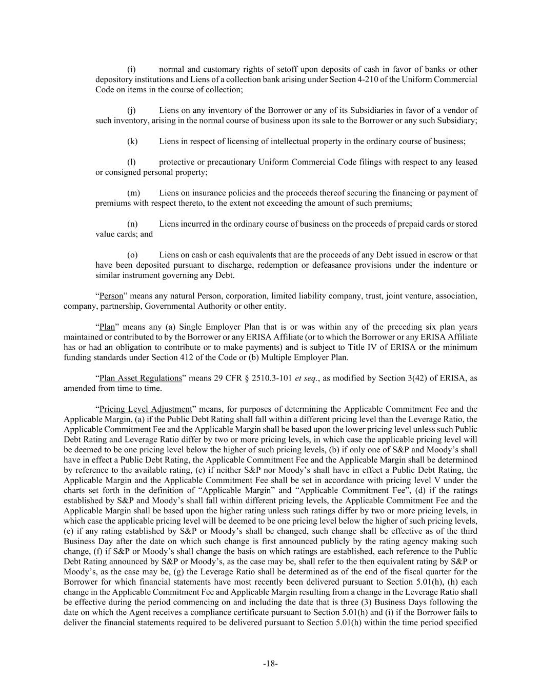 -18- (i) normal and customary rights of setoff upon deposits of cash in favor of banks or other depository institutions and Liens of a collection bank arising under Section 4-210 of the Uniform Commercial Code on items in the course of collection; (j) Liens on any inventory of the Borrower or any of its Subsidiaries in favor of a vendor of such inventory, arising in the normal course of business upon its sale to the Borrower or any such Subsidiary; (k) Liens in respect of licensing of intellectual property in the ordinary course of business; (l) protective or precautionary Uniform Commercial Code filings with respect to any leased or consigned personal property; (m) Liens on insurance policies and the proceeds thereof securing the financing or payment of premiums with respect thereto, to the extent not exceeding the amount of such premiums; (n) Liens incurred in the ordinary course of business on the proceeds of prepaid cards or stored value cards; and (o) Liens on cash or cash equivalents that are the proceeds of any Debt issued in escrow or that have been deposited pursuant to discharge, redemption or defeasance provisions under the indenture or similar instrument governing any Debt. “Person” means any natural Person, corporation, limited liability company, trust, joint venture, association, company, partnership, Governmental Authority or other entity. “Plan” means any (a) Single Employer Plan that is or was within any of the preceding six plan years maintained or contributed to by the Borrower or any ERISA Affiliate (or to which the Borrower or any ERISA Affiliate has or had an obligation to contribute or to make payments) and is subject to Title IV of ERISA or the minimum funding standards under Section 412 of the Code or (b) Multiple Employer Plan. “Plan Asset Regulations” means 29 CFR § 2510.3-101 et seq., as modified by Section 3(42) of ERISA, as amended from time to time. “Pricing Level Adjustment” means, for purposes of determining the Applicable Commitment Fee and the Applicable Margin, (a) if the Public Debt Rating shall fall within a different pricing level than the Leverage Ratio, the Applicable Commitment Fee and the Applicable Margin shall be based upon the lower pricing level unless such Public Debt Rating and Leverage Ratio differ by two or more pricing levels, in which case the applicable pricing level will be deemed to be one pricing level below the higher of such pricing levels, (b) if only one of S&P and Moody’s shall have in effect a Public Debt Rating, the Applicable Commitment Fee and the Applicable Margin shall be determined by reference to the available rating, (c) if neither S&P nor Moody’s shall have in effect a Public Debt Rating, the Applicable Margin and the Applicable Commitment Fee shall be set in accordance with pricing level V under the charts set forth in the definition of “Applicable Margin” and “Applicable Commitment Fee”, (d) if the ratings established by S&P and Moody’s shall fall within different pricing levels, the Applicable Commitment Fee and the Applicable Margin shall be based upon the higher rating unless such ratings differ by two or more pricing levels, in which case the applicable pricing level will be deemed to be one pricing level below the higher of such pricing levels, (e) if any rating established by S&P or Moody’s shall be changed, such change shall be effective as of the third Business Day after the date on which such change is first announced publicly by the rating agency making such change, (f) if S&P or Moody’s shall change the basis on which ratings are established, each reference to the Public Debt Rating announced by S&P or Moody’s, as the case may be, shall refer to the then equivalent rating by S&P or Moody’s, as the case may be, (g) the Leverage Ratio shall be determined as of the end of the fiscal quarter for the Borrower for which financial statements have most recently been delivered pursuant to Section 5.01(h), (h) each change in the Applicable Commitment Fee and Applicable Margin resulting from a change in the Leverage Ratio shall be effective during the period commencing on and including the date that is three (3) Business Days following the date on which the Agent receives a compliance certificate pursuant to Section 5.01(h) and (i) if the Borrower fails to deliver the financial statements required to be delivered pursuant to Section 5.01(h) within the time period specified