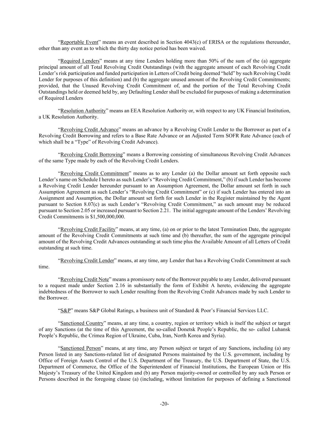 -20- “Reportable Event” means an event described in Section 4043(c) of ERISA or the regulations thereunder, other than any event as to which the thirty day notice period has been waived. “Required Lenders” means at any time Lenders holding more than 50% of the sum of the (a) aggregate principal amount of all Total Revolving Credit Outstandings (with the aggregate amount of each Revolving Credit Lender’s risk participation and funded participation in Letters of Credit being deemed “held” by such Revolving Credit Lender for purposes of this definition) and (b) the aggregate unused amount of the Revolving Credit Commitments; provided, that the Unused Revolving Credit Commitment of, and the portion of the Total Revolving Credit Outstandings held or deemed held by, any Defaulting Lender shall be excluded for purposes of making a determination of Required Lenders “Resolution Authority” means an EEA Resolution Authority or, with respect to any UK Financial Institution, a UK Resolution Authority. “Revolving Credit Advance” means an advance by a Revolving Credit Lender to the Borrower as part of a Revolving Credit Borrowing and refers to a Base Rate Advance or an Adjusted Term SOFR Rate Advance (each of which shall be a “Type” of Revolving Credit Advance). “Revolving Credit Borrowing” means a Borrowing consisting of simultaneous Revolving Credit Advances of the same Type made by each of the Revolving Credit Lenders. “Revolving Credit Commitment” means as to any Lender (a) the Dollar amount set forth opposite such Lender’s name on Schedule I hereto as such Lender’s “Revolving Credit Commitment,” (b) if such Lender has become a Revolving Credit Lender hereunder pursuant to an Assumption Agreement, the Dollar amount set forth in such Assumption Agreement as such Lender’s “Revolving Credit Commitment” or (c) if such Lender has entered into an Assignment and Assumption, the Dollar amount set forth for such Lender in the Register maintained by the Agent pursuant to Section 8.07(c) as such Lender’s “Revolving Credit Commitment,” as such amount may be reduced pursuant to Section 2.05 or increased pursuant to Section 2.21. The initial aggregate amount of the Lenders’ Revolving Credit Commitments is $1,500,000,000. “Revolving Credit Facility” means, at any time, (a) on or prior to the latest Termination Date, the aggregate amount of the Revolving Credit Commitments at such time and (b) thereafter, the sum of the aggregate principal amount of the Revolving Credit Advances outstanding at such time plus the Available Amount of all Letters of Credit outstanding at such time. “Revolving Credit Lender” means, at any time, any Lender that has a Revolving Credit Commitment at such time. “Revolving Credit Note” means a promissory note of the Borrower payable to any Lender, delivered pursuant to a request made under Section 2.16 in substantially the form of Exhibit A hereto, evidencing the aggregate indebtedness of the Borrower to such Lender resulting from the Revolving Credit Advances made by such Lender to the Borrower. “S&P” means S&P Global Ratings, a business unit of Standard & Poor’s Financial Services LLC. “Sanctioned Country” means, at any time, a country, region or territory which is itself the subject or target of any Sanctions (at the time of this Agreement, the so-called Donetsk People’s Republic, the so- called Luhansk People’s Republic, the Crimea Region of Ukraine, Cuba, Iran, North Korea and Syria). “Sanctioned Person” means, at any time, any Person subject or target of any Sanctions, including (a) any Person listed in any Sanctions-related list of designated Persons maintained by the U.S. government, including by Office of Foreign Assets Control of the U.S. Department of the Treasury, the U.S. Department of State, the U.S. Department of Commerce, the Office of the Superintendent of Financial Institutions, the European Union or His Majesty’s Treasury of the United Kingdom and (b) any Person majority-owned or controlled by any such Person or Persons described in the foregoing clause (a) (including, without limitation for purposes of defining a Sanctioned