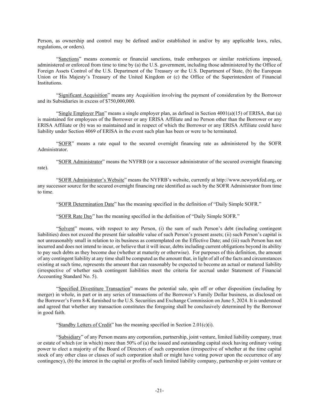 -21- Person, as ownership and control may be defined and/or established in and/or by any applicable laws, rules, regulations, or orders). “Sanctions” means economic or financial sanctions, trade embargoes or similar restrictions imposed, administered or enforced from time to time by (a) the U.S. government, including those administered by the Office of Foreign Assets Control of the U.S. Department of the Treasury or the U.S. Department of State, (b) the European Union or His Majesty’s Treasury of the United Kingdom or (c) the Office of the Superintendent of Financial Institutions. “Significant Acquisition” means any Acquisition involving the payment of consideration by the Borrower and its Subsidiaries in excess of $750,000,000. “Single Employer Plan” means a single employer plan, as defined in Section 4001(a)(15) of ERISA, that (a) is maintained for employees of the Borrower or any ERISA Affiliate and no Person other than the Borrower or any ERISA Affiliate or (b) was so maintained and in respect of which the Borrower or any ERISA Affiliate could have liability under Section 4069 of ERISA in the event such plan has been or were to be terminated. “SOFR” means a rate equal to the secured overnight financing rate as administered by the SOFR Administrator. “SOFR Administrator” means the NYFRB (or a successor administrator of the secured overnight financing rate). “SOFR Administrator’s Website” means the NYFRB’s website, currently at http://www.newyorkfed.org, or any successor source for the secured overnight financing rate identified as such by the SOFR Administrator from time to time. “SOFR Determination Date” has the meaning specified in the definition of “Daily Simple SOFR.” “SOFR Rate Day” has the meaning specified in the definition of “Daily Simple SOFR.” “Solvent” means, with respect to any Person, (i) the sum of such Person’s debt (including contingent liabilities) does not exceed the present fair saleable value of such Person’s present assets; (ii) such Person’s capital is not unreasonably small in relation to its business as contemplated on the Effective Date; and (iii) such Person has not incurred and does not intend to incur, or believe that it will incur, debts including current obligations beyond its ability to pay such debts as they become due (whether at maturity or otherwise). For purposes of this definition, the amount of any contingent liability at any time shall be computed as the amount that, in light of all of the facts and circumstances existing at such time, represents the amount that can reasonably be expected to become an actual or matured liability (irrespective of whether such contingent liabilities meet the criteria for accrual under Statement of Financial Accounting Standard No. 5). “Specified Divestiture Transaction” means the potential sale, spin off or other disposition (including by merger) in whole, in part or in any series of transactions of the Borrower’s Family Dollar business, as disclosed on the Borrower’s Form 8-K furnished to the U.S. Securities and Exchange Commission on June 5, 2024. It is understood and agreed that whether any transaction constitutes the foregoing shall be conclusively determined by the Borrower in good faith. “Standby Letters of Credit” has the meaning specified in Section 2.01(c)(i). “Subsidiary” of any Person means any corporation, partnership, joint venture, limited liability company, trust or estate of which (or in which) more than 50% of (a) the issued and outstanding capital stock having ordinary voting power to elect a majority of the Board of Directors of such corporation (irrespective of whether at the time capital stock of any other class or classes of such corporation shall or might have voting power upon the occurrence of any contingency), (b) the interest in the capital or profits of such limited liability company, partnership or joint venture or