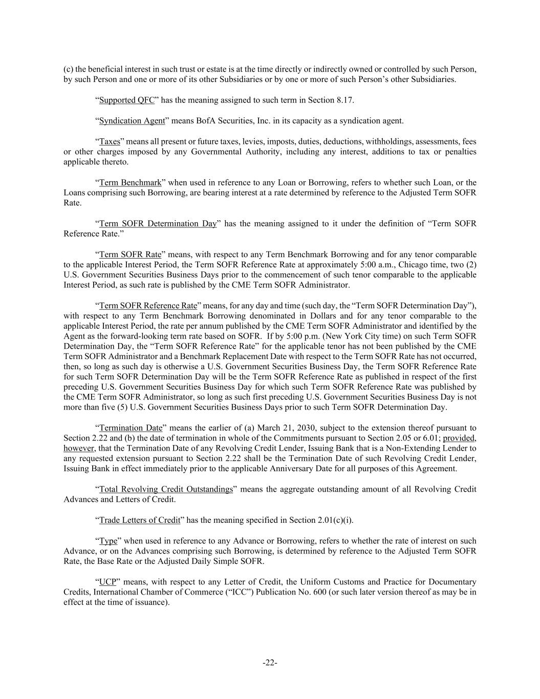 -22- (c) the beneficial interest in such trust or estate is at the time directly or indirectly owned or controlled by such Person, by such Person and one or more of its other Subsidiaries or by one or more of such Person’s other Subsidiaries. “Supported QFC” has the meaning assigned to such term in Section 8.17. “Syndication Agent” means BofA Securities, Inc. in its capacity as a syndication agent. “Taxes” means all present or future taxes, levies, imposts, duties, deductions, withholdings, assessments, fees or other charges imposed by any Governmental Authority, including any interest, additions to tax or penalties applicable thereto. “Term Benchmark” when used in reference to any Loan or Borrowing, refers to whether such Loan, or the Loans comprising such Borrowing, are bearing interest at a rate determined by reference to the Adjusted Term SOFR Rate. “Term SOFR Determination Day” has the meaning assigned to it under the definition of “Term SOFR Reference Rate.” “Term SOFR Rate” means, with respect to any Term Benchmark Borrowing and for any tenor comparable to the applicable Interest Period, the Term SOFR Reference Rate at approximately 5:00 a.m., Chicago time, two (2) U.S. Government Securities Business Days prior to the commencement of such tenor comparable to the applicable Interest Period, as such rate is published by the CME Term SOFR Administrator. “Term SOFR Reference Rate” means, for any day and time (such day, the “Term SOFR Determination Day”), with respect to any Term Benchmark Borrowing denominated in Dollars and for any tenor comparable to the applicable Interest Period, the rate per annum published by the CME Term SOFR Administrator and identified by the Agent as the forward-looking term rate based on SOFR. If by 5:00 p.m. (New York City time) on such Term SOFR Determination Day, the “Term SOFR Reference Rate” for the applicable tenor has not been published by the CME Term SOFR Administrator and a Benchmark Replacement Date with respect to the Term SOFR Rate has not occurred, then, so long as such day is otherwise a U.S. Government Securities Business Day, the Term SOFR Reference Rate for such Term SOFR Determination Day will be the Term SOFR Reference Rate as published in respect of the first preceding U.S. Government Securities Business Day for which such Term SOFR Reference Rate was published by the CME Term SOFR Administrator, so long as such first preceding U.S. Government Securities Business Day is not more than five (5) U.S. Government Securities Business Days prior to such Term SOFR Determination Day. “Termination Date” means the earlier of (a) March 21, 2030, subject to the extension thereof pursuant to Section 2.22 and (b) the date of termination in whole of the Commitments pursuant to Section 2.05 or 6.01; provided, however, that the Termination Date of any Revolving Credit Lender, Issuing Bank that is a Non-Extending Lender to any requested extension pursuant to Section 2.22 shall be the Termination Date of such Revolving Credit Lender, Issuing Bank in effect immediately prior to the applicable Anniversary Date for all purposes of this Agreement. “Total Revolving Credit Outstandings” means the aggregate outstanding amount of all Revolving Credit Advances and Letters of Credit. “Trade Letters of Credit” has the meaning specified in Section 2.01(c)(i). “Type” when used in reference to any Advance or Borrowing, refers to whether the rate of interest on such Advance, or on the Advances comprising such Borrowing, is determined by reference to the Adjusted Term SOFR Rate, the Base Rate or the Adjusted Daily Simple SOFR. “UCP” means, with respect to any Letter of Credit, the Uniform Customs and Practice for Documentary Credits, International Chamber of Commerce (“ICC”) Publication No. 600 (or such later version thereof as may be in effect at the time of issuance).