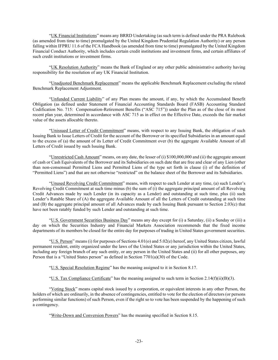 -23- “UK Financial Institutions” means any BRRD Undertaking (as such term is defined under the PRA Rulebook (as amended from time to time) promulgated by the United Kingdom Prudential Regulation Authority) or any person falling within IFPRU 11.6 of the FCA Handbook (as amended from time to time) promulgated by the United Kingdom Financial Conduct Authority, which includes certain credit institutions and investment firms, and certain affiliates of such credit institutions or investment firms. “UK Resolution Authority” means the Bank of England or any other public administrative authority having responsibility for the resolution of any UK Financial Institution. “Unadjusted Benchmark Replacement” means the applicable Benchmark Replacement excluding the related Benchmark Replacement Adjustment. “Unfunded Current Liability” of any Plan means the amount, if any, by which the Accumulated Benefit Obligation (as defined under Statement of Financial Accounting Standards Board (FASB) Accounting Standard Codification No. 715: Compensation-Retirement Benefits (“ASC 715”)) under the Plan as of the close of its most recent plan year, determined in accordance with ASC 715 as in effect on the Effective Date, exceeds the fair market value of the assets allocable thereto. “Unissued Letter of Credit Commitment” means, with respect to any Issuing Bank, the obligation of such Issuing Bank to Issue Letters of Credit for the account of the Borrower or its specified Subsidiaries in an amount equal to the excess of (a) the amount of its Letter of Credit Commitment over (b) the aggregate Available Amount of all Letters of Credit issued by such Issuing Bank. “Unrestricted Cash Amount” means, on any date, the lesser of (i) $100,000,000 and (ii) the aggregate amount of cash or Cash Equivalents of the Borrower and its Subsidiaries on such date that are free and clear of any Lien (other than non-consensual Permitted Liens and Permitted Liens of the type set forth in clause (i) of the definition of “Permitted Liens”) and that are not otherwise “restricted” on the balance sheet of the Borrower and its Subsidiaries. “Unused Revolving Credit Commitment” means, with respect to each Lender at any time, (a) such Lender’s Revolving Credit Commitment at such time minus (b) the sum of (i) the aggregate principal amount of all Revolving Credit Advances made by such Lender (in its capacity as a Lender) and outstanding at such time, plus (ii) such Lender’s Ratable Share of (A) the aggregate Available Amount of all the Letters of Credit outstanding at such time and (B) the aggregate principal amount of all Advances made by each Issuing Bank pursuant to Section 2.03(c) that have not been ratably funded by such Lender and outstanding at such time. “U.S. Government Securities Business Day” means any day except for (i) a Saturday, (ii) a Sunday or (iii) a day on which the Securities Industry and Financial Markets Association recommends that the fixed income departments of its members be closed for the entire day for purposes of trading in United States government securities. “U.S. Person” means (i) for purposes of Sections 4.01(o) and 5.02(e) hereof, any United States citizen, lawful permanent resident, entity organized under the laws of the United States or any jurisdiction within the United States, including any foreign branch of any such entity, or any person in the United States and (ii) for all other purposes, any Person that is a “United States person” as defined in Section 7701(a)(30) of the Code. “U.S. Special Resolution Regime” has the meaning assigned to it in Section 8.17. “U.S. Tax Compliance Certificate” has the meaning assigned to such term in Section 2.14(f)(ii)(B)(3). “Voting Stock” means capital stock issued by a corporation, or equivalent interests in any other Person, the holders of which are ordinarily, in the absence of contingencies, entitled to vote for the election of directors (or persons performing similar functions) of such Person, even if the right so to vote has been suspended by the happening of such a contingency. “Write-Down and Conversion Powers” has the meaning specified in Section 8.15.