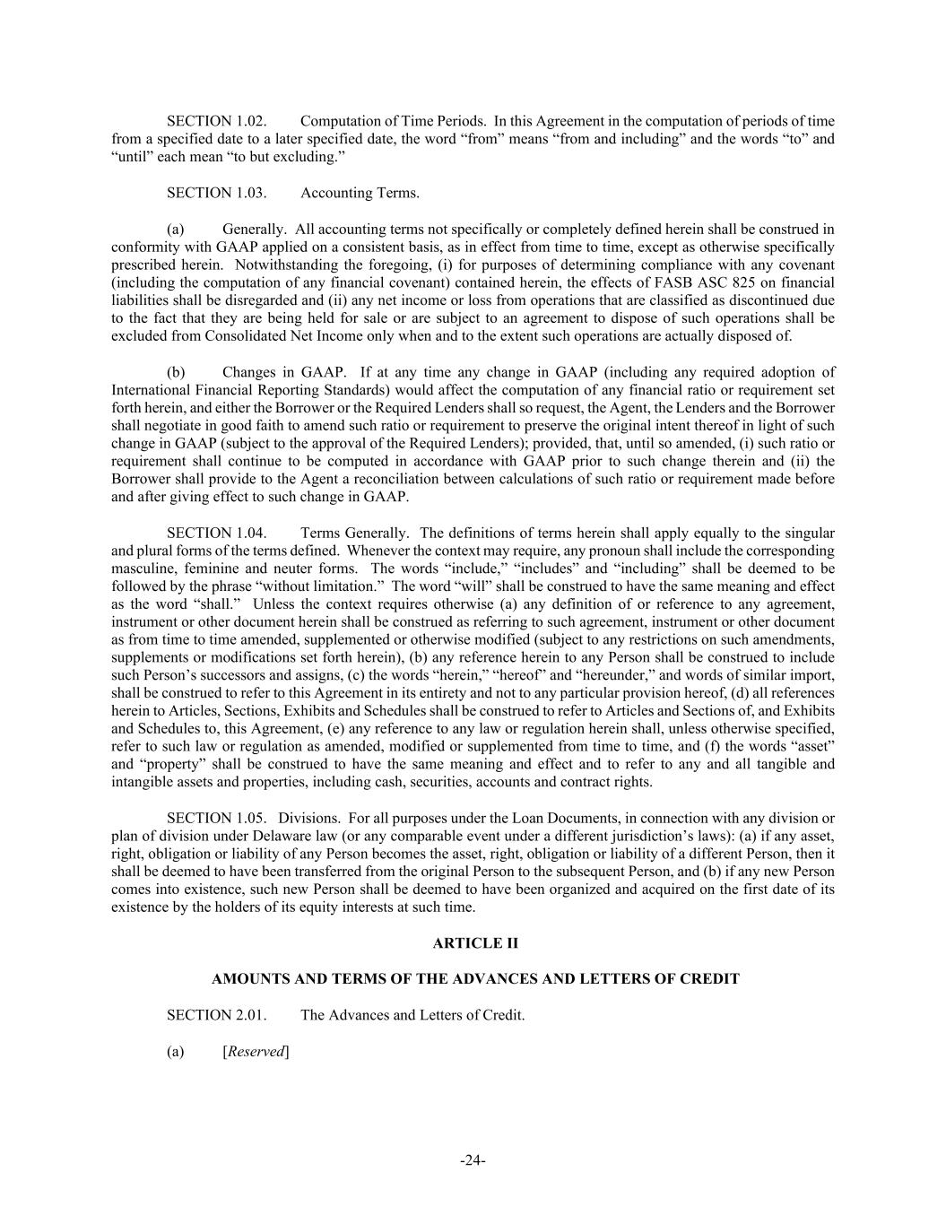 -24- SECTION 1.02. Computation of Time Periods. In this Agreement in the computation of periods of time from a specified date to a later specified date, the word “from” means “from and including” and the words “to” and “until” each mean “to but excluding.” SECTION 1.03. Accounting Terms. (a) Generally. All accounting terms not specifically or completely defined herein shall be construed in conformity with GAAP applied on a consistent basis, as in effect from time to time, except as otherwise specifically prescribed herein. Notwithstanding the foregoing, (i) for purposes of determining compliance with any covenant (including the computation of any financial covenant) contained herein, the effects of FASB ASC 825 on financial liabilities shall be disregarded and (ii) any net income or loss from operations that are classified as discontinued due to the fact that they are being held for sale or are subject to an agreement to dispose of such operations shall be excluded from Consolidated Net Income only when and to the extent such operations are actually disposed of. (b) Changes in GAAP. If at any time any change in GAAP (including any required adoption of International Financial Reporting Standards) would affect the computation of any financial ratio or requirement set forth herein, and either the Borrower or the Required Lenders shall so request, the Agent, the Lenders and the Borrower shall negotiate in good faith to amend such ratio or requirement to preserve the original intent thereof in light of such change in GAAP (subject to the approval of the Required Lenders); provided, that, until so amended, (i) such ratio or requirement shall continue to be computed in accordance with GAAP prior to such change therein and (ii) the Borrower shall provide to the Agent a reconciliation between calculations of such ratio or requirement made before and after giving effect to such change in GAAP. SECTION 1.04. Terms Generally. The definitions of terms herein shall apply equally to the singular and plural forms of the terms defined. Whenever the context may require, any pronoun shall include the corresponding masculine, feminine and neuter forms. The words “include,” “includes” and “including” shall be deemed to be followed by the phrase “without limitation.” The word “will” shall be construed to have the same meaning and effect as the word “shall.” Unless the context requires otherwise (a) any definition of or reference to any agreement, instrument or other document herein shall be construed as referring to such agreement, instrument or other document as from time to time amended, supplemented or otherwise modified (subject to any restrictions on such amendments, supplements or modifications set forth herein), (b) any reference herein to any Person shall be construed to include such Person’s successors and assigns, (c) the words “herein,” “hereof” and “hereunder,” and words of similar import, shall be construed to refer to this Agreement in its entirety and not to any particular provision hereof, (d) all references herein to Articles, Sections, Exhibits and Schedules shall be construed to refer to Articles and Sections of, and Exhibits and Schedules to, this Agreement, (e) any reference to any law or regulation herein shall, unless otherwise specified, refer to such law or regulation as amended, modified or supplemented from time to time, and (f) the words “asset” and “property” shall be construed to have the same meaning and effect and to refer to any and all tangible and intangible assets and properties, including cash, securities, accounts and contract rights. SECTION 1.05. Divisions. For all purposes under the Loan Documents, in connection with any division or plan of division under Delaware law (or any comparable event under a different jurisdiction’s laws): (a) if any asset, right, obligation or liability of any Person becomes the asset, right, obligation or liability of a different Person, then it shall be deemed to have been transferred from the original Person to the subsequent Person, and (b) if any new Person comes into existence, such new Person shall be deemed to have been organized and acquired on the first date of its existence by the holders of its equity interests at such time. ARTICLE II AMOUNTS AND TERMS OF THE ADVANCES AND LETTERS OF CREDIT SECTION 2.01. The Advances and Letters of Credit. (a) [Reserved]