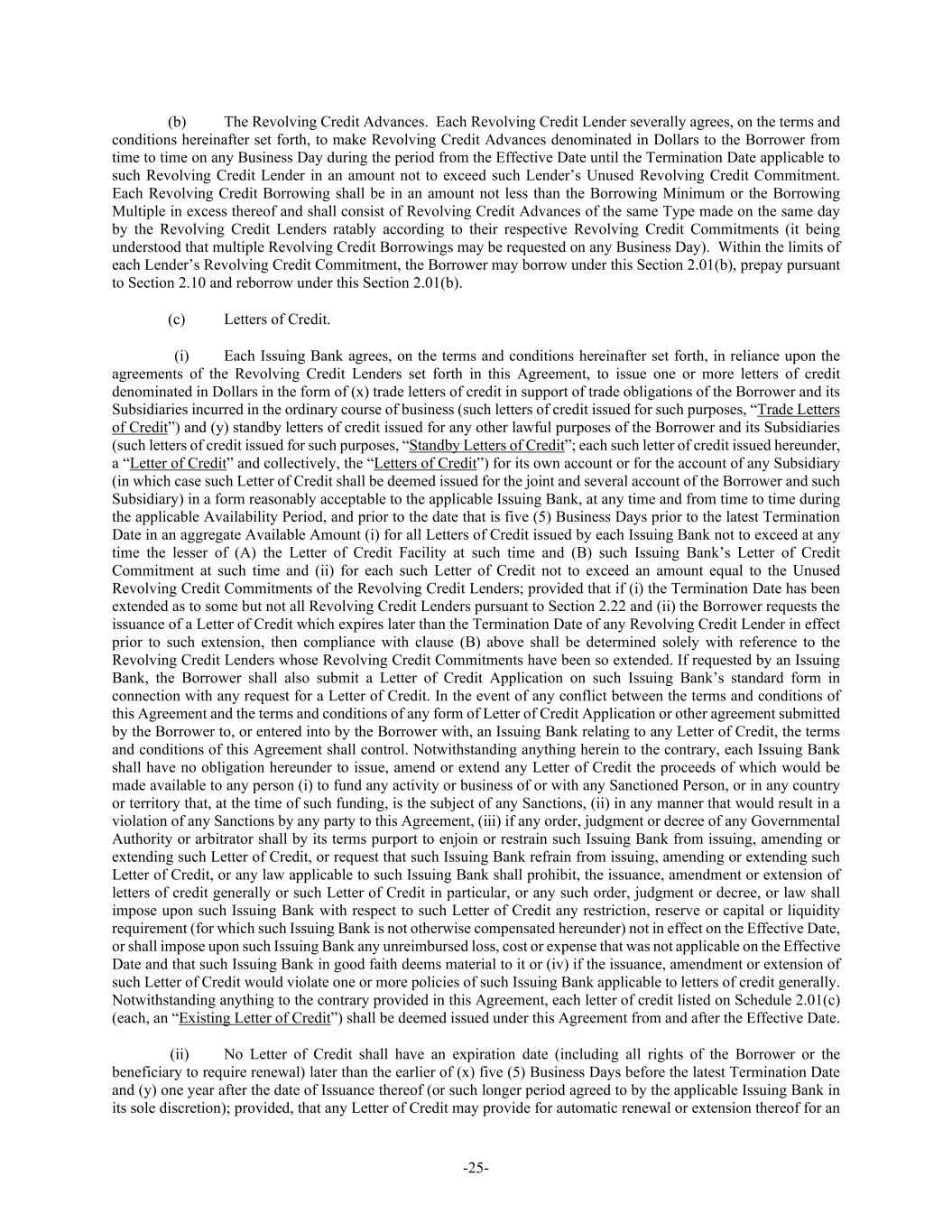 -25- (b) The Revolving Credit Advances. Each Revolving Credit Lender severally agrees, on the terms and conditions hereinafter set forth, to make Revolving Credit Advances denominated in Dollars to the Borrower from time to time on any Business Day during the period from the Effective Date until the Termination Date applicable to such Revolving Credit Lender in an amount not to exceed such Lender’s Unused Revolving Credit Commitment. Each Revolving Credit Borrowing shall be in an amount not less than the Borrowing Minimum or the Borrowing Multiple in excess thereof and shall consist of Revolving Credit Advances of the same Type made on the same day by the Revolving Credit Lenders ratably according to their respective Revolving Credit Commitments (it being understood that multiple Revolving Credit Borrowings may be requested on any Business Day). Within the limits of each Lender’s Revolving Credit Commitment, the Borrower may borrow under this Section 2.01(b), prepay pursuant to Section 2.10 and reborrow under this Section 2.01(b). (c) Letters of Credit. (i) Each Issuing Bank agrees, on the terms and conditions hereinafter set forth, in reliance upon the agreements of the Revolving Credit Lenders set forth in this Agreement, to issue one or more letters of credit denominated in Dollars in the form of (x) trade letters of credit in support of trade obligations of the Borrower and its Subsidiaries incurred in the ordinary course of business (such letters of credit issued for such purposes, “Trade Letters of Credit”) and (y) standby letters of credit issued for any other lawful purposes of the Borrower and its Subsidiaries (such letters of credit issued for such purposes, “Standby Letters of Credit”; each such letter of credit issued hereunder, a “Letter of Credit” and collectively, the “Letters of Credit”) for its own account or for the account of any Subsidiary (in which case such Letter of Credit shall be deemed issued for the joint and several account of the Borrower and such Subsidiary) in a form reasonably acceptable to the applicable Issuing Bank, at any time and from time to time during the applicable Availability Period, and prior to the date that is five (5) Business Days prior to the latest Termination Date in an aggregate Available Amount (i) for all Letters of Credit issued by each Issuing Bank not to exceed at any time the lesser of (A) the Letter of Credit Facility at such time and (B) such Issuing Bank’s Letter of Credit Commitment at such time and (ii) for each such Letter of Credit not to exceed an amount equal to the Unused Revolving Credit Commitments of the Revolving Credit Lenders; provided that if (i) the Termination Date has been extended as to some but not all Revolving Credit Lenders pursuant to Section 2.22 and (ii) the Borrower requests the issuance of a Letter of Credit which expires later than the Termination Date of any Revolving Credit Lender in effect prior to such extension, then compliance with clause (B) above shall be determined solely with reference to the Revolving Credit Lenders whose Revolving Credit Commitments have been so extended. If requested by an Issuing Bank, the Borrower shall also submit a Letter of Credit Application on such Issuing Bank’s standard form in connection with any request for a Letter of Credit. In the event of any conflict between the terms and conditions of this Agreement and the terms and conditions of any form of Letter of Credit Application or other agreement submitted by the Borrower to, or entered into by the Borrower with, an Issuing Bank relating to any Letter of Credit, the terms and conditions of this Agreement shall control. Notwithstanding anything herein to the contrary, each Issuing Bank shall have no obligation hereunder to issue, amend or extend any Letter of Credit the proceeds of which would be made available to any person (i) to fund any activity or business of or with any Sanctioned Person, or in any country or territory that, at the time of such funding, is the subject of any Sanctions, (ii) in any manner that would result in a violation of any Sanctions by any party to this Agreement, (iii) if any order, judgment or decree of any Governmental Authority or arbitrator shall by its terms purport to enjoin or restrain such Issuing Bank from issuing, amending or extending such Letter of Credit, or request that such Issuing Bank refrain from issuing, amending or extending such Letter of Credit, or any law applicable to such Issuing Bank shall prohibit, the issuance, amendment or extension of letters of credit generally or such Letter of Credit in particular, or any such order, judgment or decree, or law shall impose upon such Issuing Bank with respect to such Letter of Credit any restriction, reserve or capital or liquidity requirement (for which such Issuing Bank is not otherwise compensated hereunder) not in effect on the Effective Date, or shall impose upon such Issuing Bank any unreimbursed loss, cost or expense that was not applicable on the Effective Date and that such Issuing Bank in good faith deems material to it or (iv) if the issuance, amendment or extension of such Letter of Credit would violate one or more policies of such Issuing Bank applicable to letters of credit generally. Notwithstanding anything to the contrary provided in this Agreement, each letter of credit listed on Schedule 2.01(c) (each, an “Existing Letter of Credit”) shall be deemed issued under this Agreement from and after the Effective Date. (ii) No Letter of Credit shall have an expiration date (including all rights of the Borrower or the beneficiary to require renewal) later than the earlier of (x) five (5) Business Days before the latest Termination Date and (y) one year after the date of Issuance thereof (or such longer period agreed to by the applicable Issuing Bank in its sole discretion); provided, that any Letter of Credit may provide for automatic renewal or extension thereof for an