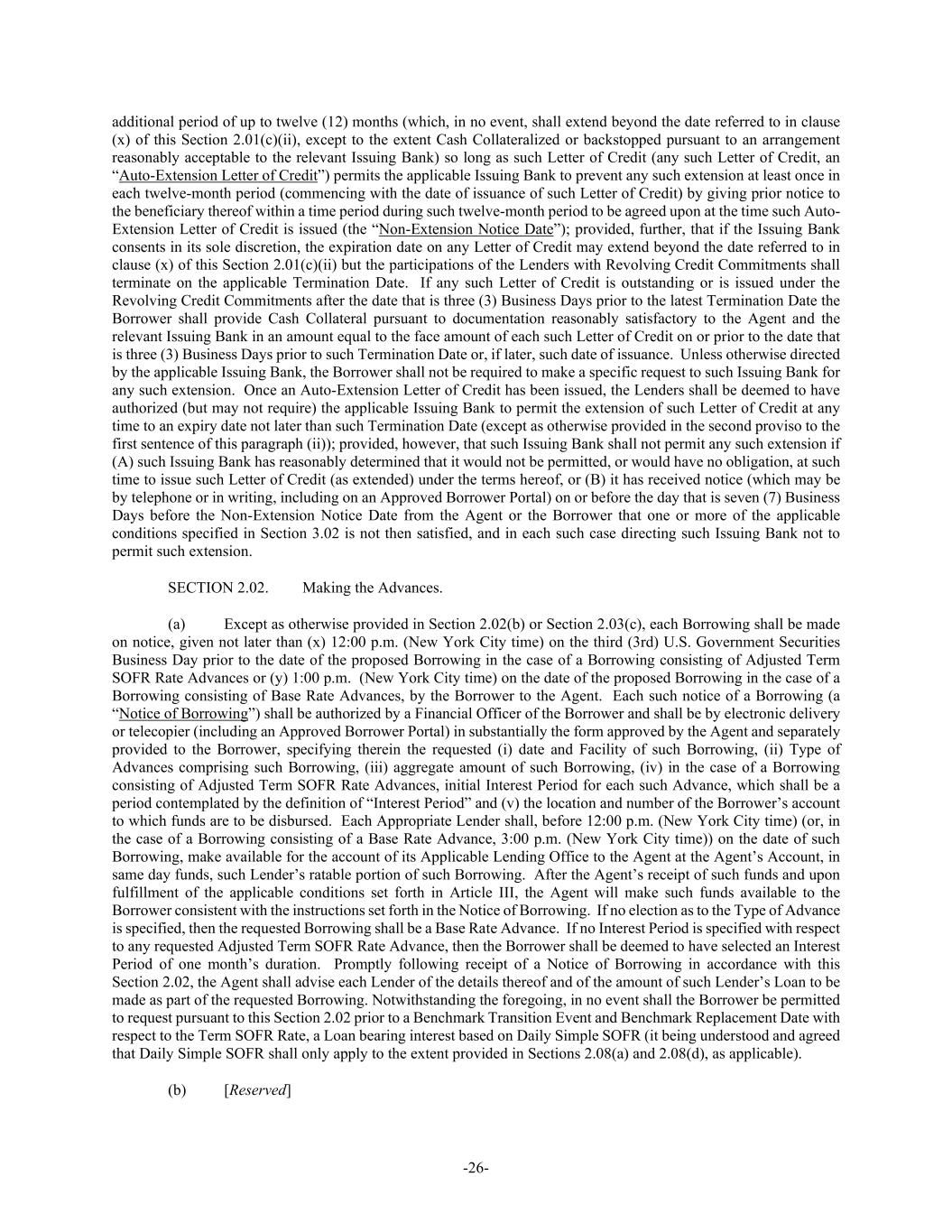 -26- additional period of up to twelve (12) months (which, in no event, shall extend beyond the date referred to in clause (x) of this Section 2.01(c)(ii), except to the extent Cash Collateralized or backstopped pursuant to an arrangement reasonably acceptable to the relevant Issuing Bank) so long as such Letter of Credit (any such Letter of Credit, an “Auto-Extension Letter of Credit”) permits the applicable Issuing Bank to prevent any such extension at least once in each twelve-month period (commencing with the date of issuance of such Letter of Credit) by giving prior notice to the beneficiary thereof within a time period during such twelve-month period to be agreed upon at the time such Auto- Extension Letter of Credit is issued (the “Non-Extension Notice Date”); provided, further, that if the Issuing Bank consents in its sole discretion, the expiration date on any Letter of Credit may extend beyond the date referred to in clause (x) of this Section 2.01(c)(ii) but the participations of the Lenders with Revolving Credit Commitments shall terminate on the applicable Termination Date. If any such Letter of Credit is outstanding or is issued under the Revolving Credit Commitments after the date that is three (3) Business Days prior to the latest Termination Date the Borrower shall provide Cash Collateral pursuant to documentation reasonably satisfactory to the Agent and the relevant Issuing Bank in an amount equal to the face amount of each such Letter of Credit on or prior to the date that is three (3) Business Days prior to such Termination Date or, if later, such date of issuance. Unless otherwise directed by the applicable Issuing Bank, the Borrower shall not be required to make a specific request to such Issuing Bank for any such extension. Once an Auto-Extension Letter of Credit has been issued, the Lenders shall be deemed to have authorized (but may not require) the applicable Issuing Bank to permit the extension of such Letter of Credit at any time to an expiry date not later than such Termination Date (except as otherwise provided in the second proviso to the first sentence of this paragraph (ii)); provided, however, that such Issuing Bank shall not permit any such extension if (A) such Issuing Bank has reasonably determined that it would not be permitted, or would have no obligation, at such time to issue such Letter of Credit (as extended) under the terms hereof, or (B) it has received notice (which may be by telephone or in writing, including on an Approved Borrower Portal) on or before the day that is seven (7) Business Days before the Non-Extension Notice Date from the Agent or the Borrower that one or more of the applicable conditions specified in Section 3.02 is not then satisfied, and in each such case directing such Issuing Bank not to permit such extension. SECTION 2.02. Making the Advances. (a) Except as otherwise provided in Section 2.02(b) or Section 2.03(c), each Borrowing shall be made on notice, given not later than (x) 12:00 p.m. (New York City time) on the third (3rd) U.S. Government Securities Business Day prior to the date of the proposed Borrowing in the case of a Borrowing consisting of Adjusted Term SOFR Rate Advances or (y) 1:00 p.m. (New York City time) on the date of the proposed Borrowing in the case of a Borrowing consisting of Base Rate Advances, by the Borrower to the Agent. Each such notice of a Borrowing (a “Notice of Borrowing”) shall be authorized by a Financial Officer of the Borrower and shall be by electronic delivery or telecopier (including an Approved Borrower Portal) in substantially the form approved by the Agent and separately provided to the Borrower, specifying therein the requested (i) date and Facility of such Borrowing, (ii) Type of Advances comprising such Borrowing, (iii) aggregate amount of such Borrowing, (iv) in the case of a Borrowing consisting of Adjusted Term SOFR Rate Advances, initial Interest Period for each such Advance, which shall be a period contemplated by the definition of “Interest Period” and (v) the location and number of the Borrower’s account to which funds are to be disbursed. Each Appropriate Lender shall, before 12:00 p.m. (New York City time) (or, in the case of a Borrowing consisting of a Base Rate Advance, 3:00 p.m. (New York City time)) on the date of such Borrowing, make available for the account of its Applicable Lending Office to the Agent at the Agent’s Account, in same day funds, such Lender’s ratable portion of such Borrowing. After the Agent’s receipt of such funds and upon fulfillment of the applicable conditions set forth in Article III, the Agent will make such funds available to the Borrower consistent with the instructions set forth in the Notice of Borrowing. If no election as to the Type of Advance is specified, then the requested Borrowing shall be a Base Rate Advance. If no Interest Period is specified with respect to any requested Adjusted Term SOFR Rate Advance, then the Borrower shall be deemed to have selected an Interest Period of one month’s duration. Promptly following receipt of a Notice of Borrowing in accordance with this Section 2.02, the Agent shall advise each Lender of the details thereof and of the amount of such Lender’s Loan to be made as part of the requested Borrowing. Notwithstanding the foregoing, in no event shall the Borrower be permitted to request pursuant to this Section 2.02 prior to a Benchmark Transition Event and Benchmark Replacement Date with respect to the Term SOFR Rate, a Loan bearing interest based on Daily Simple SOFR (it being understood and agreed that Daily Simple SOFR shall only apply to the extent provided in Sections 2.08(a) and 2.08(d), as applicable). (b) [Reserved]