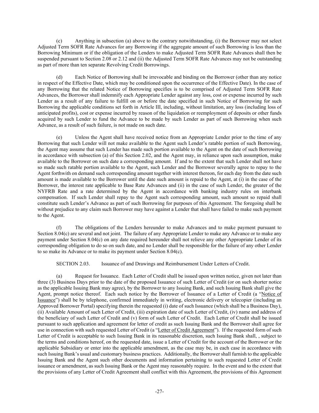 -27- (c) Anything in subsection (a) above to the contrary notwithstanding, (i) the Borrower may not select Adjusted Term SOFR Rate Advances for any Borrowing if the aggregate amount of such Borrowing is less than the Borrowing Minimum or if the obligation of the Lenders to make Adjusted Term SOFR Rate Advances shall then be suspended pursuant to Section 2.08 or 2.12 and (ii) the Adjusted Term SOFR Rate Advances may not be outstanding as part of more than ten separate Revolving Credit Borrowings. (d) Each Notice of Borrowing shall be irrevocable and binding on the Borrower (other than any notice in respect of the Effective Date, which may be conditioned upon the occurrence of the Effective Date). In the case of any Borrowing that the related Notice of Borrowing specifies is to be comprised of Adjusted Term SOFR Rate Advances, the Borrower shall indemnify each Appropriate Lender against any loss, cost or expense incurred by such Lender as a result of any failure to fulfill on or before the date specified in such Notice of Borrowing for such Borrowing the applicable conditions set forth in Article III, including, without limitation, any loss (including loss of anticipated profits), cost or expense incurred by reason of the liquidation or reemployment of deposits or other funds acquired by such Lender to fund the Advance to be made by such Lender as part of such Borrowing when such Advance, as a result of such failure, is not made on such date. (e) Unless the Agent shall have received notice from an Appropriate Lender prior to the time of any Borrowing that such Lender will not make available to the Agent such Lender’s ratable portion of such Borrowing, the Agent may assume that such Lender has made such portion available to the Agent on the date of such Borrowing in accordance with subsection (a) of this Section 2.02, and the Agent may, in reliance upon such assumption, make available to the Borrower on such date a corresponding amount. If and to the extent that such Lender shall not have so made such ratable portion available to the Agent, such Lender and the Borrower severally agree to repay to the Agent forthwith on demand such corresponding amount together with interest thereon, for each day from the date such amount is made available to the Borrower until the date such amount is repaid to the Agent, at (i) in the case of the Borrower, the interest rate applicable to Base Rate Advances and (ii) in the case of such Lender, the greater of the NYFRB Rate and a rate determined by the Agent in accordance with banking industry rules on interbank compensation. If such Lender shall repay to the Agent such corresponding amount, such amount so repaid shall constitute such Lender’s Advance as part of such Borrowing for purposes of this Agreement. The foregoing shall be without prejudice to any claim such Borrower may have against a Lender that shall have failed to make such payment to the Agent. (f) The obligations of the Lenders hereunder to make Advances and to make payment pursuant to Section 8.04(c) are several and not joint. The failure of any Appropriate Lender to make any Advance or to make any payment under Section 8.04(c) on any date required hereunder shall not relieve any other Appropriate Lender of its corresponding obligation to do so on such date, and no Lender shall be responsible for the failure of any other Lender to so make its Advance or to make its payment under Section 8.04(c). SECTION 2.03. Issuance of and Drawings and Reimbursement Under Letters of Credit. (a) Request for Issuance. Each Letter of Credit shall be issued upon written notice, given not later than three (3) Business Days prior to the date of the proposed Issuance of such Letter of Credit (or on such shorter notice as the applicable Issuing Bank may agree), by the Borrower to any Issuing Bank, and such Issuing Bank shall give the Agent, prompt notice thereof. Each such notice by the Borrower of Issuance of a Letter of Credit (a “Notice of Issuance”) shall be by telephone, confirmed immediately in writing, electronic delivery or telecopier (including an Approved Borrower Portal) specifying therein the requested (i) date of such Issuance (which shall be a Business Day), (ii) Available Amount of such Letter of Credit, (iii) expiration date of such Letter of Credit, (iv) name and address of the beneficiary of such Letter of Credit and (v) form of such Letter of Credit. Each Letter of Credit shall be issued pursuant to such application and agreement for letter of credit as such Issuing Bank and the Borrower shall agree for use in connection with such requested Letter of Credit (a “Letter of Credit Agreement”). If the requested form of such Letter of Credit is acceptable to such Issuing Bank in its reasonable discretion, such Issuing Bank shall, , subject to the terms and conditions hereof, on the requested date, issue a Letter of Credit for the account of the Borrower or the applicable Subsidiary or enter into the applicable amendment, as the case may be, in each case in accordance with such Issuing Bank’s usual and customary business practices. Additionally, the Borrower shall furnish to the applicable Issuing Bank and the Agent such other documents and information pertaining to such requested Letter of Credit issuance or amendment, as such Issuing Bank or the Agent may reasonably require. In the event and to the extent that the provisions of any Letter of Credit Agreement shall conflict with this Agreement, the provisions of this Agreement