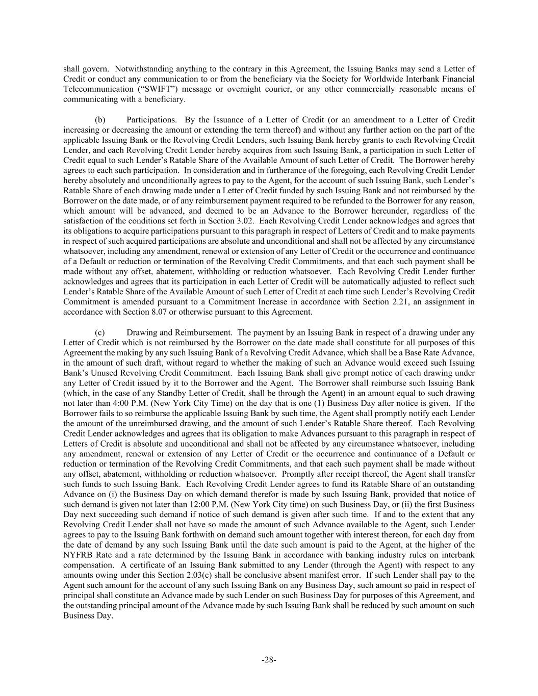 -28- shall govern. Notwithstanding anything to the contrary in this Agreement, the Issuing Banks may send a Letter of Credit or conduct any communication to or from the beneficiary via the Society for Worldwide Interbank Financial Telecommunication (“SWIFT”) message or overnight courier, or any other commercially reasonable means of communicating with a beneficiary. (b) Participations. By the Issuance of a Letter of Credit (or an amendment to a Letter of Credit increasing or decreasing the amount or extending the term thereof) and without any further action on the part of the applicable Issuing Bank or the Revolving Credit Lenders, such Issuing Bank hereby grants to each Revolving Credit Lender, and each Revolving Credit Lender hereby acquires from such Issuing Bank, a participation in such Letter of Credit equal to such Lender’s Ratable Share of the Available Amount of such Letter of Credit. The Borrower hereby agrees to each such participation. In consideration and in furtherance of the foregoing, each Revolving Credit Lender hereby absolutely and unconditionally agrees to pay to the Agent, for the account of such Issuing Bank, such Lender’s Ratable Share of each drawing made under a Letter of Credit funded by such Issuing Bank and not reimbursed by the Borrower on the date made, or of any reimbursement payment required to be refunded to the Borrower for any reason, which amount will be advanced, and deemed to be an Advance to the Borrower hereunder, regardless of the satisfaction of the conditions set forth in Section 3.02. Each Revolving Credit Lender acknowledges and agrees that its obligations to acquire participations pursuant to this paragraph in respect of Letters of Credit and to make payments in respect of such acquired participations are absolute and unconditional and shall not be affected by any circumstance whatsoever, including any amendment, renewal or extension of any Letter of Credit or the occurrence and continuance of a Default or reduction or termination of the Revolving Credit Commitments, and that each such payment shall be made without any offset, abatement, withholding or reduction whatsoever. Each Revolving Credit Lender further acknowledges and agrees that its participation in each Letter of Credit will be automatically adjusted to reflect such Lender’s Ratable Share of the Available Amount of such Letter of Credit at each time such Lender’s Revolving Credit Commitment is amended pursuant to a Commitment Increase in accordance with Section 2.21, an assignment in accordance with Section 8.07 or otherwise pursuant to this Agreement. (c) Drawing and Reimbursement. The payment by an Issuing Bank in respect of a drawing under any Letter of Credit which is not reimbursed by the Borrower on the date made shall constitute for all purposes of this Agreement the making by any such Issuing Bank of a Revolving Credit Advance, which shall be a Base Rate Advance, in the amount of such draft, without regard to whether the making of such an Advance would exceed such Issuing Bank’s Unused Revolving Credit Commitment. Each Issuing Bank shall give prompt notice of each drawing under any Letter of Credit issued by it to the Borrower and the Agent. The Borrower shall reimburse such Issuing Bank (which, in the case of any Standby Letter of Credit, shall be through the Agent) in an amount equal to such drawing not later than 4:00 P.M. (New York City Time) on the day that is one (1) Business Day after notice is given. If the Borrower fails to so reimburse the applicable Issuing Bank by such time, the Agent shall promptly notify each Lender the amount of the unreimbursed drawing, and the amount of such Lender’s Ratable Share thereof. Each Revolving Credit Lender acknowledges and agrees that its obligation to make Advances pursuant to this paragraph in respect of Letters of Credit is absolute and unconditional and shall not be affected by any circumstance whatsoever, including any amendment, renewal or extension of any Letter of Credit or the occurrence and continuance of a Default or reduction or termination of the Revolving Credit Commitments, and that each such payment shall be made without any offset, abatement, withholding or reduction whatsoever. Promptly after receipt thereof, the Agent shall transfer such funds to such Issuing Bank. Each Revolving Credit Lender agrees to fund its Ratable Share of an outstanding Advance on (i) the Business Day on which demand therefor is made by such Issuing Bank, provided that notice of such demand is given not later than 12:00 P.M. (New York City time) on such Business Day, or (ii) the first Business Day next succeeding such demand if notice of such demand is given after such time. If and to the extent that any Revolving Credit Lender shall not have so made the amount of such Advance available to the Agent, such Lender agrees to pay to the Issuing Bank forthwith on demand such amount together with interest thereon, for each day from the date of demand by any such Issuing Bank until the date such amount is paid to the Agent, at the higher of the NYFRB Rate and a rate determined by the Issuing Bank in accordance with banking industry rules on interbank compensation. A certificate of an Issuing Bank submitted to any Lender (through the Agent) with respect to any amounts owing under this Section 2.03(c) shall be conclusive absent manifest error. If such Lender shall pay to the Agent such amount for the account of any such Issuing Bank on any Business Day, such amount so paid in respect of principal shall constitute an Advance made by such Lender on such Business Day for purposes of this Agreement, and the outstanding principal amount of the Advance made by such Issuing Bank shall be reduced by such amount on such Business Day.