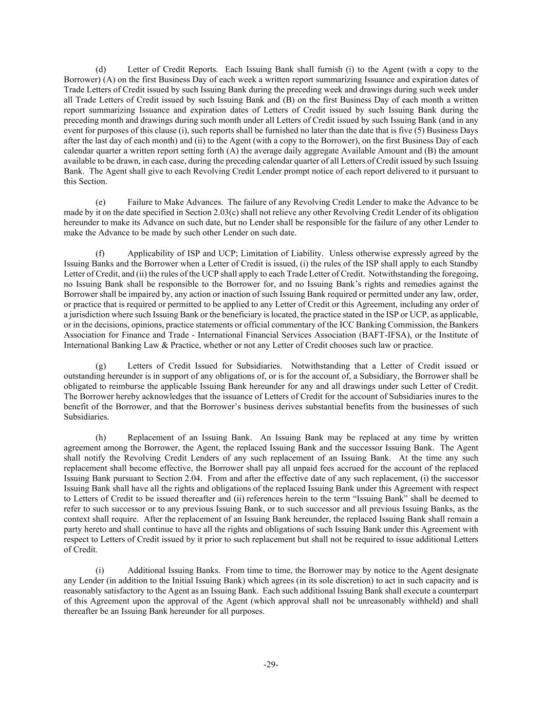 -29- (d) Letter of Credit Reports. Each Issuing Bank shall furnish (i) to the Agent (with a copy to the Borrower) (A) on the first Business Day of each week a written report summarizing Issuance and expiration dates of Trade Letters of Credit issued by such Issuing Bank during the preceding week and drawings during such week under all Trade Letters of Credit issued by such Issuing Bank and (B) on the first Business Day of each month a written report summarizing Issuance and expiration dates of Letters of Credit issued by such Issuing Bank during the preceding month and drawings during such month under all Letters of Credit issued by such Issuing Bank (and in any event for purposes of this clause (i), such reports shall be furnished no later than the date that is five (5) Business Days after the last day of each month) and (ii) to the Agent (with a copy to the Borrower), on the first Business Day of each calendar quarter a written report setting forth (A) the average daily aggregate Available Amount and (B) the amount available to be drawn, in each case, during the preceding calendar quarter of all Letters of Credit issued by such Issuing Bank. The Agent shall give to each Revolving Credit Lender prompt notice of each report delivered to it pursuant to this Section. (e) Failure to Make Advances. The failure of any Revolving Credit Lender to make the Advance to be made by it on the date specified in Section 2.03(c) shall not relieve any other Revolving Credit Lender of its obligation hereunder to make its Advance on such date, but no Lender shall be responsible for the failure of any other Lender to make the Advance to be made by such other Lender on such date. (f) Applicability of ISP and UCP; Limitation of Liability. Unless otherwise expressly agreed by the Issuing Banks and the Borrower when a Letter of Credit is issued, (i) the rules of the ISP shall apply to each Standby Letter of Credit, and (ii) the rules of the UCP shall apply to each Trade Letter of Credit. Notwithstanding the foregoing, no Issuing Bank shall be responsible to the Borrower for, and no Issuing Bank’s rights and remedies against the Borrower shall be impaired by, any action or inaction of such Issuing Bank required or permitted under any law, order, or practice that is required or permitted to be applied to any Letter of Credit or this Agreement, including any order of a jurisdiction where such Issuing Bank or the beneficiary is located, the practice stated in the ISP or UCP, as applicable, or in the decisions, opinions, practice statements or official commentary of the ICC Banking Commission, the Bankers Association for Finance and Trade - International Financial Services Association (BAFT-IFSA), or the Institute of International Banking Law & Practice, whether or not any Letter of Credit chooses such law or practice. (g) Letters of Credit Issued for Subsidiaries. Notwithstanding that a Letter of Credit issued or outstanding hereunder is in support of any obligations of, or is for the account of, a Subsidiary, the Borrower shall be obligated to reimburse the applicable Issuing Bank hereunder for any and all drawings under such Letter of Credit. The Borrower hereby acknowledges that the issuance of Letters of Credit for the account of Subsidiaries inures to the benefit of the Borrower, and that the Borrower’s business derives substantial benefits from the businesses of such Subsidiaries. (h) Replacement of an Issuing Bank. An Issuing Bank may be replaced at any time by written agreement among the Borrower, the Agent, the replaced Issuing Bank and the successor Issuing Bank. The Agent shall notify the Revolving Credit Lenders of any such replacement of an Issuing Bank. At the time any such replacement shall become effective, the Borrower shall pay all unpaid fees accrued for the account of the replaced Issuing Bank pursuant to Section 2.04. From and after the effective date of any such replacement, (i) the successor Issuing Bank shall have all the rights and obligations of the replaced Issuing Bank under this Agreement with respect to Letters of Credit to be issued thereafter and (ii) references herein to the term “Issuing Bank” shall be deemed to refer to such successor or to any previous Issuing Bank, or to such successor and all previous Issuing Banks, as the context shall require. After the replacement of an Issuing Bank hereunder, the replaced Issuing Bank shall remain a party hereto and shall continue to have all the rights and obligations of such Issuing Bank under this Agreement with respect to Letters of Credit issued by it prior to such replacement but shall not be required to issue additional Letters of Credit. (i) Additional Issuing Banks. From time to time, the Borrower may by notice to the Agent designate any Lender (in addition to the Initial Issuing Bank) which agrees (in its sole discretion) to act in such capacity and is reasonably satisfactory to the Agent as an Issuing Bank. Each such additional Issuing Bank shall execute a counterpart of this Agreement upon the approval of the Agent (which approval shall not be unreasonably withheld) and shall thereafter be an Issuing Bank hereunder for all purposes.