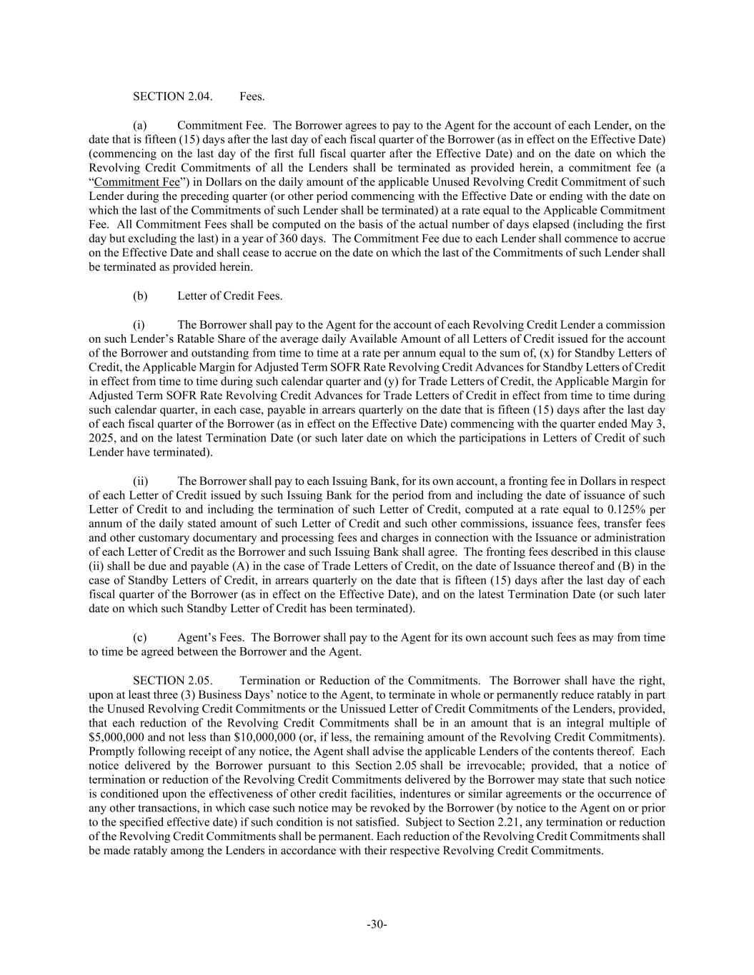 -30- SECTION 2.04. Fees. (a) Commitment Fee. The Borrower agrees to pay to the Agent for the account of each Lender, on the date that is fifteen (15) days after the last day of each fiscal quarter of the Borrower (as in effect on the Effective Date) (commencing on the last day of the first full fiscal quarter after the Effective Date) and on the date on which the Revolving Credit Commitments of all the Lenders shall be terminated as provided herein, a commitment fee (a “Commitment Fee”) in Dollars on the daily amount of the applicable Unused Revolving Credit Commitment of such Lender during the preceding quarter (or other period commencing with the Effective Date or ending with the date on which the last of the Commitments of such Lender shall be terminated) at a rate equal to the Applicable Commitment Fee. All Commitment Fees shall be computed on the basis of the actual number of days elapsed (including the first day but excluding the last) in a year of 360 days. The Commitment Fee due to each Lender shall commence to accrue on the Effective Date and shall cease to accrue on the date on which the last of the Commitments of such Lender shall be terminated as provided herein. (b) Letter of Credit Fees. (i) The Borrower shall pay to the Agent for the account of each Revolving Credit Lender a commission on such Lender’s Ratable Share of the average daily Available Amount of all Letters of Credit issued for the account of the Borrower and outstanding from time to time at a rate per annum equal to the sum of, (x) for Standby Letters of Credit, the Applicable Margin for Adjusted Term SOFR Rate Revolving Credit Advances for Standby Letters of Credit in effect from time to time during such calendar quarter and (y) for Trade Letters of Credit, the Applicable Margin for Adjusted Term SOFR Rate Revolving Credit Advances for Trade Letters of Credit in effect from time to time during such calendar quarter, in each case, payable in arrears quarterly on the date that is fifteen (15) days after the last day of each fiscal quarter of the Borrower (as in effect on the Effective Date) commencing with the quarter ended May 3, 2025, and on the latest Termination Date (or such later date on which the participations in Letters of Credit of such Lender have terminated). (ii) The Borrower shall pay to each Issuing Bank, for its own account, a fronting fee in Dollars in respect of each Letter of Credit issued by such Issuing Bank for the period from and including the date of issuance of such Letter of Credit to and including the termination of such Letter of Credit, computed at a rate equal to 0.125% per annum of the daily stated amount of such Letter of Credit and such other commissions, issuance fees, transfer fees and other customary documentary and processing fees and charges in connection with the Issuance or administration of each Letter of Credit as the Borrower and such Issuing Bank shall agree. The fronting fees described in this clause (ii) shall be due and payable (A) in the case of Trade Letters of Credit, on the date of Issuance thereof and (B) in the case of Standby Letters of Credit, in arrears quarterly on the date that is fifteen (15) days after the last day of each fiscal quarter of the Borrower (as in effect on the Effective Date), and on the latest Termination Date (or such later date on which such Standby Letter of Credit has been terminated). (c) Agent’s Fees. The Borrower shall pay to the Agent for its own account such fees as may from time to time be agreed between the Borrower and the Agent. SECTION 2.05. Termination or Reduction of the Commitments. The Borrower shall have the right, upon at least three (3) Business Days’ notice to the Agent, to terminate in whole or permanently reduce ratably in part the Unused Revolving Credit Commitments or the Unissued Letter of Credit Commitments of the Lenders, provided, that each reduction of the Revolving Credit Commitments shall be in an amount that is an integral multiple of $5,000,000 and not less than $10,000,000 (or, if less, the remaining amount of the Revolving Credit Commitments). Promptly following receipt of any notice, the Agent shall advise the applicable Lenders of the contents thereof. Each notice delivered by the Borrower pursuant to this Section 2.05 shall be irrevocable; provided, that a notice of termination or reduction of the Revolving Credit Commitments delivered by the Borrower may state that such notice is conditioned upon the effectiveness of other credit facilities, indentures or similar agreements or the occurrence of any other transactions, in which case such notice may be revoked by the Borrower (by notice to the Agent on or prior to the specified effective date) if such condition is not satisfied. Subject to Section 2.21, any termination or reduction of the Revolving Credit Commitments shall be permanent. Each reduction of the Revolving Credit Commitments shall be made ratably among the Lenders in accordance with their respective Revolving Credit Commitments.