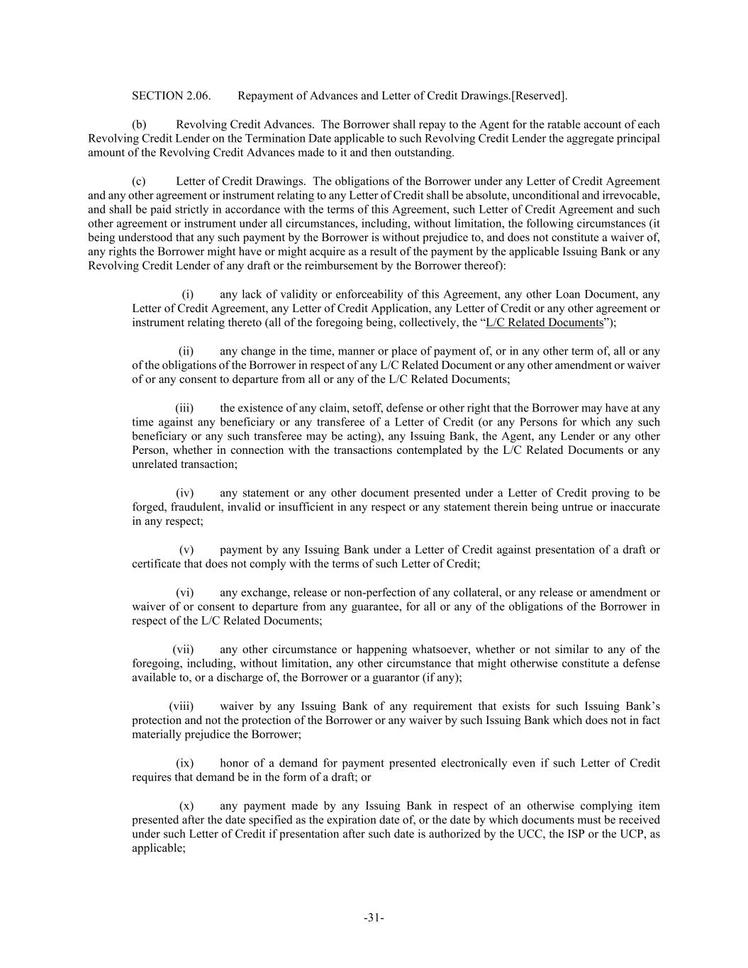 -31- SECTION 2.06. Repayment of Advances and Letter of Credit Drawings.[Reserved]. (b) Revolving Credit Advances. The Borrower shall repay to the Agent for the ratable account of each Revolving Credit Lender on the Termination Date applicable to such Revolving Credit Lender the aggregate principal amount of the Revolving Credit Advances made to it and then outstanding. (c) Letter of Credit Drawings. The obligations of the Borrower under any Letter of Credit Agreement and any other agreement or instrument relating to any Letter of Credit shall be absolute, unconditional and irrevocable, and shall be paid strictly in accordance with the terms of this Agreement, such Letter of Credit Agreement and such other agreement or instrument under all circumstances, including, without limitation, the following circumstances (it being understood that any such payment by the Borrower is without prejudice to, and does not constitute a waiver of, any rights the Borrower might have or might acquire as a result of the payment by the applicable Issuing Bank or any Revolving Credit Lender of any draft or the reimbursement by the Borrower thereof): (i) any lack of validity or enforceability of this Agreement, any other Loan Document, any Letter of Credit Agreement, any Letter of Credit Application, any Letter of Credit or any other agreement or instrument relating thereto (all of the foregoing being, collectively, the “L/C Related Documents”); (ii) any change in the time, manner or place of payment of, or in any other term of, all or any of the obligations of the Borrower in respect of any L/C Related Document or any other amendment or waiver of or any consent to departure from all or any of the L/C Related Documents; (iii) the existence of any claim, setoff, defense or other right that the Borrower may have at any time against any beneficiary or any transferee of a Letter of Credit (or any Persons for which any such beneficiary or any such transferee may be acting), any Issuing Bank, the Agent, any Lender or any other Person, whether in connection with the transactions contemplated by the L/C Related Documents or any unrelated transaction; (iv) any statement or any other document presented under a Letter of Credit proving to be forged, fraudulent, invalid or insufficient in any respect or any statement therein being untrue or inaccurate in any respect; (v) payment by any Issuing Bank under a Letter of Credit against presentation of a draft or certificate that does not comply with the terms of such Letter of Credit; (vi) any exchange, release or non-perfection of any collateral, or any release or amendment or waiver of or consent to departure from any guarantee, for all or any of the obligations of the Borrower in respect of the L/C Related Documents; (vii) any other circumstance or happening whatsoever, whether or not similar to any of the foregoing, including, without limitation, any other circumstance that might otherwise constitute a defense available to, or a discharge of, the Borrower or a guarantor (if any); (viii) waiver by any Issuing Bank of any requirement that exists for such Issuing Bank’s protection and not the protection of the Borrower or any waiver by such Issuing Bank which does not in fact materially prejudice the Borrower; (ix) honor of a demand for payment presented electronically even if such Letter of Credit requires that demand be in the form of a draft; or (x) any payment made by any Issuing Bank in respect of an otherwise complying item presented after the date specified as the expiration date of, or the date by which documents must be received under such Letter of Credit if presentation after such date is authorized by the UCC, the ISP or the UCP, as applicable;