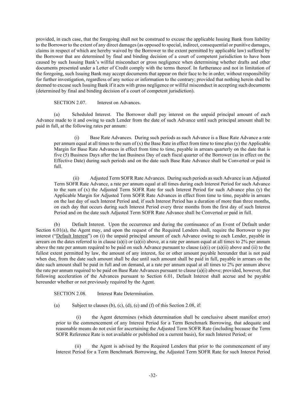 -32- provided, in each case, that the foregoing shall not be construed to excuse the applicable Issuing Bank from liability to the Borrower to the extent of any direct damages (as opposed to special, indirect, consequential or punitive damages, claims in respect of which are hereby waived by the Borrower to the extent permitted by applicable law) suffered by the Borrower that are determined by final and binding decision of a court of competent jurisdiction to have been caused by such Issuing Bank’s willful misconduct or gross negligence when determining whether drafts and other documents presented under a Letter of Credit comply with the terms thereof. In furtherance and not in limitation of the foregoing, such Issuing Bank may accept documents that appear on their face to be in order, without responsibility for further investigation, regardless of any notice or information to the contrary; provided that nothing herein shall be deemed to excuse such Issuing Bank if it acts with gross negligence or willful misconduct in accepting such documents (determined by final and binding decision of a court of competent jurisdiction). SECTION 2.07. Interest on Advances. (a) Scheduled Interest. The Borrower shall pay interest on the unpaid principal amount of each Advance made to it and owing to each Lender from the date of such Advance until such principal amount shall be paid in full, at the following rates per annum: (i) Base Rate Advances. During such periods as such Advance is a Base Rate Advance a rate per annum equal at all times to the sum of (x) the Base Rate in effect from time to time plus (y) the Applicable Margin for Base Rate Advances in effect from time to time, payable in arrears quarterly on the date that is five (5) Business Days after the last Business Day of each fiscal quarter of the Borrower (as in effect on the Effective Date) during such periods and on the date such Base Rate Advance shall be Converted or paid in full. (ii) Adjusted Term SOFR Rate Advances. During such periods as such Advance is an Adjusted Term SOFR Rate Advance, a rate per annum equal at all times during each Interest Period for such Advance to the sum of (x) the Adjusted Term SOFR Rate for such Interest Period for such Advance plus (y) the Applicable Margin for Adjusted Term SOFR Rate Advances in effect from time to time, payable in arrears on the last day of such Interest Period and, if such Interest Period has a duration of more than three months, on each day that occurs during such Interest Period every three months from the first day of such Interest Period and on the date such Adjusted Term SOFR Rate Advance shall be Converted or paid in full. (b) Default Interest. Upon the occurrence and during the continuance of an Event of Default under Section 6.01(a), the Agent may, and upon the request of the Required Lenders shall, require the Borrower to pay interest (“Default Interest”) on (i) the unpaid principal amount of each Advance owing to each Lender, payable in arrears on the dates referred to in clause (a)(i) or (a)(ii) above, at a rate per annum equal at all times to 2% per annum above the rate per annum required to be paid on such Advance pursuant to clause (a)(i) or (a)(ii) above and (ii) to the fullest extent permitted by law, the amount of any interest, fee or other amount payable hereunder that is not paid when due, from the date such amount shall be due until such amount shall be paid in full, payable in arrears on the date such amount shall be paid in full and on demand, at a rate per annum equal at all times to 2% per annum above the rate per annum required to be paid on Base Rate Advances pursuant to clause (a)(i) above; provided, however, that following acceleration of the Advances pursuant to Section 6.01, Default Interest shall accrue and be payable hereunder whether or not previously required by the Agent. SECTION 2.08. Interest Rate Determination. (a) Subject to clauses (b), (c), (d), (e) and (f) of this Section 2.08, if: (i) the Agent determines (which determination shall be conclusive absent manifest error) prior to the commencement of any Interest Period for a Term Benchmark Borrowing, that adequate and reasonable means do not exist for ascertaining the Adjusted Term SOFR Rate (including because the Term SOFR Reference Rate is not available or published on a current basis), for such Interest Period; or (ii) the Agent is advised by the Required Lenders that prior to the commencement of any Interest Period for a Term Benchmark Borrowing, the Adjusted Term SOFR Rate for such Interest Period