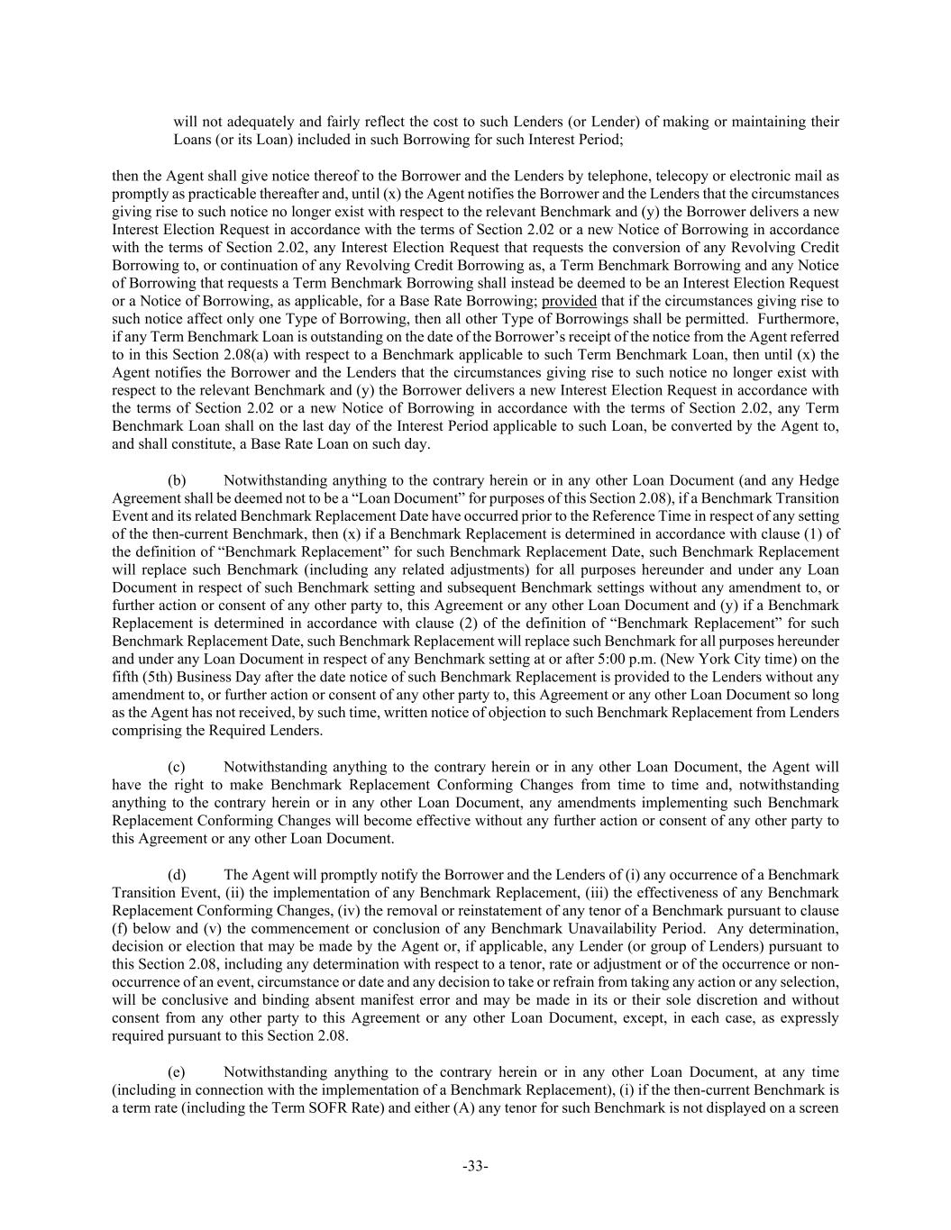 -33- will not adequately and fairly reflect the cost to such Lenders (or Lender) of making or maintaining their Loans (or its Loan) included in such Borrowing for such Interest Period; then the Agent shall give notice thereof to the Borrower and the Lenders by telephone, telecopy or electronic mail as promptly as practicable thereafter and, until (x) the Agent notifies the Borrower and the Lenders that the circumstances giving rise to such notice no longer exist with respect to the relevant Benchmark and (y) the Borrower delivers a new Interest Election Request in accordance with the terms of Section 2.02 or a new Notice of Borrowing in accordance with the terms of Section 2.02, any Interest Election Request that requests the conversion of any Revolving Credit Borrowing to, or continuation of any Revolving Credit Borrowing as, a Term Benchmark Borrowing and any Notice of Borrowing that requests a Term Benchmark Borrowing shall instead be deemed to be an Interest Election Request or a Notice of Borrowing, as applicable, for a Base Rate Borrowing; provided that if the circumstances giving rise to such notice affect only one Type of Borrowing, then all other Type of Borrowings shall be permitted. Furthermore, if any Term Benchmark Loan is outstanding on the date of the Borrower’s receipt of the notice from the Agent referred to in this Section 2.08(a) with respect to a Benchmark applicable to such Term Benchmark Loan, then until (x) the Agent notifies the Borrower and the Lenders that the circumstances giving rise to such notice no longer exist with respect to the relevant Benchmark and (y) the Borrower delivers a new Interest Election Request in accordance with the terms of Section 2.02 or a new Notice of Borrowing in accordance with the terms of Section 2.02, any Term Benchmark Loan shall on the last day of the Interest Period applicable to such Loan, be converted by the Agent to, and shall constitute, a Base Rate Loan on such day. (b) Notwithstanding anything to the contrary herein or in any other Loan Document (and any Hedge Agreement shall be deemed not to be a “Loan Document” for purposes of this Section 2.08), if a Benchmark Transition Event and its related Benchmark Replacement Date have occurred prior to the Reference Time in respect of any setting of the then-current Benchmark, then (x) if a Benchmark Replacement is determined in accordance with clause (1) of the definition of “Benchmark Replacement” for such Benchmark Replacement Date, such Benchmark Replacement will replace such Benchmark (including any related adjustments) for all purposes hereunder and under any Loan Document in respect of such Benchmark setting and subsequent Benchmark settings without any amendment to, or further action or consent of any other party to, this Agreement or any other Loan Document and (y) if a Benchmark Replacement is determined in accordance with clause (2) of the definition of “Benchmark Replacement” for such Benchmark Replacement Date, such Benchmark Replacement will replace such Benchmark for all purposes hereunder and under any Loan Document in respect of any Benchmark setting at or after 5:00 p.m. (New York City time) on the fifth (5th) Business Day after the date notice of such Benchmark Replacement is provided to the Lenders without any amendment to, or further action or consent of any other party to, this Agreement or any other Loan Document so long as the Agent has not received, by such time, written notice of objection to such Benchmark Replacement from Lenders comprising the Required Lenders. (c) Notwithstanding anything to the contrary herein or in any other Loan Document, the Agent will have the right to make Benchmark Replacement Conforming Changes from time to time and, notwithstanding anything to the contrary herein or in any other Loan Document, any amendments implementing such Benchmark Replacement Conforming Changes will become effective without any further action or consent of any other party to this Agreement or any other Loan Document. (d) The Agent will promptly notify the Borrower and the Lenders of (i) any occurrence of a Benchmark Transition Event, (ii) the implementation of any Benchmark Replacement, (iii) the effectiveness of any Benchmark Replacement Conforming Changes, (iv) the removal or reinstatement of any tenor of a Benchmark pursuant to clause (f) below and (v) the commencement or conclusion of any Benchmark Unavailability Period. Any determination, decision or election that may be made by the Agent or, if applicable, any Lender (or group of Lenders) pursuant to this Section 2.08, including any determination with respect to a tenor, rate or adjustment or of the occurrence or non- occurrence of an event, circumstance or date and any decision to take or refrain from taking any action or any selection, will be conclusive and binding absent manifest error and may be made in its or their sole discretion and without consent from any other party to this Agreement or any other Loan Document, except, in each case, as expressly required pursuant to this Section 2.08. (e) Notwithstanding anything to the contrary herein or in any other Loan Document, at any time (including in connection with the implementation of a Benchmark Replacement), (i) if the then-current Benchmark is a term rate (including the Term SOFR Rate) and either (A) any tenor for such Benchmark is not displayed on a screen