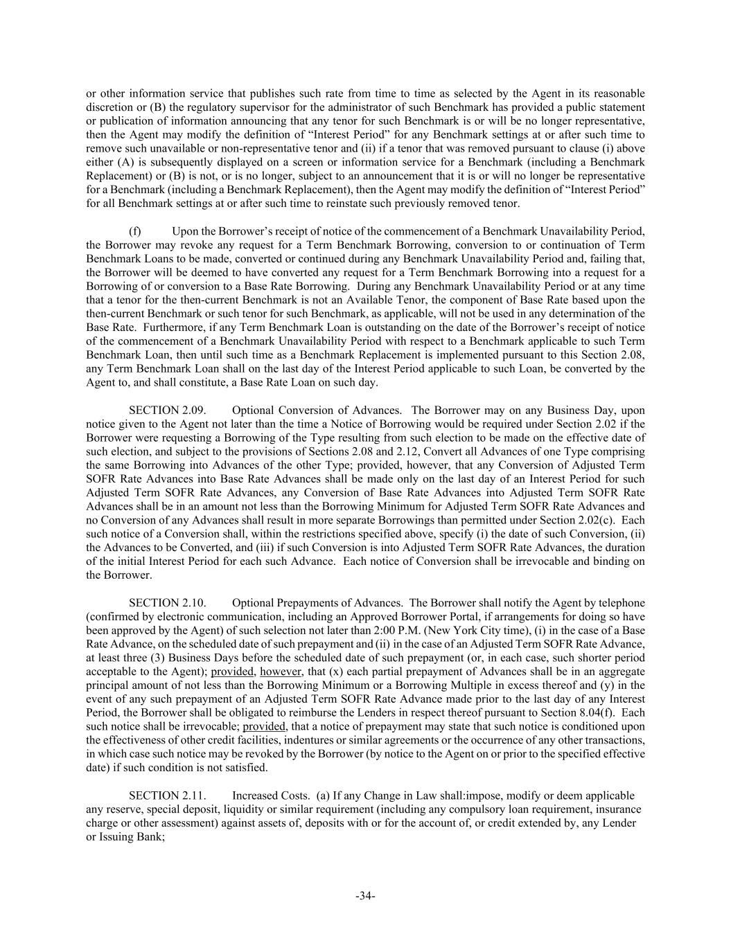 -34- or other information service that publishes such rate from time to time as selected by the Agent in its reasonable discretion or (B) the regulatory supervisor for the administrator of such Benchmark has provided a public statement or publication of information announcing that any tenor for such Benchmark is or will be no longer representative, then the Agent may modify the definition of “Interest Period” for any Benchmark settings at or after such time to remove such unavailable or non-representative tenor and (ii) if a tenor that was removed pursuant to clause (i) above either (A) is subsequently displayed on a screen or information service for a Benchmark (including a Benchmark Replacement) or (B) is not, or is no longer, subject to an announcement that it is or will no longer be representative for a Benchmark (including a Benchmark Replacement), then the Agent may modify the definition of “Interest Period” for all Benchmark settings at or after such time to reinstate such previously removed tenor. (f) Upon the Borrower’s receipt of notice of the commencement of a Benchmark Unavailability Period, the Borrower may revoke any request for a Term Benchmark Borrowing, conversion to or continuation of Term Benchmark Loans to be made, converted or continued during any Benchmark Unavailability Period and, failing that, the Borrower will be deemed to have converted any request for a Term Benchmark Borrowing into a request for a Borrowing of or conversion to a Base Rate Borrowing. During any Benchmark Unavailability Period or at any time that a tenor for the then-current Benchmark is not an Available Tenor, the component of Base Rate based upon the then-current Benchmark or such tenor for such Benchmark, as applicable, will not be used in any determination of the Base Rate. Furthermore, if any Term Benchmark Loan is outstanding on the date of the Borrower’s receipt of notice of the commencement of a Benchmark Unavailability Period with respect to a Benchmark applicable to such Term Benchmark Loan, then until such time as a Benchmark Replacement is implemented pursuant to this Section 2.08, any Term Benchmark Loan shall on the last day of the Interest Period applicable to such Loan, be converted by the Agent to, and shall constitute, a Base Rate Loan on such day. SECTION 2.09. Optional Conversion of Advances. The Borrower may on any Business Day, upon notice given to the Agent not later than the time a Notice of Borrowing would be required under Section 2.02 if the Borrower were requesting a Borrowing of the Type resulting from such election to be made on the effective date of such election, and subject to the provisions of Sections 2.08 and 2.12, Convert all Advances of one Type comprising the same Borrowing into Advances of the other Type; provided, however, that any Conversion of Adjusted Term SOFR Rate Advances into Base Rate Advances shall be made only on the last day of an Interest Period for such Adjusted Term SOFR Rate Advances, any Conversion of Base Rate Advances into Adjusted Term SOFR Rate Advances shall be in an amount not less than the Borrowing Minimum for Adjusted Term SOFR Rate Advances and no Conversion of any Advances shall result in more separate Borrowings than permitted under Section 2.02(c). Each such notice of a Conversion shall, within the restrictions specified above, specify (i) the date of such Conversion, (ii) the Advances to be Converted, and (iii) if such Conversion is into Adjusted Term SOFR Rate Advances, the duration of the initial Interest Period for each such Advance. Each notice of Conversion shall be irrevocable and binding on the Borrower. SECTION 2.10. Optional Prepayments of Advances. The Borrower shall notify the Agent by telephone (confirmed by electronic communication, including an Approved Borrower Portal, if arrangements for doing so have been approved by the Agent) of such selection not later than 2:00 P.M. (New York City time), (i) in the case of a Base Rate Advance, on the scheduled date of such prepayment and (ii) in the case of an Adjusted Term SOFR Rate Advance, at least three (3) Business Days before the scheduled date of such prepayment (or, in each case, such shorter period acceptable to the Agent); provided, however, that (x) each partial prepayment of Advances shall be in an aggregate principal amount of not less than the Borrowing Minimum or a Borrowing Multiple in excess thereof and (y) in the event of any such prepayment of an Adjusted Term SOFR Rate Advance made prior to the last day of any Interest Period, the Borrower shall be obligated to reimburse the Lenders in respect thereof pursuant to Section 8.04(f). Each such notice shall be irrevocable; provided, that a notice of prepayment may state that such notice is conditioned upon the effectiveness of other credit facilities, indentures or similar agreements or the occurrence of any other transactions, in which case such notice may be revoked by the Borrower (by notice to the Agent on or prior to the specified effective date) if such condition is not satisfied. SECTION 2.11. Increased Costs. (a) If any Change in Law shall:impose, modify or deem applicable any reserve, special deposit, liquidity or similar requirement (including any compulsory loan requirement, insurance charge or other assessment) against assets of, deposits with or for the account of, or credit extended by, any Lender or Issuing Bank;