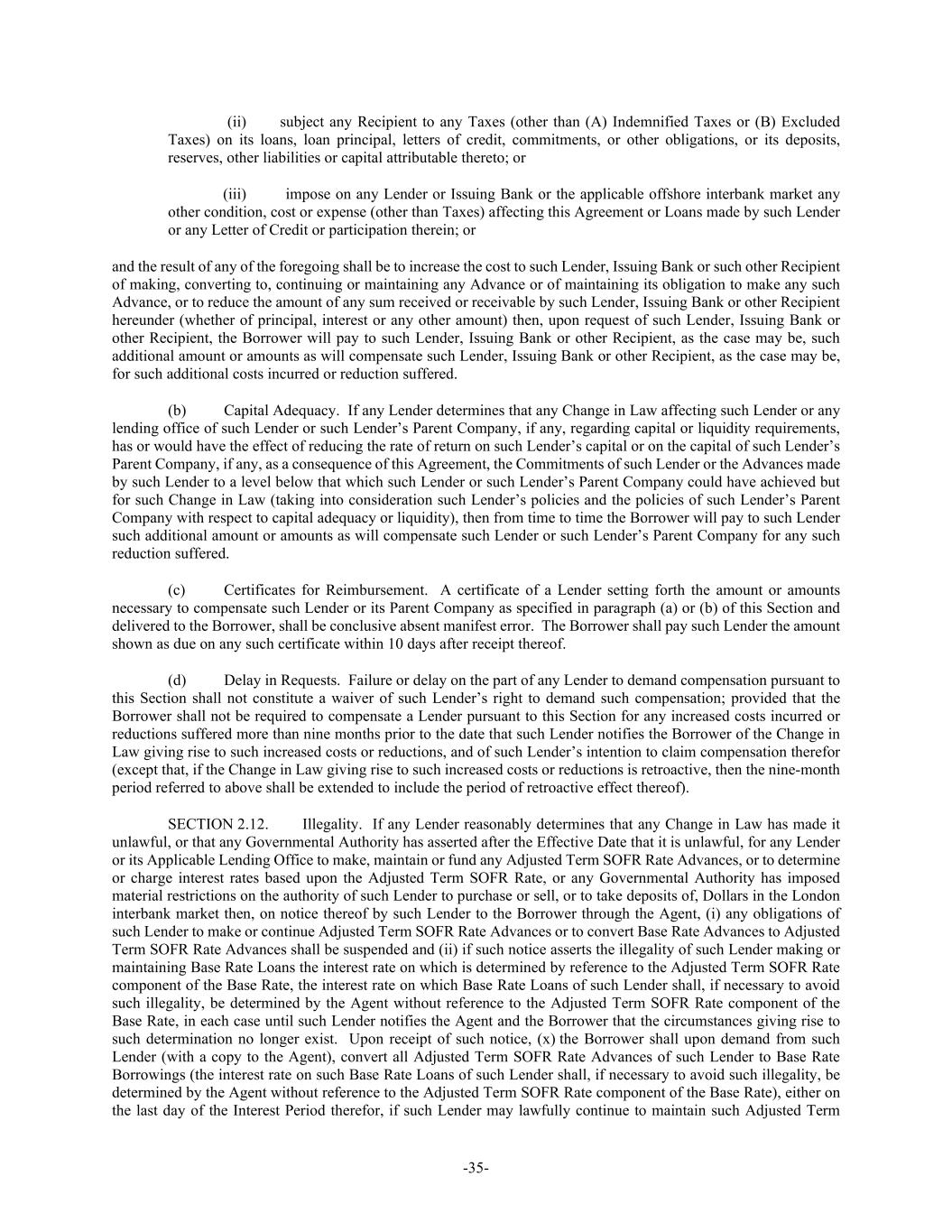 -35- (ii) subject any Recipient to any Taxes (other than (A) Indemnified Taxes or (B) Excluded Taxes) on its loans, loan principal, letters of credit, commitments, or other obligations, or its deposits, reserves, other liabilities or capital attributable thereto; or (iii) impose on any Lender or Issuing Bank or the applicable offshore interbank market any other condition, cost or expense (other than Taxes) affecting this Agreement or Loans made by such Lender or any Letter of Credit or participation therein; or and the result of any of the foregoing shall be to increase the cost to such Lender, Issuing Bank or such other Recipient of making, converting to, continuing or maintaining any Advance or of maintaining its obligation to make any such Advance, or to reduce the amount of any sum received or receivable by such Lender, Issuing Bank or other Recipient hereunder (whether of principal, interest or any other amount) then, upon request of such Lender, Issuing Bank or other Recipient, the Borrower will pay to such Lender, Issuing Bank or other Recipient, as the case may be, such additional amount or amounts as will compensate such Lender, Issuing Bank or other Recipient, as the case may be, for such additional costs incurred or reduction suffered. (b) Capital Adequacy. If any Lender determines that any Change in Law affecting such Lender or any lending office of such Lender or such Lender’s Parent Company, if any, regarding capital or liquidity requirements, has or would have the effect of reducing the rate of return on such Lender’s capital or on the capital of such Lender’s Parent Company, if any, as a consequence of this Agreement, the Commitments of such Lender or the Advances made by such Lender to a level below that which such Lender or such Lender’s Parent Company could have achieved but for such Change in Law (taking into consideration such Lender’s policies and the policies of such Lender’s Parent Company with respect to capital adequacy or liquidity), then from time to time the Borrower will pay to such Lender such additional amount or amounts as will compensate such Lender or such Lender’s Parent Company for any such reduction suffered. (c) Certificates for Reimbursement. A certificate of a Lender setting forth the amount or amounts necessary to compensate such Lender or its Parent Company as specified in paragraph (a) or (b) of this Section and delivered to the Borrower, shall be conclusive absent manifest error. The Borrower shall pay such Lender the amount shown as due on any such certificate within 10 days after receipt thereof. (d) Delay in Requests. Failure or delay on the part of any Lender to demand compensation pursuant to this Section shall not constitute a waiver of such Lender’s right to demand such compensation; provided that the Borrower shall not be required to compensate a Lender pursuant to this Section for any increased costs incurred or reductions suffered more than nine months prior to the date that such Lender notifies the Borrower of the Change in Law giving rise to such increased costs or reductions, and of such Lender’s intention to claim compensation therefor (except that, if the Change in Law giving rise to such increased costs or reductions is retroactive, then the nine-month period referred to above shall be extended to include the period of retroactive effect thereof). SECTION 2.12. Illegality. If any Lender reasonably determines that any Change in Law has made it unlawful, or that any Governmental Authority has asserted after the Effective Date that it is unlawful, for any Lender or its Applicable Lending Office to make, maintain or fund any Adjusted Term SOFR Rate Advances, or to determine or charge interest rates based upon the Adjusted Term SOFR Rate, or any Governmental Authority has imposed material restrictions on the authority of such Lender to purchase or sell, or to take deposits of, Dollars in the London interbank market then, on notice thereof by such Lender to the Borrower through the Agent, (i) any obligations of such Lender to make or continue Adjusted Term SOFR Rate Advances or to convert Base Rate Advances to Adjusted Term SOFR Rate Advances shall be suspended and (ii) if such notice asserts the illegality of such Lender making or maintaining Base Rate Loans the interest rate on which is determined by reference to the Adjusted Term SOFR Rate component of the Base Rate, the interest rate on which Base Rate Loans of such Lender shall, if necessary to avoid such illegality, be determined by the Agent without reference to the Adjusted Term SOFR Rate component of the Base Rate, in each case until such Lender notifies the Agent and the Borrower that the circumstances giving rise to such determination no longer exist. Upon receipt of such notice, (x) the Borrower shall upon demand from such Lender (with a copy to the Agent), convert all Adjusted Term SOFR Rate Advances of such Lender to Base Rate Borrowings (the interest rate on such Base Rate Loans of such Lender shall, if necessary to avoid such illegality, be determined by the Agent without reference to the Adjusted Term SOFR Rate component of the Base Rate), either on the last day of the Interest Period therefor, if such Lender may lawfully continue to maintain such Adjusted Term
