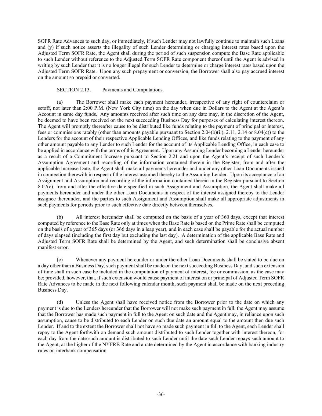 -36- SOFR Rate Advances to such day, or immediately, if such Lender may not lawfully continue to maintain such Loans and (y) if such notice asserts the illegality of such Lender determining or charging interest rates based upon the Adjusted Term SOFR Rate, the Agent shall during the period of such suspension compute the Base Rate applicable to such Lender without reference to the Adjusted Term SOFR Rate component thereof until the Agent is advised in writing by such Lender that it is no longer illegal for such Lender to determine or charge interest rates based upon the Adjusted Term SOFR Rate. Upon any such prepayment or conversion, the Borrower shall also pay accrued interest on the amount so prepaid or converted. SECTION 2.13. Payments and Computations. (a) The Borrower shall make each payment hereunder, irrespective of any right of counterclaim or setoff, not later than 2:00 P.M. (New York City time) on the day when due in Dollars to the Agent at the Agent’s Account in same day funds. Any amounts received after such time on any date may, in the discretion of the Agent, be deemed to have been received on the next succeeding Business Day for purposes of calculating interest thereon. The Agent will promptly thereafter cause to be distributed like funds relating to the payment of principal or interest, fees or commissions ratably (other than amounts payable pursuant to Section 2.04(b)(ii), 2.11, 2.14 or 8.04(c)) to the Lenders for the account of their respective Applicable Lending Offices, and like funds relating to the payment of any other amount payable to any Lender to such Lender for the account of its Applicable Lending Office, in each case to be applied in accordance with the terms of this Agreement. Upon any Assuming Lender becoming a Lender hereunder as a result of a Commitment Increase pursuant to Section 2.21 and upon the Agent’s receipt of such Lender’s Assumption Agreement and recording of the information contained therein in the Register, from and after the applicable Increase Date, the Agent shall make all payments hereunder and under any other Loan Documents issued in connection therewith in respect of the interest assumed thereby to the Assuming Lender. Upon its acceptance of an Assignment and Assumption and recording of the information contained therein in the Register pursuant to Section 8.07(c), from and after the effective date specified in such Assignment and Assumption, the Agent shall make all payments hereunder and under the other Loan Documents in respect of the interest assigned thereby to the Lender assignee thereunder, and the parties to such Assignment and Assumption shall make all appropriate adjustments in such payments for periods prior to such effective date directly between themselves. (b) All interest hereunder shall be computed on the basis of a year of 360 days, except that interest computed by reference to the Base Rate only at times when the Base Rate is based on the Prime Rate shall be computed on the basis of a year of 365 days (or 366 days in a leap year), and in each case shall be payable for the actual number of days elapsed (including the first day but excluding the last day). A determination of the applicable Base Rate and Adjusted Term SOFR Rate shall be determined by the Agent, and such determination shall be conclusive absent manifest error. (c) Whenever any payment hereunder or under the other Loan Documents shall be stated to be due on a day other than a Business Day, such payment shall be made on the next succeeding Business Day, and such extension of time shall in such case be included in the computation of payment of interest, fee or commission, as the case may be; provided, however, that, if such extension would cause payment of interest on or principal of Adjusted Term SOFR Rate Advances to be made in the next following calendar month, such payment shall be made on the next preceding Business Day. (d) Unless the Agent shall have received notice from the Borrower prior to the date on which any payment is due to the Lenders hereunder that the Borrower will not make such payment in full, the Agent may assume that the Borrower has made such payment in full to the Agent on such date and the Agent may, in reliance upon such assumption, cause to be distributed to each Lender on such due date an amount equal to the amount then due such Lender. If and to the extent the Borrower shall not have so made such payment in full to the Agent, each Lender shall repay to the Agent forthwith on demand such amount distributed to such Lender together with interest thereon, for each day from the date such amount is distributed to such Lender until the date such Lender repays such amount to the Agent, at the higher of the NYFRB Rate and a rate determined by the Agent in accordance with banking industry rules on interbank compensation.