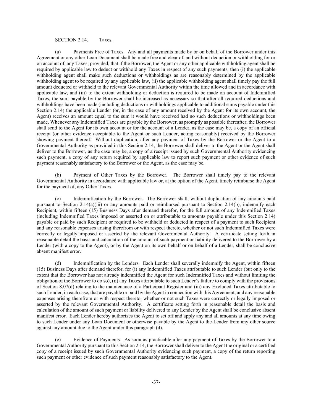 -37- SECTION 2.14. Taxes. (a) Payments Free of Taxes. Any and all payments made by or on behalf of the Borrower under this Agreement or any other Loan Document shall be made free and clear of, and without deduction or withholding for or on account of, any Taxes; provided, that if the Borrower, the Agent or any other applicable withholding agent shall be required by applicable law to deduct or withhold any Taxes in respect of any such payments, then (i) the applicable withholding agent shall make such deductions or withholdings as are reasonably determined by the applicable withholding agent to be required by any applicable law, (ii) the applicable withholding agent shall timely pay the full amount deducted or withheld to the relevant Governmental Authority within the time allowed and in accordance with applicable law, and (iii) to the extent withholding or deduction is required to be made on account of Indemnified Taxes, the sum payable by the Borrower shall be increased as necessary so that after all required deductions and withholdings have been made (including deductions or withholdings applicable to additional sums payable under this Section 2.14) the applicable Lender (or, in the case of any amount received by the Agent for its own account, the Agent) receives an amount equal to the sum it would have received had no such deductions or withholdings been made. Whenever any Indemnified Taxes are payable by the Borrower, as promptly as possible thereafter, the Borrower shall send to the Agent for its own account or for the account of a Lender, as the case may be, a copy of an official receipt (or other evidence acceptable to the Agent or such Lender, acting reasonably) received by the Borrower showing payment thereof. Without duplication, after any payment of Taxes by the Borrower or the Agent to a Governmental Authority as provided in this Section 2.14, the Borrower shall deliver to the Agent or the Agent shall deliver to the Borrower, as the case may be, a copy of a receipt issued by such Governmental Authority evidencing such payment, a copy of any return required by applicable law to report such payment or other evidence of such payment reasonably satisfactory to the Borrower or the Agent, as the case may be. (b) Payment of Other Taxes by the Borrower. The Borrower shall timely pay to the relevant Governmental Authority in accordance with applicable law or, at the option of the Agent, timely reimburse the Agent for the payment of, any Other Taxes. (c) Indemnification by the Borrower. The Borrower shall, without duplication of any amounts paid pursuant to Section 2.14(a)(iii) or any amounts paid or reimbursed pursuant to Section 2.14(b), indemnify each Recipient, within fifteen (15) Business Days after demand therefor, for the full amount of any Indemnified Taxes (including Indemnified Taxes imposed or asserted on or attributable to amounts payable under this Section 2.14) payable or paid by such Recipient or required to be withheld or deducted in respect of a payment to such Recipient and any reasonable expenses arising therefrom or with respect thereto, whether or not such Indemnified Taxes were correctly or legally imposed or asserted by the relevant Governmental Authority. A certificate setting forth in reasonable detail the basis and calculation of the amount of such payment or liability delivered to the Borrower by a Lender (with a copy to the Agent), or by the Agent on its own behalf or on behalf of a Lender, shall be conclusive absent manifest error. (d) Indemnification by the Lenders. Each Lender shall severally indemnify the Agent, within fifteen (15) Business Days after demand therefor, for (i) any Indemnified Taxes attributable to such Lender (but only to the extent that the Borrower has not already indemnified the Agent for such Indemnified Taxes and without limiting the obligation of the Borrower to do so), (ii) any Taxes attributable to such Lender’s failure to comply with the provisions of Section 8.07(d) relating to the maintenance of a Participant Register and (iii) any Excluded Taxes attributable to such Lender, in each case, that are payable or paid by the Agent in connection with this Agreement, and any reasonable expenses arising therefrom or with respect thereto, whether or not such Taxes were correctly or legally imposed or asserted by the relevant Governmental Authority. A certificate setting forth in reasonable detail the basis and calculation of the amount of such payment or liability delivered to any Lender by the Agent shall be conclusive absent manifest error. Each Lender hereby authorizes the Agent to set off and apply any and all amounts at any time owing to such Lender under any Loan Document or otherwise payable by the Agent to the Lender from any other source against any amount due to the Agent under this paragraph (d). (e) Evidence of Payments. As soon as practicable after any payment of Taxes by the Borrower to a Governmental Authority pursuant to this Section 2.14, the Borrower shall deliver to the Agent the original or a certified copy of a receipt issued by such Governmental Authority evidencing such payment, a copy of the return reporting such payment or other evidence of such payment reasonably satisfactory to the Agent.