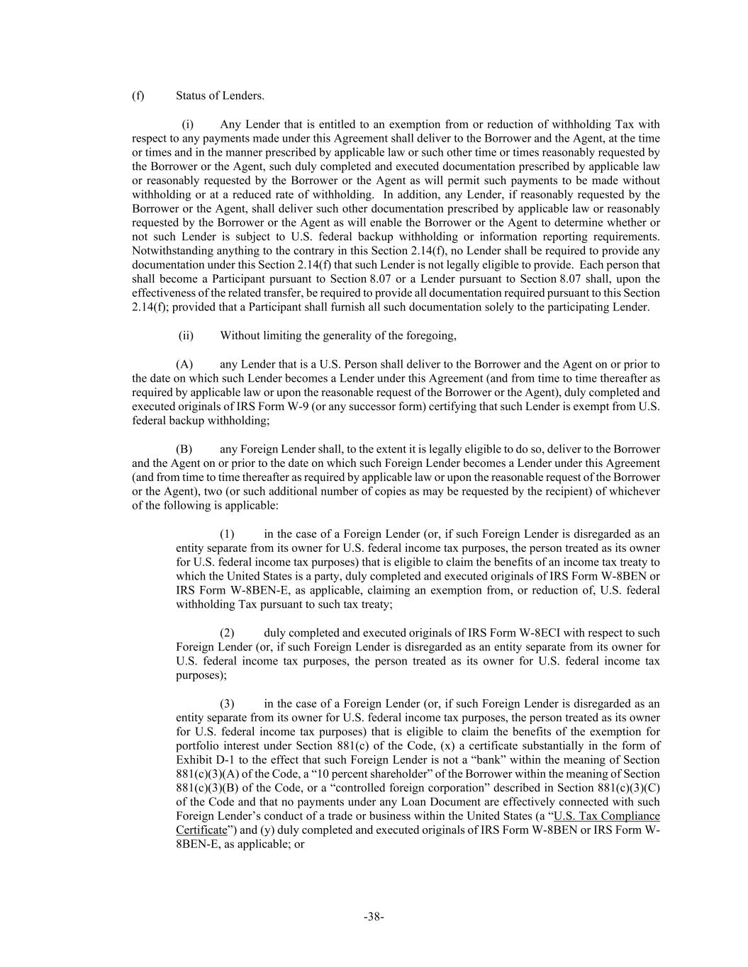 -38- (f) Status of Lenders. (i) Any Lender that is entitled to an exemption from or reduction of withholding Tax with respect to any payments made under this Agreement shall deliver to the Borrower and the Agent, at the time or times and in the manner prescribed by applicable law or such other time or times reasonably requested by the Borrower or the Agent, such duly completed and executed documentation prescribed by applicable law or reasonably requested by the Borrower or the Agent as will permit such payments to be made without withholding or at a reduced rate of withholding. In addition, any Lender, if reasonably requested by the Borrower or the Agent, shall deliver such other documentation prescribed by applicable law or reasonably requested by the Borrower or the Agent as will enable the Borrower or the Agent to determine whether or not such Lender is subject to U.S. federal backup withholding or information reporting requirements. Notwithstanding anything to the contrary in this Section 2.14(f), no Lender shall be required to provide any documentation under this Section 2.14(f) that such Lender is not legally eligible to provide. Each person that shall become a Participant pursuant to Section 8.07 or a Lender pursuant to Section 8.07 shall, upon the effectiveness of the related transfer, be required to provide all documentation required pursuant to this Section 2.14(f); provided that a Participant shall furnish all such documentation solely to the participating Lender. (ii) Without limiting the generality of the foregoing, (A) any Lender that is a U.S. Person shall deliver to the Borrower and the Agent on or prior to the date on which such Lender becomes a Lender under this Agreement (and from time to time thereafter as required by applicable law or upon the reasonable request of the Borrower or the Agent), duly completed and executed originals of IRS Form W-9 (or any successor form) certifying that such Lender is exempt from U.S. federal backup withholding; (B) any Foreign Lender shall, to the extent it is legally eligible to do so, deliver to the Borrower and the Agent on or prior to the date on which such Foreign Lender becomes a Lender under this Agreement (and from time to time thereafter as required by applicable law or upon the reasonable request of the Borrower or the Agent), two (or such additional number of copies as may be requested by the recipient) of whichever of the following is applicable: (1) in the case of a Foreign Lender (or, if such Foreign Lender is disregarded as an entity separate from its owner for U.S. federal income tax purposes, the person treated as its owner for U.S. federal income tax purposes) that is eligible to claim the benefits of an income tax treaty to which the United States is a party, duly completed and executed originals of IRS Form W-8BEN or IRS Form W-8BEN-E, as applicable, claiming an exemption from, or reduction of, U.S. federal withholding Tax pursuant to such tax treaty; (2) duly completed and executed originals of IRS Form W-8ECI with respect to such Foreign Lender (or, if such Foreign Lender is disregarded as an entity separate from its owner for U.S. federal income tax purposes, the person treated as its owner for U.S. federal income tax purposes); (3) in the case of a Foreign Lender (or, if such Foreign Lender is disregarded as an entity separate from its owner for U.S. federal income tax purposes, the person treated as its owner for U.S. federal income tax purposes) that is eligible to claim the benefits of the exemption for portfolio interest under Section 881(c) of the Code, (x) a certificate substantially in the form of Exhibit D-1 to the effect that such Foreign Lender is not a “bank” within the meaning of Section 881(c)(3)(A) of the Code, a “10 percent shareholder” of the Borrower within the meaning of Section 881(c)(3)(B) of the Code, or a “controlled foreign corporation” described in Section 881(c)(3)(C) of the Code and that no payments under any Loan Document are effectively connected with such Foreign Lender’s conduct of a trade or business within the United States (a “U.S. Tax Compliance Certificate”) and (y) duly completed and executed originals of IRS Form W-8BEN or IRS Form W- 8BEN-E, as applicable; or