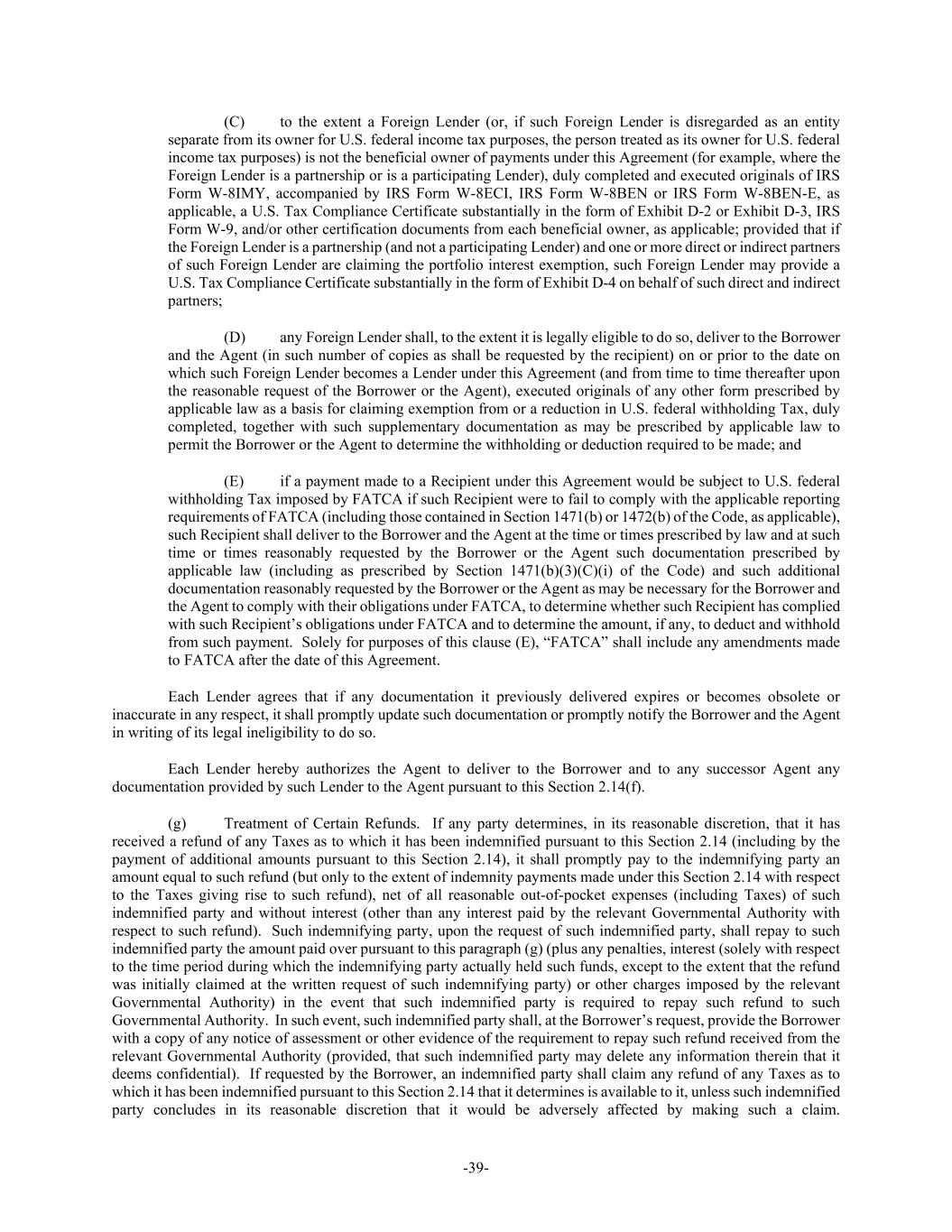 -39- (C) to the extent a Foreign Lender (or, if such Foreign Lender is disregarded as an entity separate from its owner for U.S. federal income tax purposes, the person treated as its owner for U.S. federal income tax purposes) is not the beneficial owner of payments under this Agreement (for example, where the Foreign Lender is a partnership or is a participating Lender), duly completed and executed originals of IRS Form W-8IMY, accompanied by IRS Form W-8ECI, IRS Form W-8BEN or IRS Form W-8BEN-E, as applicable, a U.S. Tax Compliance Certificate substantially in the form of Exhibit D-2 or Exhibit D-3, IRS Form W-9, and/or other certification documents from each beneficial owner, as applicable; provided that if the Foreign Lender is a partnership (and not a participating Lender) and one or more direct or indirect partners of such Foreign Lender are claiming the portfolio interest exemption, such Foreign Lender may provide a U.S. Tax Compliance Certificate substantially in the form of Exhibit D-4 on behalf of such direct and indirect partners; (D) any Foreign Lender shall, to the extent it is legally eligible to do so, deliver to the Borrower and the Agent (in such number of copies as shall be requested by the recipient) on or prior to the date on which such Foreign Lender becomes a Lender under this Agreement (and from time to time thereafter upon the reasonable request of the Borrower or the Agent), executed originals of any other form prescribed by applicable law as a basis for claiming exemption from or a reduction in U.S. federal withholding Tax, duly completed, together with such supplementary documentation as may be prescribed by applicable law to permit the Borrower or the Agent to determine the withholding or deduction required to be made; and (E) if a payment made to a Recipient under this Agreement would be subject to U.S. federal withholding Tax imposed by FATCA if such Recipient were to fail to comply with the applicable reporting requirements of FATCA (including those contained in Section 1471(b) or 1472(b) of the Code, as applicable), such Recipient shall deliver to the Borrower and the Agent at the time or times prescribed by law and at such time or times reasonably requested by the Borrower or the Agent such documentation prescribed by applicable law (including as prescribed by Section 1471(b)(3)(C)(i) of the Code) and such additional documentation reasonably requested by the Borrower or the Agent as may be necessary for the Borrower and the Agent to comply with their obligations under FATCA, to determine whether such Recipient has complied with such Recipient’s obligations under FATCA and to determine the amount, if any, to deduct and withhold from such payment. Solely for purposes of this clause (E), “FATCA” shall include any amendments made to FATCA after the date of this Agreement. Each Lender agrees that if any documentation it previously delivered expires or becomes obsolete or inaccurate in any respect, it shall promptly update such documentation or promptly notify the Borrower and the Agent in writing of its legal ineligibility to do so. Each Lender hereby authorizes the Agent to deliver to the Borrower and to any successor Agent any documentation provided by such Lender to the Agent pursuant to this Section 2.14(f). (g) Treatment of Certain Refunds. If any party determines, in its reasonable discretion, that it has received a refund of any Taxes as to which it has been indemnified pursuant to this Section 2.14 (including by the payment of additional amounts pursuant to this Section 2.14), it shall promptly pay to the indemnifying party an amount equal to such refund (but only to the extent of indemnity payments made under this Section 2.14 with respect to the Taxes giving rise to such refund), net of all reasonable out-of-pocket expenses (including Taxes) of such indemnified party and without interest (other than any interest paid by the relevant Governmental Authority with respect to such refund). Such indemnifying party, upon the request of such indemnified party, shall repay to such indemnified party the amount paid over pursuant to this paragraph (g) (plus any penalties, interest (solely with respect to the time period during which the indemnifying party actually held such funds, except to the extent that the refund was initially claimed at the written request of such indemnifying party) or other charges imposed by the relevant Governmental Authority) in the event that such indemnified party is required to repay such refund to such Governmental Authority. In such event, such indemnified party shall, at the Borrower’s request, provide the Borrower with a copy of any notice of assessment or other evidence of the requirement to repay such refund received from the relevant Governmental Authority (provided, that such indemnified party may delete any information therein that it deems confidential). If requested by the Borrower, an indemnified party shall claim any refund of any Taxes as to which it has been indemnified pursuant to this Section 2.14 that it determines is available to it, unless such indemnified party concludes in its reasonable discretion that it would be adversely affected by making such a claim.
