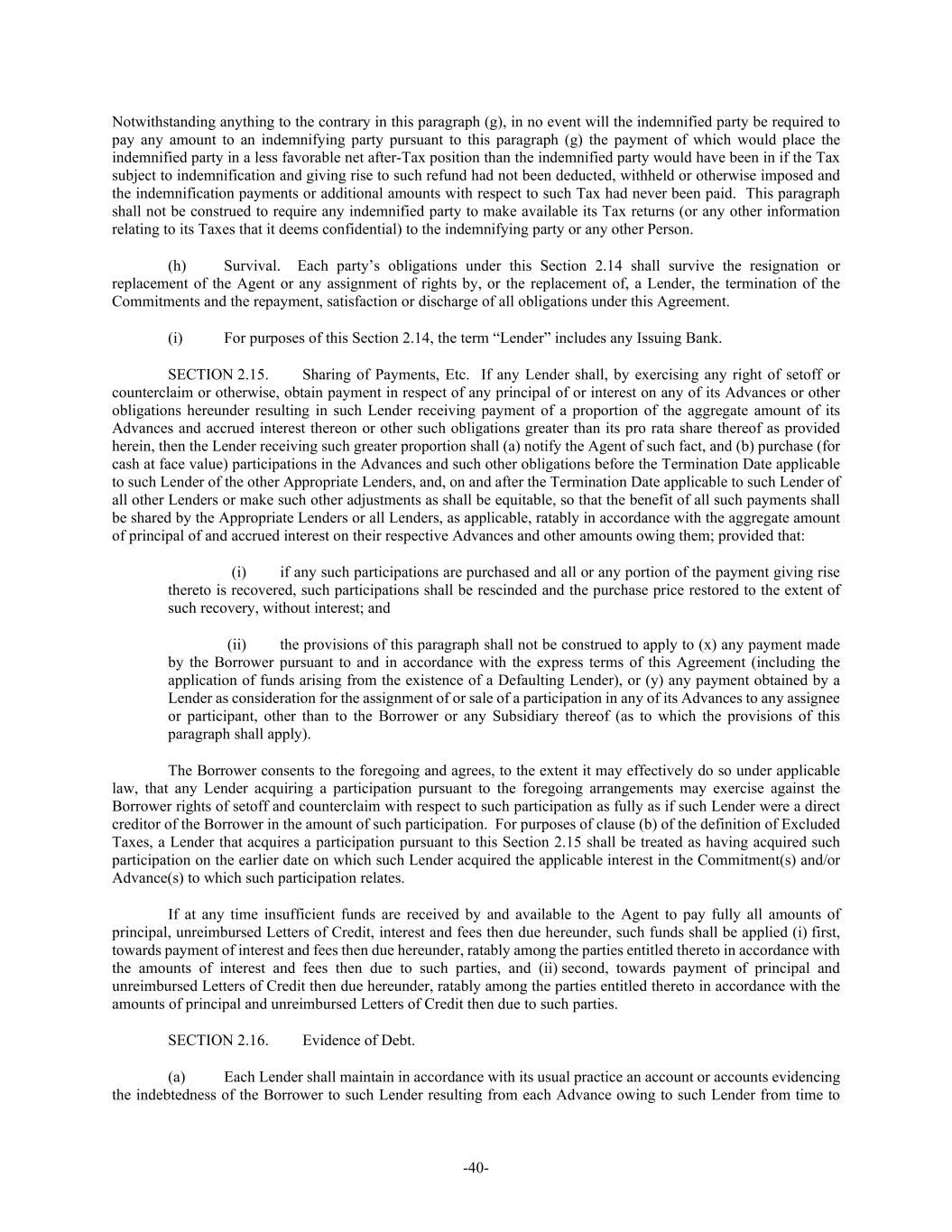 -40- Notwithstanding anything to the contrary in this paragraph (g), in no event will the indemnified party be required to pay any amount to an indemnifying party pursuant to this paragraph (g) the payment of which would place the indemnified party in a less favorable net after-Tax position than the indemnified party would have been in if the Tax subject to indemnification and giving rise to such refund had not been deducted, withheld or otherwise imposed and the indemnification payments or additional amounts with respect to such Tax had never been paid. This paragraph shall not be construed to require any indemnified party to make available its Tax returns (or any other information relating to its Taxes that it deems confidential) to the indemnifying party or any other Person. (h) Survival. Each party’s obligations under this Section 2.14 shall survive the resignation or replacement of the Agent or any assignment of rights by, or the replacement of, a Lender, the termination of the Commitments and the repayment, satisfaction or discharge of all obligations under this Agreement. (i) For purposes of this Section 2.14, the term “Lender” includes any Issuing Bank. SECTION 2.15. Sharing of Payments, Etc. If any Lender shall, by exercising any right of setoff or counterclaim or otherwise, obtain payment in respect of any principal of or interest on any of its Advances or other obligations hereunder resulting in such Lender receiving payment of a proportion of the aggregate amount of its Advances and accrued interest thereon or other such obligations greater than its pro rata share thereof as provided herein, then the Lender receiving such greater proportion shall (a) notify the Agent of such fact, and (b) purchase (for cash at face value) participations in the Advances and such other obligations before the Termination Date applicable to such Lender of the other Appropriate Lenders, and, on and after the Termination Date applicable to such Lender of all other Lenders or make such other adjustments as shall be equitable, so that the benefit of all such payments shall be shared by the Appropriate Lenders or all Lenders, as applicable, ratably in accordance with the aggregate amount of principal of and accrued interest on their respective Advances and other amounts owing them; provided that: (i) if any such participations are purchased and all or any portion of the payment giving rise thereto is recovered, such participations shall be rescinded and the purchase price restored to the extent of such recovery, without interest; and (ii) the provisions of this paragraph shall not be construed to apply to (x) any payment made by the Borrower pursuant to and in accordance with the express terms of this Agreement (including the application of funds arising from the existence of a Defaulting Lender), or (y) any payment obtained by a Lender as consideration for the assignment of or sale of a participation in any of its Advances to any assignee or participant, other than to the Borrower or any Subsidiary thereof (as to which the provisions of this paragraph shall apply). The Borrower consents to the foregoing and agrees, to the extent it may effectively do so under applicable law, that any Lender acquiring a participation pursuant to the foregoing arrangements may exercise against the Borrower rights of setoff and counterclaim with respect to such participation as fully as if such Lender were a direct creditor of the Borrower in the amount of such participation. For purposes of clause (b) of the definition of Excluded Taxes, a Lender that acquires a participation pursuant to this Section 2.15 shall be treated as having acquired such participation on the earlier date on which such Lender acquired the applicable interest in the Commitment(s) and/or Advance(s) to which such participation relates. If at any time insufficient funds are received by and available to the Agent to pay fully all amounts of principal, unreimbursed Letters of Credit, interest and fees then due hereunder, such funds shall be applied (i) first, towards payment of interest and fees then due hereunder, ratably among the parties entitled thereto in accordance with the amounts of interest and fees then due to such parties, and (ii) second, towards payment of principal and unreimbursed Letters of Credit then due hereunder, ratably among the parties entitled thereto in accordance with the amounts of principal and unreimbursed Letters of Credit then due to such parties. SECTION 2.16. Evidence of Debt. (a) Each Lender shall maintain in accordance with its usual practice an account or accounts evidencing the indebtedness of the Borrower to such Lender resulting from each Advance owing to such Lender from time to