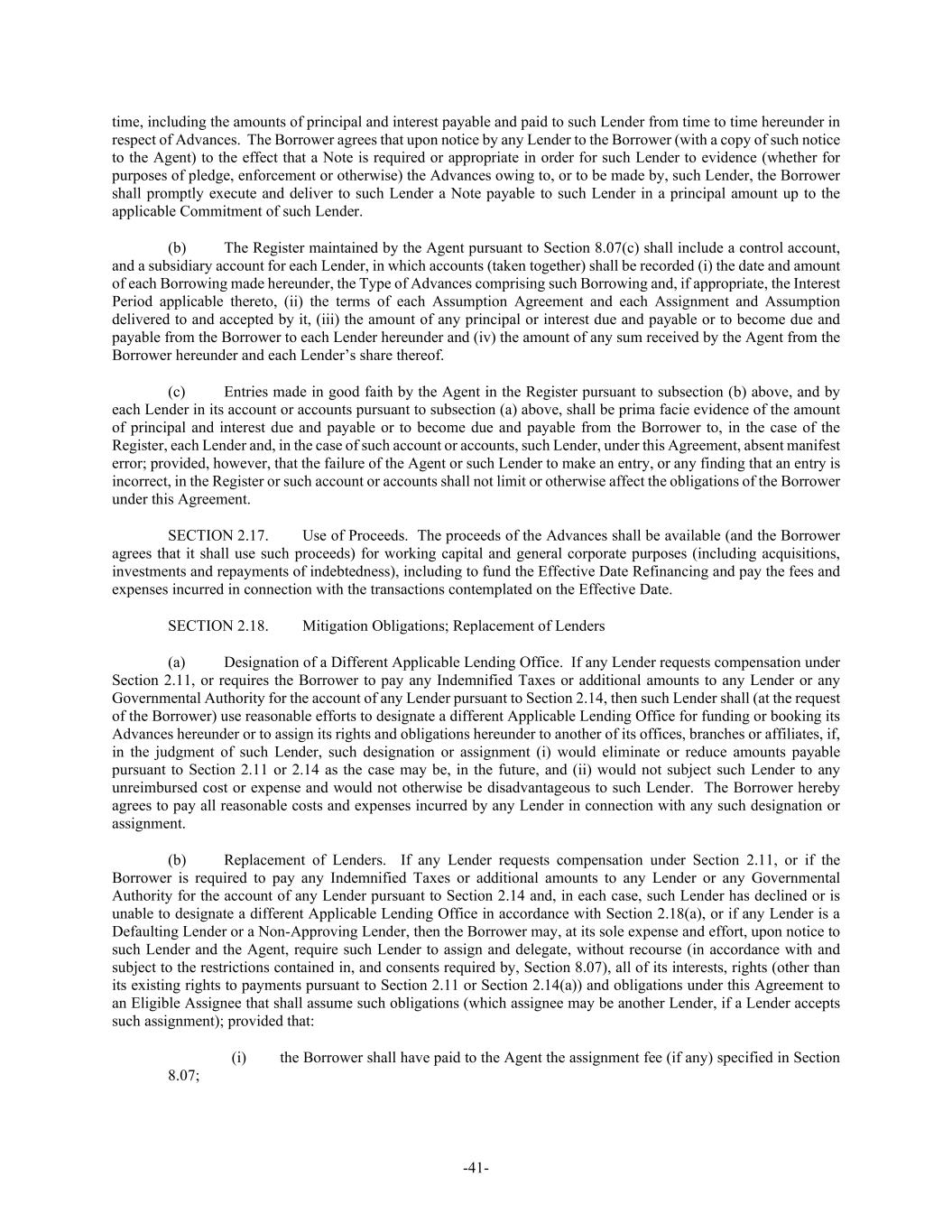 -41- time, including the amounts of principal and interest payable and paid to such Lender from time to time hereunder in respect of Advances. The Borrower agrees that upon notice by any Lender to the Borrower (with a copy of such notice to the Agent) to the effect that a Note is required or appropriate in order for such Lender to evidence (whether for purposes of pledge, enforcement or otherwise) the Advances owing to, or to be made by, such Lender, the Borrower shall promptly execute and deliver to such Lender a Note payable to such Lender in a principal amount up to the applicable Commitment of such Lender. (b) The Register maintained by the Agent pursuant to Section 8.07(c) shall include a control account, and a subsidiary account for each Lender, in which accounts (taken together) shall be recorded (i) the date and amount of each Borrowing made hereunder, the Type of Advances comprising such Borrowing and, if appropriate, the Interest Period applicable thereto, (ii) the terms of each Assumption Agreement and each Assignment and Assumption delivered to and accepted by it, (iii) the amount of any principal or interest due and payable or to become due and payable from the Borrower to each Lender hereunder and (iv) the amount of any sum received by the Agent from the Borrower hereunder and each Lender’s share thereof. (c) Entries made in good faith by the Agent in the Register pursuant to subsection (b) above, and by each Lender in its account or accounts pursuant to subsection (a) above, shall be prima facie evidence of the amount of principal and interest due and payable or to become due and payable from the Borrower to, in the case of the Register, each Lender and, in the case of such account or accounts, such Lender, under this Agreement, absent manifest error; provided, however, that the failure of the Agent or such Lender to make an entry, or any finding that an entry is incorrect, in the Register or such account or accounts shall not limit or otherwise affect the obligations of the Borrower under this Agreement. SECTION 2.17. Use of Proceeds. The proceeds of the Advances shall be available (and the Borrower agrees that it shall use such proceeds) for working capital and general corporate purposes (including acquisitions, investments and repayments of indebtedness), including to fund the Effective Date Refinancing and pay the fees and expenses incurred in connection with the transactions contemplated on the Effective Date. SECTION 2.18. Mitigation Obligations; Replacement of Lenders (a) Designation of a Different Applicable Lending Office. If any Lender requests compensation under Section 2.11, or requires the Borrower to pay any Indemnified Taxes or additional amounts to any Lender or any Governmental Authority for the account of any Lender pursuant to Section 2.14, then such Lender shall (at the request of the Borrower) use reasonable efforts to designate a different Applicable Lending Office for funding or booking its Advances hereunder or to assign its rights and obligations hereunder to another of its offices, branches or affiliates, if, in the judgment of such Lender, such designation or assignment (i) would eliminate or reduce amounts payable pursuant to Section 2.11 or 2.14 as the case may be, in the future, and (ii) would not subject such Lender to any unreimbursed cost or expense and would not otherwise be disadvantageous to such Lender. The Borrower hereby agrees to pay all reasonable costs and expenses incurred by any Lender in connection with any such designation or assignment. (b) Replacement of Lenders. If any Lender requests compensation under Section 2.11, or if the Borrower is required to pay any Indemnified Taxes or additional amounts to any Lender or any Governmental Authority for the account of any Lender pursuant to Section 2.14 and, in each case, such Lender has declined or is unable to designate a different Applicable Lending Office in accordance with Section 2.18(a), or if any Lender is a Defaulting Lender or a Non-Approving Lender, then the Borrower may, at its sole expense and effort, upon notice to such Lender and the Agent, require such Lender to assign and delegate, without recourse (in accordance with and subject to the restrictions contained in, and consents required by, Section 8.07), all of its interests, rights (other than its existing rights to payments pursuant to Section 2.11 or Section 2.14(a)) and obligations under this Agreement to an Eligible Assignee that shall assume such obligations (which assignee may be another Lender, if a Lender accepts such assignment); provided that: (i) the Borrower shall have paid to the Agent the assignment fee (if any) specified in Section 8.07;