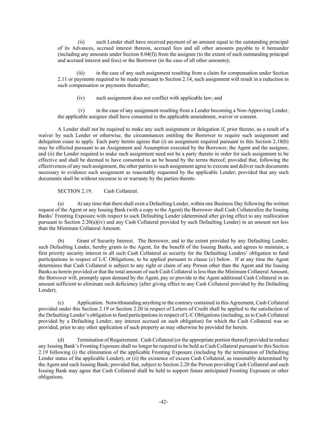 -42- (ii) such Lender shall have received payment of an amount equal to the outstanding principal of its Advances, accrued interest thereon, accrued fees and all other amounts payable to it hereunder (including any amounts under Section 8.04(f)) from the assignee (to the extent of such outstanding principal and accrued interest and fees) or the Borrower (in the case of all other amounts); (iii) in the case of any such assignment resulting from a claim for compensation under Section 2.11 or payments required to be made pursuant to Section 2.14, such assignment will result in a reduction in such compensation or payments thereafter; (iv) such assignment does not conflict with applicable law; and (v) in the case of any assignment resulting from a Lender becoming a Non-Approving Lender, the applicable assignee shall have consented to the applicable amendment, waiver or consent. A Lender shall not be required to make any such assignment or delegation if, prior thereto, as a result of a waiver by such Lender or otherwise, the circumstances entitling the Borrower to require such assignment and delegation cease to apply. Each party hereto agrees that (i) an assignment required pursuant to this Section 2.18(b) may be effected pursuant to an Assignment and Assumption executed by the Borrower, the Agent and the assignee, and (ii) the Lender required to make such assignment need not be a party thereto in order for such assignment to be effective and shall be deemed to have consented to an be bound by the terms thereof; provided that, following the effectiveness of any such assignment, the other parties to such assignment agree to execute and deliver such documents necessary to evidence such assignment as reasonably requested by the applicable Lender; provided that any such documents shall be without recourse to or warranty by the parties thereto. SECTION 2.19. Cash Collateral. (a) At any time that there shall exist a Defaulting Lender, within one Business Day following the written request of the Agent or any Issuing Bank (with a copy to the Agent) the Borrower shall Cash Collateralize the Issuing Banks’ Fronting Exposure with respect to such Defaulting Lender (determined after giving effect to any reallocation pursuant to Section 2.20(a)(iv) and any Cash Collateral provided by such Defaulting Lender) in an amount not less than the Minimum Collateral Amount. (b) Grant of Security Interest. The Borrower, and to the extent provided by any Defaulting Lender, such Defaulting Lender, hereby grants to the Agent, for the benefit of the Issuing Banks, and agrees to maintain, a first priority security interest in all such Cash Collateral as security for the Defaulting Lenders’ obligation to fund participations in respect of L/C Obligations, to be applied pursuant to clause (c) below. If at any time the Agent determines that Cash Collateral is subject to any right or claim of any Person other than the Agent and the Issuing Banks as herein provided or that the total amount of such Cash Collateral is less than the Minimum Collateral Amount, the Borrower will, promptly upon demand by the Agent, pay or provide to the Agent additional Cash Collateral in an amount sufficient to eliminate such deficiency (after giving effect to any Cash Collateral provided by the Defaulting Lender). (c) Application. Notwithstanding anything to the contrary contained in this Agreement, Cash Collateral provided under this Section 2.19 or Section 2.20 in respect of Letters of Credit shall be applied to the satisfaction of the Defaulting Lender’s obligation to fund participations in respect of L/C Obligations (including, as to Cash Collateral provided by a Defaulting Lender, any interest accrued on such obligation) for which the Cash Collateral was so provided, prior to any other application of such property as may otherwise be provided for herein. (d) Termination of Requirement. Cash Collateral (or the appropriate portion thereof) provided to reduce any Issuing Bank’s Fronting Exposure shall no longer be required to be held as Cash Collateral pursuant to this Section 2.19 following (i) the elimination of the applicable Fronting Exposure (including by the termination of Defaulting Lender status of the applicable Lender), or (ii) the existence of excess Cash Collateral, as reasonably determined by the Agent and each Issuing Bank; provided that, subject to Section 2.20 the Person providing Cash Collateral and each Issuing Bank may agree that Cash Collateral shall be held to support future anticipated Fronting Exposure or other obligations.