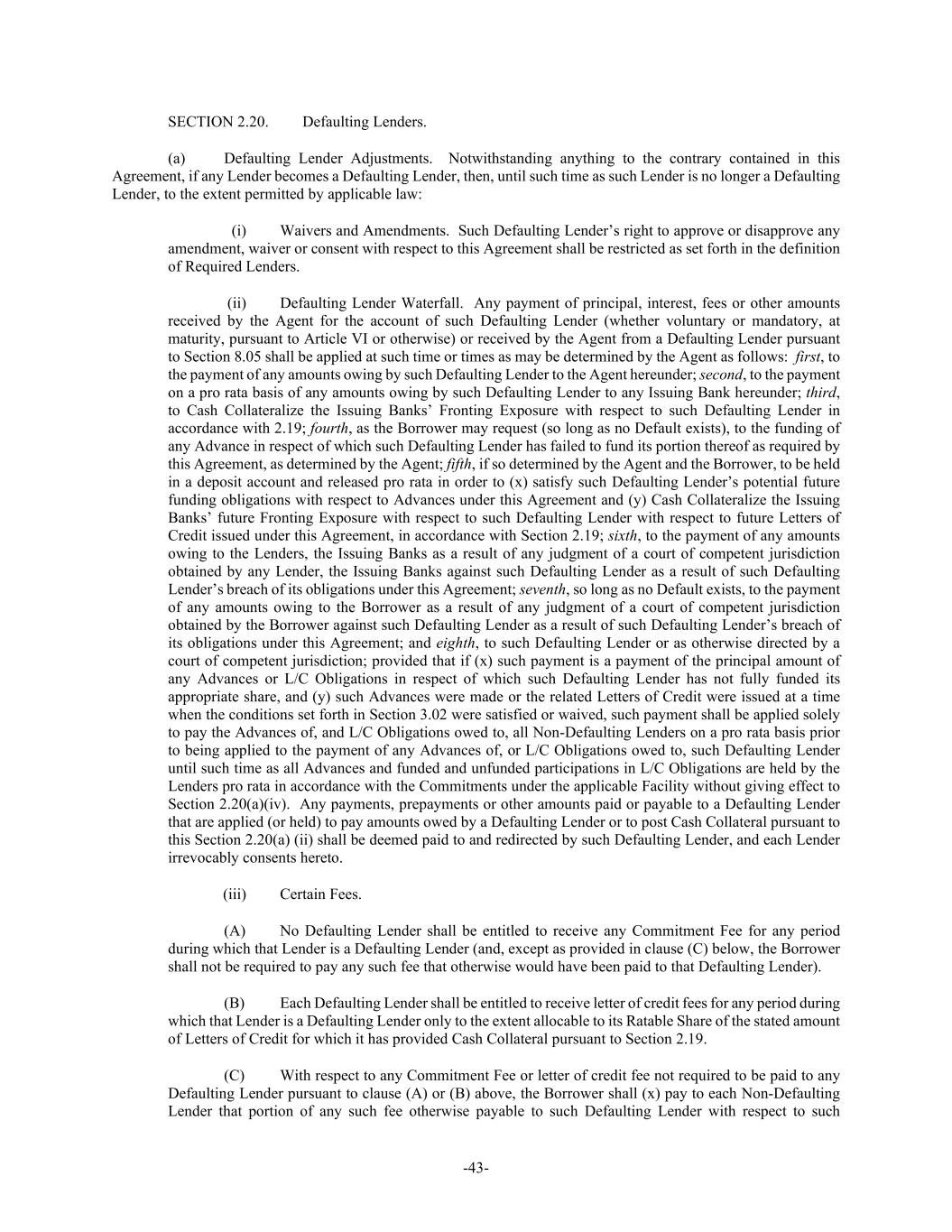 -43- SECTION 2.20. Defaulting Lenders. (a) Defaulting Lender Adjustments. Notwithstanding anything to the contrary contained in this Agreement, if any Lender becomes a Defaulting Lender, then, until such time as such Lender is no longer a Defaulting Lender, to the extent permitted by applicable law: (i) Waivers and Amendments. Such Defaulting Lender’s right to approve or disapprove any amendment, waiver or consent with respect to this Agreement shall be restricted as set forth in the definition of Required Lenders. (ii) Defaulting Lender Waterfall. Any payment of principal, interest, fees or other amounts received by the Agent for the account of such Defaulting Lender (whether voluntary or mandatory, at maturity, pursuant to Article VI or otherwise) or received by the Agent from a Defaulting Lender pursuant to Section 8.05 shall be applied at such time or times as may be determined by the Agent as follows: first, to the payment of any amounts owing by such Defaulting Lender to the Agent hereunder; second, to the payment on a pro rata basis of any amounts owing by such Defaulting Lender to any Issuing Bank hereunder; third, to Cash Collateralize the Issuing Banks’ Fronting Exposure with respect to such Defaulting Lender in accordance with 2.19; fourth, as the Borrower may request (so long as no Default exists), to the funding of any Advance in respect of which such Defaulting Lender has failed to fund its portion thereof as required by this Agreement, as determined by the Agent; fifth, if so determined by the Agent and the Borrower, to be held in a deposit account and released pro rata in order to (x) satisfy such Defaulting Lender’s potential future funding obligations with respect to Advances under this Agreement and (y) Cash Collateralize the Issuing Banks’ future Fronting Exposure with respect to such Defaulting Lender with respect to future Letters of Credit issued under this Agreement, in accordance with Section 2.19; sixth, to the payment of any amounts owing to the Lenders, the Issuing Banks as a result of any judgment of a court of competent jurisdiction obtained by any Lender, the Issuing Banks against such Defaulting Lender as a result of such Defaulting Lender’s breach of its obligations under this Agreement; seventh, so long as no Default exists, to the payment of any amounts owing to the Borrower as a result of any judgment of a court of competent jurisdiction obtained by the Borrower against such Defaulting Lender as a result of such Defaulting Lender’s breach of its obligations under this Agreement; and eighth, to such Defaulting Lender or as otherwise directed by a court of competent jurisdiction; provided that if (x) such payment is a payment of the principal amount of any Advances or L/C Obligations in respect of which such Defaulting Lender has not fully funded its appropriate share, and (y) such Advances were made or the related Letters of Credit were issued at a time when the conditions set forth in Section 3.02 were satisfied or waived, such payment shall be applied solely to pay the Advances of, and L/C Obligations owed to, all Non-Defaulting Lenders on a pro rata basis prior to being applied to the payment of any Advances of, or L/C Obligations owed to, such Defaulting Lender until such time as all Advances and funded and unfunded participations in L/C Obligations are held by the Lenders pro rata in accordance with the Commitments under the applicable Facility without giving effect to Section 2.20(a)(iv). Any payments, prepayments or other amounts paid or payable to a Defaulting Lender that are applied (or held) to pay amounts owed by a Defaulting Lender or to post Cash Collateral pursuant to this Section 2.20(a) (ii) shall be deemed paid to and redirected by such Defaulting Lender, and each Lender irrevocably consents hereto. (iii) Certain Fees. (A) No Defaulting Lender shall be entitled to receive any Commitment Fee for any period during which that Lender is a Defaulting Lender (and, except as provided in clause (C) below, the Borrower shall not be required to pay any such fee that otherwise would have been paid to that Defaulting Lender). (B) Each Defaulting Lender shall be entitled to receive letter of credit fees for any period during which that Lender is a Defaulting Lender only to the extent allocable to its Ratable Share of the stated amount of Letters of Credit for which it has provided Cash Collateral pursuant to Section 2.19. (C) With respect to any Commitment Fee or letter of credit fee not required to be paid to any Defaulting Lender pursuant to clause (A) or (B) above, the Borrower shall (x) pay to each Non-Defaulting Lender that portion of any such fee otherwise payable to such Defaulting Lender with respect to such