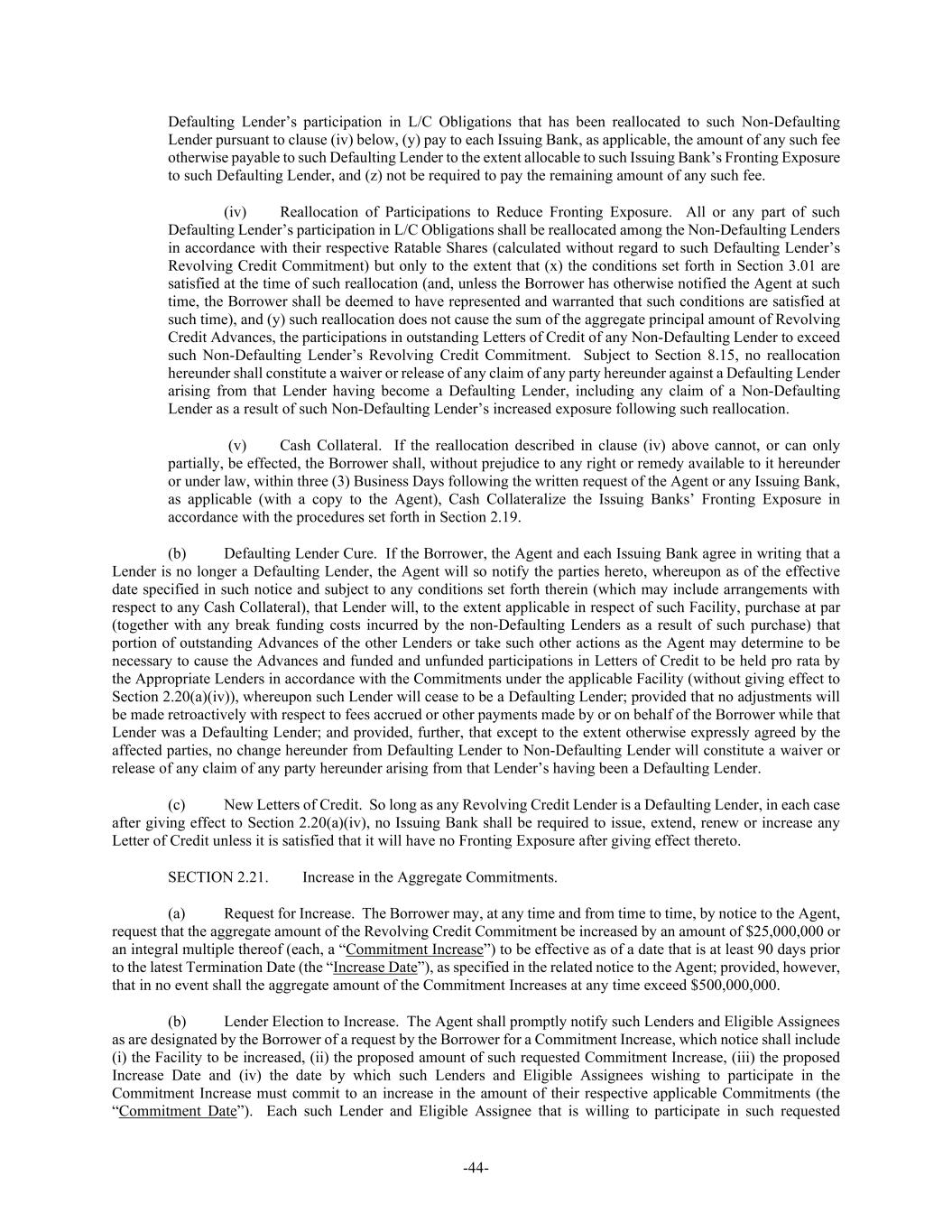 -44- Defaulting Lender’s participation in L/C Obligations that has been reallocated to such Non-Defaulting Lender pursuant to clause (iv) below, (y) pay to each Issuing Bank, as applicable, the amount of any such fee otherwise payable to such Defaulting Lender to the extent allocable to such Issuing Bank’s Fronting Exposure to such Defaulting Lender, and (z) not be required to pay the remaining amount of any such fee. (iv) Reallocation of Participations to Reduce Fronting Exposure. All or any part of such Defaulting Lender’s participation in L/C Obligations shall be reallocated among the Non-Defaulting Lenders in accordance with their respective Ratable Shares (calculated without regard to such Defaulting Lender’s Revolving Credit Commitment) but only to the extent that (x) the conditions set forth in Section 3.01 are satisfied at the time of such reallocation (and, unless the Borrower has otherwise notified the Agent at such time, the Borrower shall be deemed to have represented and warranted that such conditions are satisfied at such time), and (y) such reallocation does not cause the sum of the aggregate principal amount of Revolving Credit Advances, the participations in outstanding Letters of Credit of any Non-Defaulting Lender to exceed such Non-Defaulting Lender’s Revolving Credit Commitment. Subject to Section 8.15, no reallocation hereunder shall constitute a waiver or release of any claim of any party hereunder against a Defaulting Lender arising from that Lender having become a Defaulting Lender, including any claim of a Non-Defaulting Lender as a result of such Non-Defaulting Lender’s increased exposure following such reallocation. (v) Cash Collateral. If the reallocation described in clause (iv) above cannot, or can only partially, be effected, the Borrower shall, without prejudice to any right or remedy available to it hereunder or under law, within three (3) Business Days following the written request of the Agent or any Issuing Bank, as applicable (with a copy to the Agent), Cash Collateralize the Issuing Banks’ Fronting Exposure in accordance with the procedures set forth in Section 2.19. (b) Defaulting Lender Cure. If the Borrower, the Agent and each Issuing Bank agree in writing that a Lender is no longer a Defaulting Lender, the Agent will so notify the parties hereto, whereupon as of the effective date specified in such notice and subject to any conditions set forth therein (which may include arrangements with respect to any Cash Collateral), that Lender will, to the extent applicable in respect of such Facility, purchase at par (together with any break funding costs incurred by the non-Defaulting Lenders as a result of such purchase) that portion of outstanding Advances of the other Lenders or take such other actions as the Agent may determine to be necessary to cause the Advances and funded and unfunded participations in Letters of Credit to be held pro rata by the Appropriate Lenders in accordance with the Commitments under the applicable Facility (without giving effect to Section 2.20(a)(iv)), whereupon such Lender will cease to be a Defaulting Lender; provided that no adjustments will be made retroactively with respect to fees accrued or other payments made by or on behalf of the Borrower while that Lender was a Defaulting Lender; and provided, further, that except to the extent otherwise expressly agreed by the affected parties, no change hereunder from Defaulting Lender to Non-Defaulting Lender will constitute a waiver or release of any claim of any party hereunder arising from that Lender’s having been a Defaulting Lender. (c) New Letters of Credit. So long as any Revolving Credit Lender is a Defaulting Lender, in each case after giving effect to Section 2.20(a)(iv), no Issuing Bank shall be required to issue, extend, renew or increase any Letter of Credit unless it is satisfied that it will have no Fronting Exposure after giving effect thereto. SECTION 2.21. Increase in the Aggregate Commitments. (a) Request for Increase. The Borrower may, at any time and from time to time, by notice to the Agent, request that the aggregate amount of the Revolving Credit Commitment be increased by an amount of $25,000,000 or an integral multiple thereof (each, a “Commitment Increase”) to be effective as of a date that is at least 90 days prior to the latest Termination Date (the “Increase Date”), as specified in the related notice to the Agent; provided, however, that in no event shall the aggregate amount of the Commitment Increases at any time exceed $500,000,000. (b) Lender Election to Increase. The Agent shall promptly notify such Lenders and Eligible Assignees as are designated by the Borrower of a request by the Borrower for a Commitment Increase, which notice shall include (i) the Facility to be increased, (ii) the proposed amount of such requested Commitment Increase, (iii) the proposed Increase Date and (iv) the date by which such Lenders and Eligible Assignees wishing to participate in the Commitment Increase must commit to an increase in the amount of their respective applicable Commitments (the “Commitment Date”). Each such Lender and Eligible Assignee that is willing to participate in such requested