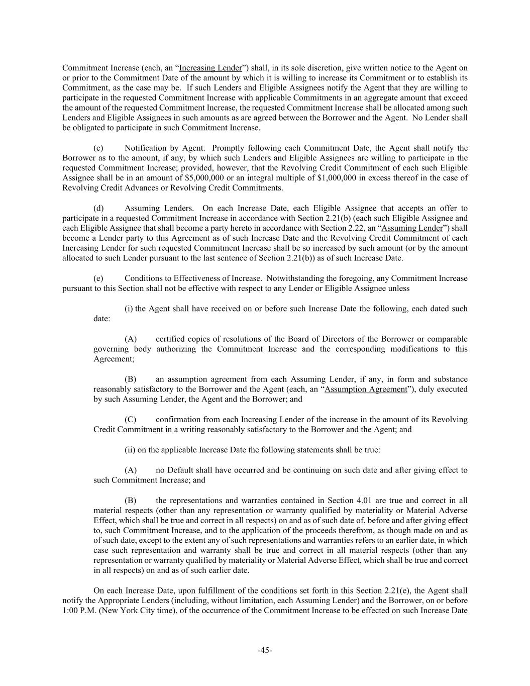 -45- Commitment Increase (each, an “Increasing Lender”) shall, in its sole discretion, give written notice to the Agent on or prior to the Commitment Date of the amount by which it is willing to increase its Commitment or to establish its Commitment, as the case may be. If such Lenders and Eligible Assignees notify the Agent that they are willing to participate in the requested Commitment Increase with applicable Commitments in an aggregate amount that exceed the amount of the requested Commitment Increase, the requested Commitment Increase shall be allocated among such Lenders and Eligible Assignees in such amounts as are agreed between the Borrower and the Agent. No Lender shall be obligated to participate in such Commitment Increase. (c) Notification by Agent. Promptly following each Commitment Date, the Agent shall notify the Borrower as to the amount, if any, by which such Lenders and Eligible Assignees are willing to participate in the requested Commitment Increase; provided, however, that the Revolving Credit Commitment of each such Eligible Assignee shall be in an amount of $5,000,000 or an integral multiple of $1,000,000 in excess thereof in the case of Revolving Credit Advances or Revolving Credit Commitments. (d) Assuming Lenders. On each Increase Date, each Eligible Assignee that accepts an offer to participate in a requested Commitment Increase in accordance with Section 2.21(b) (each such Eligible Assignee and each Eligible Assignee that shall become a party hereto in accordance with Section 2.22, an “Assuming Lender”) shall become a Lender party to this Agreement as of such Increase Date and the Revolving Credit Commitment of each Increasing Lender for such requested Commitment Increase shall be so increased by such amount (or by the amount allocated to such Lender pursuant to the last sentence of Section 2.21(b)) as of such Increase Date. (e) Conditions to Effectiveness of Increase. Notwithstanding the foregoing, any Commitment Increase pursuant to this Section shall not be effective with respect to any Lender or Eligible Assignee unless (i) the Agent shall have received on or before such Increase Date the following, each dated such date: (A) certified copies of resolutions of the Board of Directors of the Borrower or comparable governing body authorizing the Commitment Increase and the corresponding modifications to this Agreement; (B) an assumption agreement from each Assuming Lender, if any, in form and substance reasonably satisfactory to the Borrower and the Agent (each, an “Assumption Agreement”), duly executed by such Assuming Lender, the Agent and the Borrower; and (C) confirmation from each Increasing Lender of the increase in the amount of its Revolving Credit Commitment in a writing reasonably satisfactory to the Borrower and the Agent; and (ii) on the applicable Increase Date the following statements shall be true: (A) no Default shall have occurred and be continuing on such date and after giving effect to such Commitment Increase; and (B) the representations and warranties contained in Section 4.01 are true and correct in all material respects (other than any representation or warranty qualified by materiality or Material Adverse Effect, which shall be true and correct in all respects) on and as of such date of, before and after giving effect to, such Commitment Increase, and to the application of the proceeds therefrom, as though made on and as of such date, except to the extent any of such representations and warranties refers to an earlier date, in which case such representation and warranty shall be true and correct in all material respects (other than any representation or warranty qualified by materiality or Material Adverse Effect, which shall be true and correct in all respects) on and as of such earlier date. On each Increase Date, upon fulfillment of the conditions set forth in this Section 2.21(e), the Agent shall notify the Appropriate Lenders (including, without limitation, each Assuming Lender) and the Borrower, on or before 1:00 P.M. (New York City time), of the occurrence of the Commitment Increase to be effected on such Increase Date