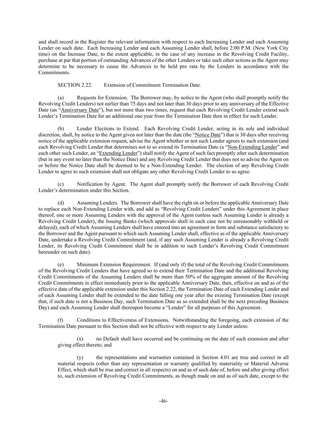 -46- and shall record in the Register the relevant information with respect to each Increasing Lender and each Assuming Lender on such date. Each Increasing Lender and each Assuming Lender shall, before 2:00 P.M. (New York City time) on the Increase Date, to the extent applicable, in the case of any increase in the Revolving Credit Facility, purchase at par that portion of outstanding Advances of the other Lenders or take such other actions as the Agent may determine to be necessary to cause the Advances to be held pro rata by the Lenders in accordance with the Commitments. SECTION 2.22. Extension of Commitment Termination Date. (a) Requests for Extension. The Borrower may, by notice to the Agent (who shall promptly notify the Revolving Credit Lenders) not earlier than 75 days and not later than 30 days prior to any anniversary of the Effective Date (an “Anniversary Date”), but not more than two times, request that each Revolving Credit Lender extend such Lender’s Termination Date for an additional one year from the Termination Date then in effect for such Lender. (b) Lender Elections to Extend. Each Revolving Credit Lender, acting in its sole and individual discretion, shall, by notice to the Agent given not later than the date (the “Notice Date”) that is 30 days after receiving notice of the applicable extension request, advise the Agent whether or not such Lender agrees to such extension (and each Revolving Credit Lender that determines not to so extend its Termination Date (a “Non-Extending Lender” and each other such Lender, an “Extending Lender”) shall notify the Agent of such fact promptly after such determination (but in any event no later than the Notice Date) and any Revolving Credit Lender that does not so advise the Agent on or before the Notice Date shall be deemed to be a Non-Extending Lender. The election of any Revolving Credit Lender to agree to such extension shall not obligate any other Revolving Credit Lender to so agree. (c) Notification by Agent. The Agent shall promptly notify the Borrower of each Revolving Credit Lender’s determination under this Section. (d) Assuming Lenders. The Borrower shall have the right on or before the applicable Anniversary Date to replace each Non-Extending Lender with, and add as “Revolving Credit Lenders” under this Agreement in place thereof, one or more Assuming Lenders with the approval of the Agent (unless such Assuming Lender is already a Revolving Credit Lender), the Issuing Banks (which approvals shall in each case not be unreasonably withheld or delayed), each of which Assuming Lenders shall have entered into an agreement in form and substance satisfactory to the Borrower and the Agent pursuant to which such Assuming Lender shall, effective as of the applicable Anniversary Date, undertake a Revolving Credit Commitment (and, if any such Assuming Lender is already a Revolving Credit Lender, its Revolving Credit Commitment shall be in addition to such Lender’s Revolving Credit Commitment hereunder on such date). (e) Minimum Extension Requirement. If (and only if) the total of the Revolving Credit Commitments of the Revolving Credit Lenders that have agreed so to extend their Termination Date and the additional Revolving Credit Commitments of the Assuming Lenders shall be more than 50% of the aggregate amount of the Revolving Credit Commitments in effect immediately prior to the applicable Anniversary Date, then, effective on and as of the effective date of the applicable extension under this Section 2.22, the Termination Date of each Extending Lender and of each Assuming Lender shall be extended to the date falling one year after the existing Termination Date (except that, if such date is not a Business Day, such Termination Date as so extended shall be the next preceding Business Day) and each Assuming Lender shall thereupon become a “Lender” for all purposes of this Agreement. (f) Conditions to Effectiveness of Extensions. Notwithstanding the foregoing, each extension of the Termination Date pursuant to this Section shall not be effective with respect to any Lender unless: (x) no Default shall have occurred and be continuing on the date of such extension and after giving effect thereto; and (y) the representations and warranties contained in Section 4.01 are true and correct in all material respects (other than any representation or warranty qualified by materiality or Material Adverse Effect, which shall be true and correct in all respects) on and as of such date of, before and after giving effect to, such extension of Revolving Credit Commitments, as though made on and as of such date, except to the