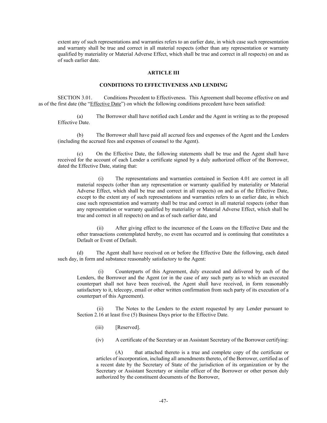 -47- extent any of such representations and warranties refers to an earlier date, in which case such representation and warranty shall be true and correct in all material respects (other than any representation or warranty qualified by materiality or Material Adverse Effect, which shall be true and correct in all respects) on and as of such earlier date. ARTICLE III CONDITIONS TO EFFECTIVENESS AND LENDING SECTION 3.01. Conditions Precedent to Effectiveness. This Agreement shall become effective on and as of the first date (the “Effective Date”) on which the following conditions precedent have been satisfied: (a) The Borrower shall have notified each Lender and the Agent in writing as to the proposed Effective Date. (b) The Borrower shall have paid all accrued fees and expenses of the Agent and the Lenders (including the accrued fees and expenses of counsel to the Agent). (c) On the Effective Date, the following statements shall be true and the Agent shall have received for the account of each Lender a certificate signed by a duly authorized officer of the Borrower, dated the Effective Date, stating that: (i) The representations and warranties contained in Section 4.01 are correct in all material respects (other than any representation or warranty qualified by materiality or Material Adverse Effect, which shall be true and correct in all respects) on and as of the Effective Date, except to the extent any of such representations and warranties refers to an earlier date, in which case such representation and warranty shall be true and correct in all material respects (other than any representation or warranty qualified by materiality or Material Adverse Effect, which shall be true and correct in all respects) on and as of such earlier date, and (ii) After giving effect to the incurrence of the Loans on the Effective Date and the other transactions contemplated hereby, no event has occurred and is continuing that constitutes a Default or Event of Default. (d) The Agent shall have received on or before the Effective Date the following, each dated such day, in form and substance reasonably satisfactory to the Agent: (i) Counterparts of this Agreement, duly executed and delivered by each of the Lenders, the Borrower and the Agent (or in the case of any such party as to which an executed counterpart shall not have been received, the Agent shall have received, in form reasonably satisfactory to it, telecopy, email or other written confirmation from such party of its execution of a counterpart of this Agreement). (ii) The Notes to the Lenders to the extent requested by any Lender pursuant to Section 2.16 at least five (5) Business Days prior to the Effective Date. (iii) [Reserved]. (iv) A certificate of the Secretary or an Assistant Secretary of the Borrower certifying: (A) that attached thereto is a true and complete copy of the certificate or articles of incorporation, including all amendments thereto, of the Borrower, certified as of a recent date by the Secretary of State of the jurisdiction of its organization or by the Secretary or Assistant Secretary or similar officer of the Borrower or other person duly authorized by the constituent documents of the Borrower,