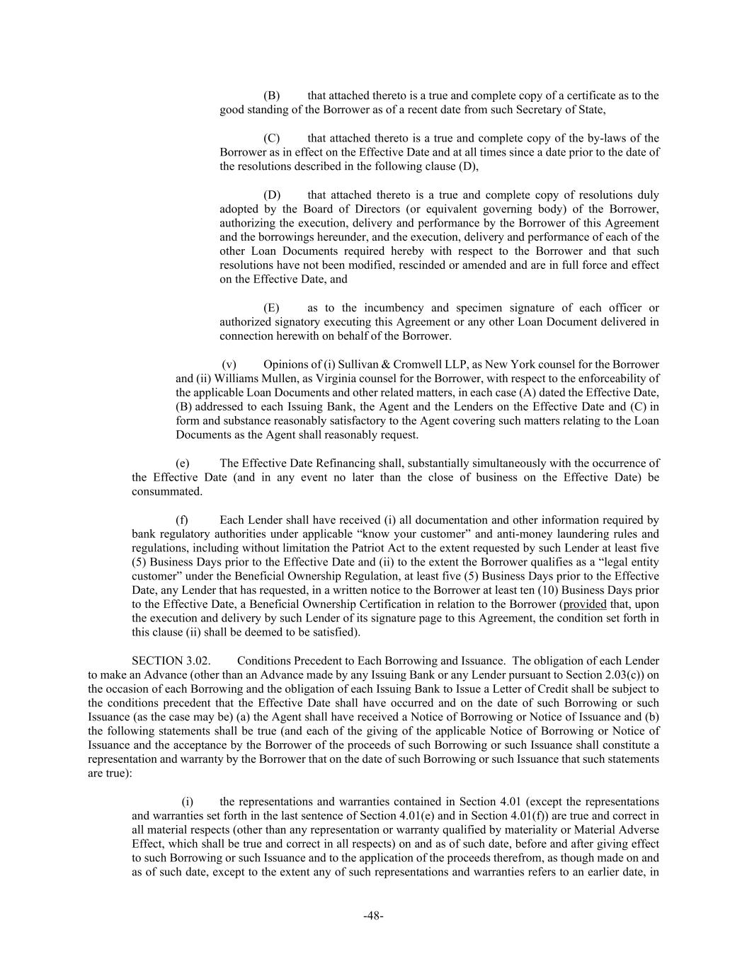 -48- (B) that attached thereto is a true and complete copy of a certificate as to the good standing of the Borrower as of a recent date from such Secretary of State, (C) that attached thereto is a true and complete copy of the by-laws of the Borrower as in effect on the Effective Date and at all times since a date prior to the date of the resolutions described in the following clause (D), (D) that attached thereto is a true and complete copy of resolutions duly adopted by the Board of Directors (or equivalent governing body) of the Borrower, authorizing the execution, delivery and performance by the Borrower of this Agreement and the borrowings hereunder, and the execution, delivery and performance of each of the other Loan Documents required hereby with respect to the Borrower and that such resolutions have not been modified, rescinded or amended and are in full force and effect on the Effective Date, and (E) as to the incumbency and specimen signature of each officer or authorized signatory executing this Agreement or any other Loan Document delivered in connection herewith on behalf of the Borrower. (v) Opinions of (i) Sullivan & Cromwell LLP, as New York counsel for the Borrower and (ii) Williams Mullen, as Virginia counsel for the Borrower, with respect to the enforceability of the applicable Loan Documents and other related matters, in each case (A) dated the Effective Date, (B) addressed to each Issuing Bank, the Agent and the Lenders on the Effective Date and (C) in form and substance reasonably satisfactory to the Agent covering such matters relating to the Loan Documents as the Agent shall reasonably request. (e) The Effective Date Refinancing shall, substantially simultaneously with the occurrence of the Effective Date (and in any event no later than the close of business on the Effective Date) be consummated. (f) Each Lender shall have received (i) all documentation and other information required by bank regulatory authorities under applicable “know your customer” and anti-money laundering rules and regulations, including without limitation the Patriot Act to the extent requested by such Lender at least five (5) Business Days prior to the Effective Date and (ii) to the extent the Borrower qualifies as a “legal entity customer” under the Beneficial Ownership Regulation, at least five (5) Business Days prior to the Effective Date, any Lender that has requested, in a written notice to the Borrower at least ten (10) Business Days prior to the Effective Date, a Beneficial Ownership Certification in relation to the Borrower (provided that, upon the execution and delivery by such Lender of its signature page to this Agreement, the condition set forth in this clause (ii) shall be deemed to be satisfied). SECTION 3.02. Conditions Precedent to Each Borrowing and Issuance. The obligation of each Lender to make an Advance (other than an Advance made by any Issuing Bank or any Lender pursuant to Section 2.03(c)) on the occasion of each Borrowing and the obligation of each Issuing Bank to Issue a Letter of Credit shall be subject to the conditions precedent that the Effective Date shall have occurred and on the date of such Borrowing or such Issuance (as the case may be) (a) the Agent shall have received a Notice of Borrowing or Notice of Issuance and (b) the following statements shall be true (and each of the giving of the applicable Notice of Borrowing or Notice of Issuance and the acceptance by the Borrower of the proceeds of such Borrowing or such Issuance shall constitute a representation and warranty by the Borrower that on the date of such Borrowing or such Issuance that such statements are true): (i) the representations and warranties contained in Section 4.01 (except the representations and warranties set forth in the last sentence of Section 4.01(e) and in Section 4.01(f)) are true and correct in all material respects (other than any representation or warranty qualified by materiality or Material Adverse Effect, which shall be true and correct in all respects) on and as of such date, before and after giving effect to such Borrowing or such Issuance and to the application of the proceeds therefrom, as though made on and as of such date, except to the extent any of such representations and warranties refers to an earlier date, in