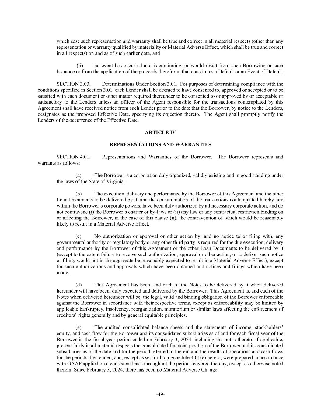 -49- which case such representation and warranty shall be true and correct in all material respects (other than any representation or warranty qualified by materiality or Material Adverse Effect, which shall be true and correct in all respects) on and as of such earlier date, and (ii) no event has occurred and is continuing, or would result from such Borrowing or such Issuance or from the application of the proceeds therefrom, that constitutes a Default or an Event of Default. SECTION 3.03. Determinations Under Section 3.01. For purposes of determining compliance with the conditions specified in Section 3.01, each Lender shall be deemed to have consented to, approved or accepted or to be satisfied with each document or other matter required thereunder to be consented to or approved by or acceptable or satisfactory to the Lenders unless an officer of the Agent responsible for the transactions contemplated by this Agreement shall have received notice from such Lender prior to the date that the Borrower, by notice to the Lenders, designates as the proposed Effective Date, specifying its objection thereto. The Agent shall promptly notify the Lenders of the occurrence of the Effective Date. ARTICLE IV REPRESENTATIONS AND WARRANTIES SECTION 4.01. Representations and Warranties of the Borrower. The Borrower represents and warrants as follows: (a) The Borrower is a corporation duly organized, validly existing and in good standing under the laws of the State of Virginia. (b) The execution, delivery and performance by the Borrower of this Agreement and the other Loan Documents to be delivered by it, and the consummation of the transactions contemplated hereby, are within the Borrower’s corporate powers, have been duly authorized by all necessary corporate action, and do not contravene (i) the Borrower’s charter or by-laws or (ii) any law or any contractual restriction binding on or affecting the Borrower, in the case of this clause (ii), the contravention of which would be reasonably likely to result in a Material Adverse Effect. (c) No authorization or approval or other action by, and no notice to or filing with, any governmental authority or regulatory body or any other third party is required for the due execution, delivery and performance by the Borrower of this Agreement or the other Loan Documents to be delivered by it (except to the extent failure to receive such authorization, approval or other action, or to deliver such notice or filing, would not in the aggregate be reasonably expected to result in a Material Adverse Effect), except for such authorizations and approvals which have been obtained and notices and filings which have been made. (d) This Agreement has been, and each of the Notes to be delivered by it when delivered hereunder will have been, duly executed and delivered by the Borrower. This Agreement is, and each of the Notes when delivered hereunder will be, the legal, valid and binding obligation of the Borrower enforceable against the Borrower in accordance with their respective terms, except as enforceability may be limited by applicable bankruptcy, insolvency, reorganization, moratorium or similar laws affecting the enforcement of creditors’ rights generally and by general equitable principles. (e) The audited consolidated balance sheets and the statements of income, stockholders’ equity, and cash flow for the Borrower and its consolidated subsidiaries as of and for each fiscal year of the Borrower in the fiscal year period ended on February 3, 2024, including the notes thereto, if applicable, present fairly in all material respects the consolidated financial position of the Borrower and its consolidated subsidiaries as of the date and for the period referred to therein and the results of operations and cash flows for the periods then ended, and, except as set forth on Schedule 4.01(e) hereto, were prepared in accordance with GAAP applied on a consistent basis throughout the periods covered thereby, except as otherwise noted therein. Since February 3, 2024, there has been no Material Adverse Change.
