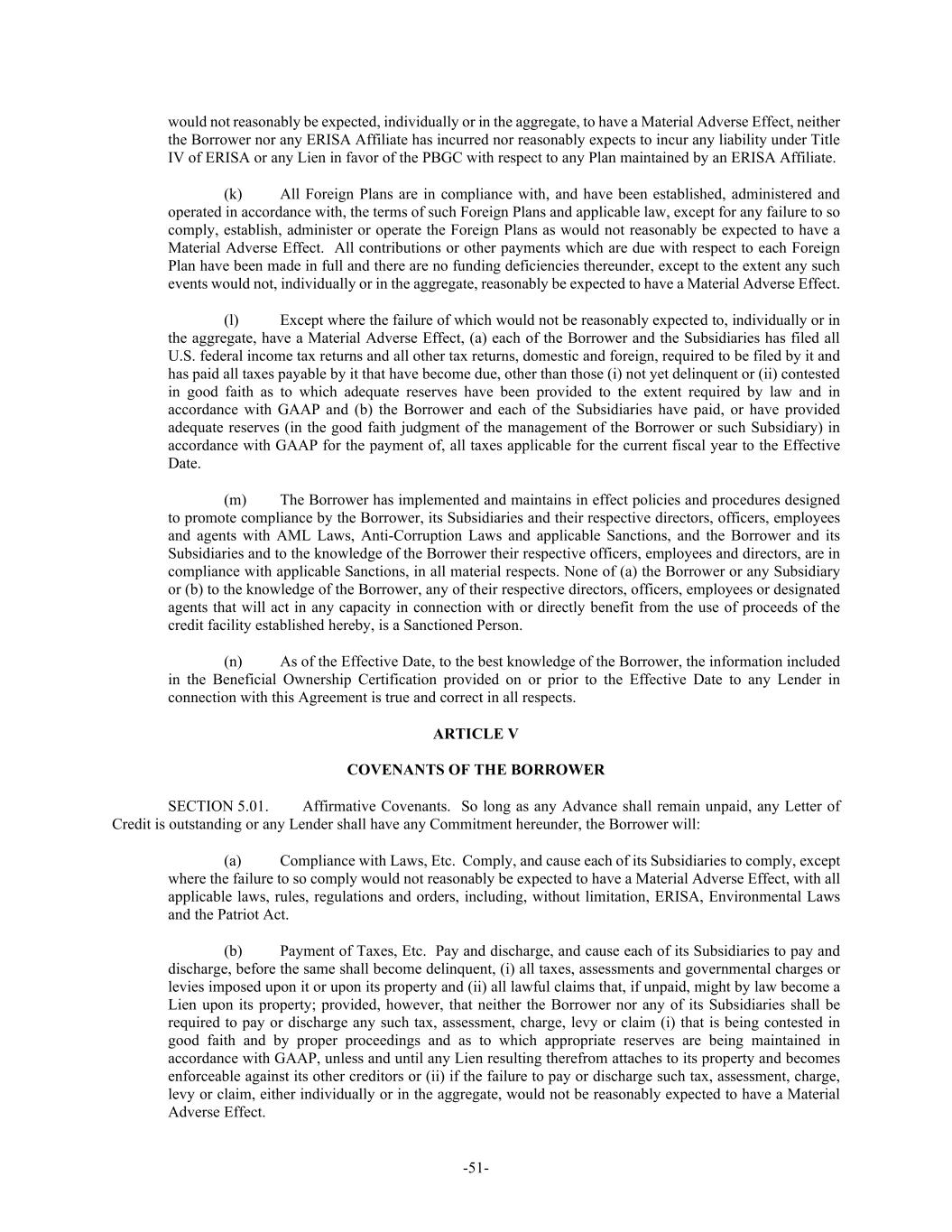 -51- would not reasonably be expected, individually or in the aggregate, to have a Material Adverse Effect, neither the Borrower nor any ERISA Affiliate has incurred nor reasonably expects to incur any liability under Title IV of ERISA or any Lien in favor of the PBGC with respect to any Plan maintained by an ERISA Affiliate. (k) All Foreign Plans are in compliance with, and have been established, administered and operated in accordance with, the terms of such Foreign Plans and applicable law, except for any failure to so comply, establish, administer or operate the Foreign Plans as would not reasonably be expected to have a Material Adverse Effect. All contributions or other payments which are due with respect to each Foreign Plan have been made in full and there are no funding deficiencies thereunder, except to the extent any such events would not, individually or in the aggregate, reasonably be expected to have a Material Adverse Effect. (l) Except where the failure of which would not be reasonably expected to, individually or in the aggregate, have a Material Adverse Effect, (a) each of the Borrower and the Subsidiaries has filed all U.S. federal income tax returns and all other tax returns, domestic and foreign, required to be filed by it and has paid all taxes payable by it that have become due, other than those (i) not yet delinquent or (ii) contested in good faith as to which adequate reserves have been provided to the extent required by law and in accordance with GAAP and (b) the Borrower and each of the Subsidiaries have paid, or have provided adequate reserves (in the good faith judgment of the management of the Borrower or such Subsidiary) in accordance with GAAP for the payment of, all taxes applicable for the current fiscal year to the Effective Date. (m) The Borrower has implemented and maintains in effect policies and procedures designed to promote compliance by the Borrower, its Subsidiaries and their respective directors, officers, employees and agents with AML Laws, Anti-Corruption Laws and applicable Sanctions, and the Borrower and its Subsidiaries and to the knowledge of the Borrower their respective officers, employees and directors, are in compliance with applicable Sanctions, in all material respects. None of (a) the Borrower or any Subsidiary or (b) to the knowledge of the Borrower, any of their respective directors, officers, employees or designated agents that will act in any capacity in connection with or directly benefit from the use of proceeds of the credit facility established hereby, is a Sanctioned Person. (n) As of the Effective Date, to the best knowledge of the Borrower, the information included in the Beneficial Ownership Certification provided on or prior to the Effective Date to any Lender in connection with this Agreement is true and correct in all respects. ARTICLE V COVENANTS OF THE BORROWER SECTION 5.01. Affirmative Covenants. So long as any Advance shall remain unpaid, any Letter of Credit is outstanding or any Lender shall have any Commitment hereunder, the Borrower will: (a) Compliance with Laws, Etc. Comply, and cause each of its Subsidiaries to comply, except where the failure to so comply would not reasonably be expected to have a Material Adverse Effect, with all applicable laws, rules, regulations and orders, including, without limitation, ERISA, Environmental Laws and the Patriot Act. (b) Payment of Taxes, Etc. Pay and discharge, and cause each of its Subsidiaries to pay and discharge, before the same shall become delinquent, (i) all taxes, assessments and governmental charges or levies imposed upon it or upon its property and (ii) all lawful claims that, if unpaid, might by law become a Lien upon its property; provided, however, that neither the Borrower nor any of its Subsidiaries shall be required to pay or discharge any such tax, assessment, charge, levy or claim (i) that is being contested in good faith and by proper proceedings and as to which appropriate reserves are being maintained in accordance with GAAP, unless and until any Lien resulting therefrom attaches to its property and becomes enforceable against its other creditors or (ii) if the failure to pay or discharge such tax, assessment, charge, levy or claim, either individually or in the aggregate, would not be reasonably expected to have a Material Adverse Effect.