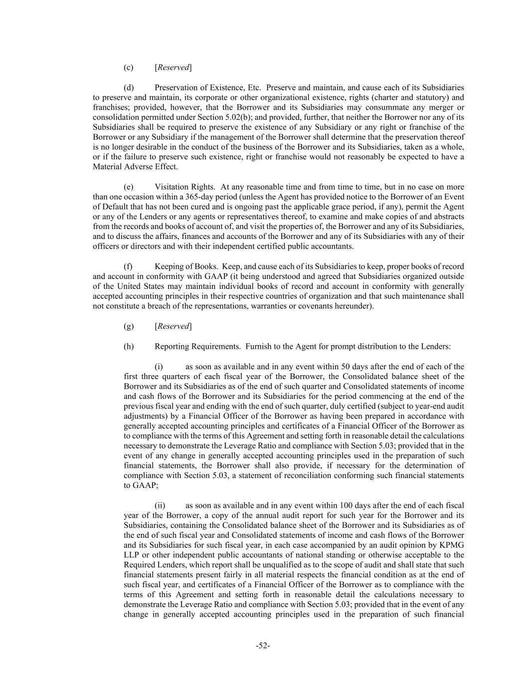 -52- (c) [Reserved] (d) Preservation of Existence, Etc. Preserve and maintain, and cause each of its Subsidiaries to preserve and maintain, its corporate or other organizational existence, rights (charter and statutory) and franchises; provided, however, that the Borrower and its Subsidiaries may consummate any merger or consolidation permitted under Section 5.02(b); and provided, further, that neither the Borrower nor any of its Subsidiaries shall be required to preserve the existence of any Subsidiary or any right or franchise of the Borrower or any Subsidiary if the management of the Borrower shall determine that the preservation thereof is no longer desirable in the conduct of the business of the Borrower and its Subsidiaries, taken as a whole, or if the failure to preserve such existence, right or franchise would not reasonably be expected to have a Material Adverse Effect. (e) Visitation Rights. At any reasonable time and from time to time, but in no case on more than one occasion within a 365-day period (unless the Agent has provided notice to the Borrower of an Event of Default that has not been cured and is ongoing past the applicable grace period, if any), permit the Agent or any of the Lenders or any agents or representatives thereof, to examine and make copies of and abstracts from the records and books of account of, and visit the properties of, the Borrower and any of its Subsidiaries, and to discuss the affairs, finances and accounts of the Borrower and any of its Subsidiaries with any of their officers or directors and with their independent certified public accountants. (f) Keeping of Books. Keep, and cause each of its Subsidiaries to keep, proper books of record and account in conformity with GAAP (it being understood and agreed that Subsidiaries organized outside of the United States may maintain individual books of record and account in conformity with generally accepted accounting principles in their respective countries of organization and that such maintenance shall not constitute a breach of the representations, warranties or covenants hereunder). (g) [Reserved] (h) Reporting Requirements. Furnish to the Agent for prompt distribution to the Lenders: (i) as soon as available and in any event within 50 days after the end of each of the first three quarters of each fiscal year of the Borrower, the Consolidated balance sheet of the Borrower and its Subsidiaries as of the end of such quarter and Consolidated statements of income and cash flows of the Borrower and its Subsidiaries for the period commencing at the end of the previous fiscal year and ending with the end of such quarter, duly certified (subject to year-end audit adjustments) by a Financial Officer of the Borrower as having been prepared in accordance with generally accepted accounting principles and certificates of a Financial Officer of the Borrower as to compliance with the terms of this Agreement and setting forth in reasonable detail the calculations necessary to demonstrate the Leverage Ratio and compliance with Section 5.03; provided that in the event of any change in generally accepted accounting principles used in the preparation of such financial statements, the Borrower shall also provide, if necessary for the determination of compliance with Section 5.03, a statement of reconciliation conforming such financial statements to GAAP; (ii) as soon as available and in any event within 100 days after the end of each fiscal year of the Borrower, a copy of the annual audit report for such year for the Borrower and its Subsidiaries, containing the Consolidated balance sheet of the Borrower and its Subsidiaries as of the end of such fiscal year and Consolidated statements of income and cash flows of the Borrower and its Subsidiaries for such fiscal year, in each case accompanied by an audit opinion by KPMG LLP or other independent public accountants of national standing or otherwise acceptable to the Required Lenders, which report shall be unqualified as to the scope of audit and shall state that such financial statements present fairly in all material respects the financial condition as at the end of such fiscal year, and certificates of a Financial Officer of the Borrower as to compliance with the terms of this Agreement and setting forth in reasonable detail the calculations necessary to demonstrate the Leverage Ratio and compliance with Section 5.03; provided that in the event of any change in generally accepted accounting principles used in the preparation of such financial
