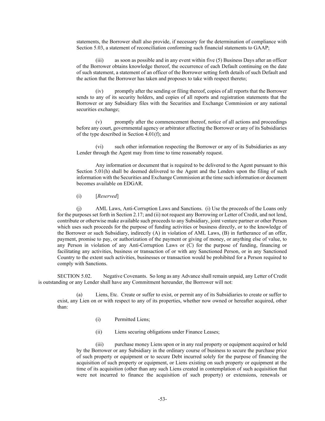 -53- statements, the Borrower shall also provide, if necessary for the determination of compliance with Section 5.03, a statement of reconciliation conforming such financial statements to GAAP; (iii) as soon as possible and in any event within five (5) Business Days after an officer of the Borrower obtains knowledge thereof, the occurrence of each Default continuing on the date of such statement, a statement of an officer of the Borrower setting forth details of such Default and the action that the Borrower has taken and proposes to take with respect thereto; (iv) promptly after the sending or filing thereof, copies of all reports that the Borrower sends to any of its security holders, and copies of all reports and registration statements that the Borrower or any Subsidiary files with the Securities and Exchange Commission or any national securities exchange; (v) promptly after the commencement thereof, notice of all actions and proceedings before any court, governmental agency or arbitrator affecting the Borrower or any of its Subsidiaries of the type described in Section 4.01(f); and (vi) such other information respecting the Borrower or any of its Subsidiaries as any Lender through the Agent may from time to time reasonably request. Any information or document that is required to be delivered to the Agent pursuant to this Section 5.01(h) shall be deemed delivered to the Agent and the Lenders upon the filing of such information with the Securities and Exchange Commission at the time such information or document becomes available on EDGAR. (i) [Reserved] (j) AML Laws, Anti-Corruption Laws and Sanctions. (i) Use the proceeds of the Loans only for the purposes set forth in Section 2.17; and (ii) not request any Borrowing or Letter of Credit, and not lend, contribute or otherwise make available such proceeds to any Subsidiary, joint venture partner or other Person which uses such proceeds for the purpose of funding activities or business directly, or to the knowledge of the Borrower or such Subsidiary, indirectly (A) in violation of AML Laws, (B) in furtherance of an offer, payment, promise to pay, or authorization of the payment or giving of money, or anything else of value, to any Person in violation of any Anti-Corruption Laws or (C) for the purpose of funding, financing or facilitating any activities, business or transaction of or with any Sanctioned Person, or in any Sanctioned Country to the extent such activities, businesses or transaction would be prohibited for a Person required to comply with Sanctions. SECTION 5.02. Negative Covenants. So long as any Advance shall remain unpaid, any Letter of Credit is outstanding or any Lender shall have any Commitment hereunder, the Borrower will not: (a) Liens, Etc. Create or suffer to exist, or permit any of its Subsidiaries to create or suffer to exist, any Lien on or with respect to any of its properties, whether now owned or hereafter acquired, other than: (i) Permitted Liens; (ii) Liens securing obligations under Finance Leases; (iii) purchase money Liens upon or in any real property or equipment acquired or held by the Borrower or any Subsidiary in the ordinary course of business to secure the purchase price of such property or equipment or to secure Debt incurred solely for the purpose of financing the acquisition of such property or equipment, or Liens existing on such property or equipment at the time of its acquisition (other than any such Liens created in contemplation of such acquisition that were not incurred to finance the acquisition of such property) or extensions, renewals or