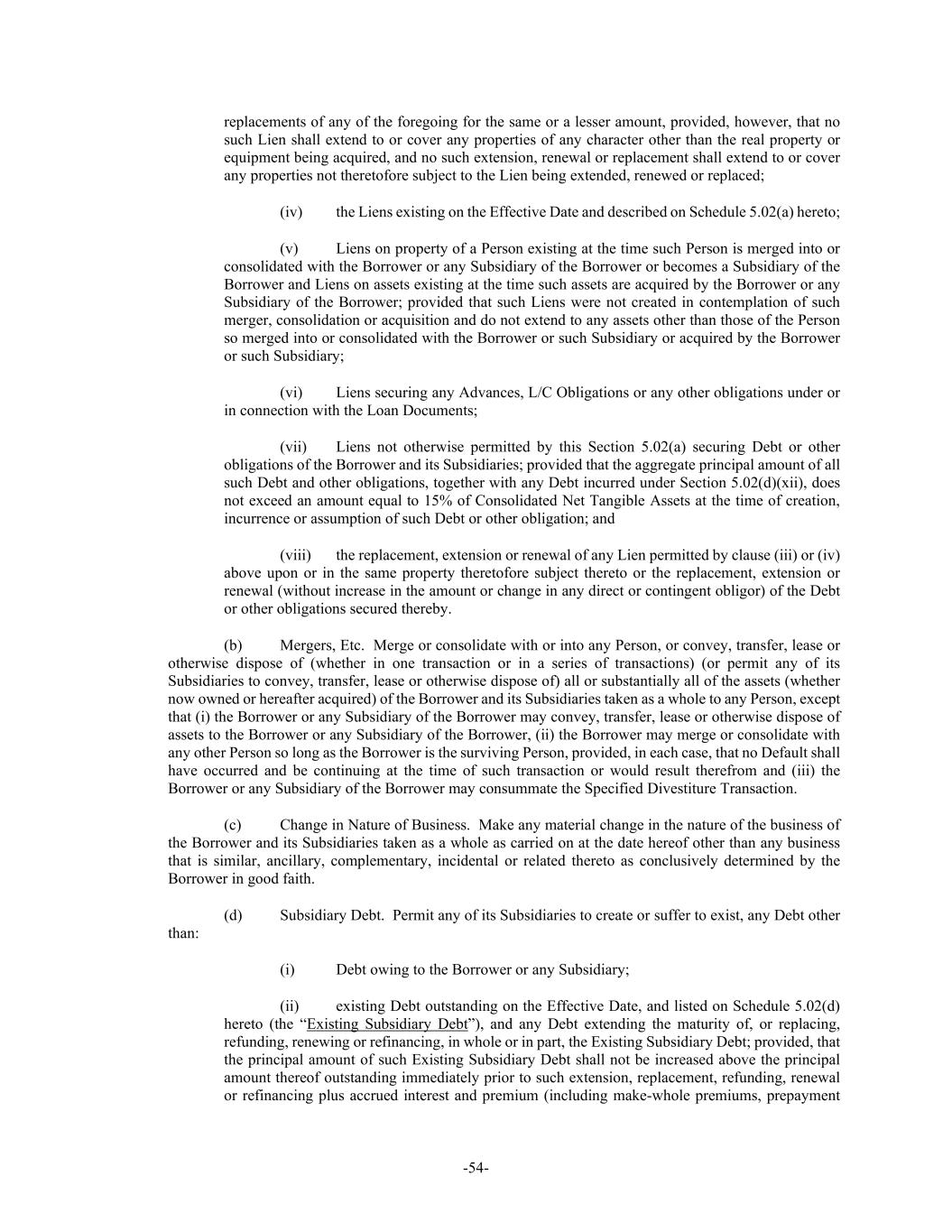 -54- replacements of any of the foregoing for the same or a lesser amount, provided, however, that no such Lien shall extend to or cover any properties of any character other than the real property or equipment being acquired, and no such extension, renewal or replacement shall extend to or cover any properties not theretofore subject to the Lien being extended, renewed or replaced; (iv) the Liens existing on the Effective Date and described on Schedule 5.02(a) hereto; (v) Liens on property of a Person existing at the time such Person is merged into or consolidated with the Borrower or any Subsidiary of the Borrower or becomes a Subsidiary of the Borrower and Liens on assets existing at the time such assets are acquired by the Borrower or any Subsidiary of the Borrower; provided that such Liens were not created in contemplation of such merger, consolidation or acquisition and do not extend to any assets other than those of the Person so merged into or consolidated with the Borrower or such Subsidiary or acquired by the Borrower or such Subsidiary; (vi) Liens securing any Advances, L/C Obligations or any other obligations under or in connection with the Loan Documents; (vii) Liens not otherwise permitted by this Section 5.02(a) securing Debt or other obligations of the Borrower and its Subsidiaries; provided that the aggregate principal amount of all such Debt and other obligations, together with any Debt incurred under Section 5.02(d)(xii), does not exceed an amount equal to 15% of Consolidated Net Tangible Assets at the time of creation, incurrence or assumption of such Debt or other obligation; and (viii) the replacement, extension or renewal of any Lien permitted by clause (iii) or (iv) above upon or in the same property theretofore subject thereto or the replacement, extension or renewal (without increase in the amount or change in any direct or contingent obligor) of the Debt or other obligations secured thereby. (b) Mergers, Etc. Merge or consolidate with or into any Person, or convey, transfer, lease or otherwise dispose of (whether in one transaction or in a series of transactions) (or permit any of its Subsidiaries to convey, transfer, lease or otherwise dispose of) all or substantially all of the assets (whether now owned or hereafter acquired) of the Borrower and its Subsidiaries taken as a whole to any Person, except that (i) the Borrower or any Subsidiary of the Borrower may convey, transfer, lease or otherwise dispose of assets to the Borrower or any Subsidiary of the Borrower, (ii) the Borrower may merge or consolidate with any other Person so long as the Borrower is the surviving Person, provided, in each case, that no Default shall have occurred and be continuing at the time of such transaction or would result therefrom and (iii) the Borrower or any Subsidiary of the Borrower may consummate the Specified Divestiture Transaction. (c) Change in Nature of Business. Make any material change in the nature of the business of the Borrower and its Subsidiaries taken as a whole as carried on at the date hereof other than any business that is similar, ancillary, complementary, incidental or related thereto as conclusively determined by the Borrower in good faith. (d) Subsidiary Debt. Permit any of its Subsidiaries to create or suffer to exist, any Debt other than: (i) Debt owing to the Borrower or any Subsidiary; (ii) existing Debt outstanding on the Effective Date, and listed on Schedule 5.02(d) hereto (the “Existing Subsidiary Debt”), and any Debt extending the maturity of, or replacing, refunding, renewing or refinancing, in whole or in part, the Existing Subsidiary Debt; provided, that the principal amount of such Existing Subsidiary Debt shall not be increased above the principal amount thereof outstanding immediately prior to such extension, replacement, refunding, renewal or refinancing plus accrued interest and premium (including make-whole premiums, prepayment