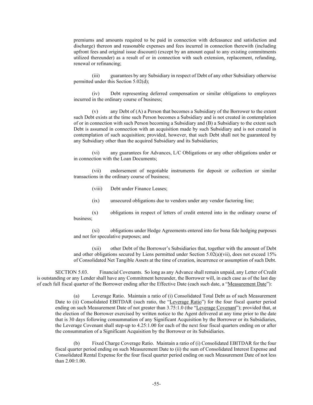 -55- premiums and amounts required to be paid in connection with defeasance and satisfaction and discharge) thereon and reasonable expenses and fees incurred in connection therewith (including upfront fees and original issue discount) (except by an amount equal to any existing commitments utilized thereunder) as a result of or in connection with such extension, replacement, refunding, renewal or refinancing; (iii) guarantees by any Subsidiary in respect of Debt of any other Subsidiary otherwise permitted under this Section 5.02(d); (iv) Debt representing deferred compensation or similar obligations to employees incurred in the ordinary course of business; (v) any Debt of (A) a Person that becomes a Subsidiary of the Borrower to the extent such Debt exists at the time such Person becomes a Subsidiary and is not created in contemplation of or in connection with such Person becoming a Subsidiary and (B) a Subsidiary to the extent such Debt is assumed in connection with an acquisition made by such Subsidiary and is not created in contemplation of such acquisition; provided, however, that such Debt shall not be guaranteed by any Subsidiary other than the acquired Subsidiary and its Subsidiaries; (vi) any guarantees for Advances, L/C Obligations or any other obligations under or in connection with the Loan Documents; (vii) endorsement of negotiable instruments for deposit or collection or similar transactions in the ordinary course of business; (viii) Debt under Finance Leases; (ix) unsecured obligations due to vendors under any vendor factoring line; (x) obligations in respect of letters of credit entered into in the ordinary course of business; (xi) obligations under Hedge Agreements entered into for bona fide hedging purposes and not for speculative purposes; and (xii) other Debt of the Borrower’s Subsidiaries that, together with the amount of Debt and other obligations secured by Liens permitted under Section 5.02(a)(vii), does not exceed 15% of Consolidated Net Tangible Assets at the time of creation, incurrence or assumption of such Debt. SECTION 5.03. Financial Covenants. So long as any Advance shall remain unpaid, any Letter of Credit is outstanding or any Lender shall have any Commitment hereunder, the Borrower will, in each case as of the last day of each full fiscal quarter of the Borrower ending after the Effective Date (each such date, a “Measurement Date”): (a) Leverage Ratio. Maintain a ratio of (i) Consolidated Total Debt as of such Measurement Date to (ii) Consolidated EBITDAR (such ratio, the “Leverage Ratio”) for the four fiscal quarter period ending on such Measurement Date of not greater than 3.75:1.0 (the “Leverage Covenant”); provided that, at the election of the Borrower exercised by written notice to the Agent delivered at any time prior to the date that is 30 days following consummation of any Significant Acquisition by the Borrower or its Subsidiaries, the Leverage Covenant shall step-up to 4.25:1.00 for each of the next four fiscal quarters ending on or after the consummation of a Significant Acquisition by the Borrower or its Subsidiaries. (b) Fixed Charge Coverage Ratio. Maintain a ratio of (i) Consolidated EBITDAR for the four fiscal quarter period ending on such Measurement Date to (ii) the sum of Consolidated Interest Expense and Consolidated Rental Expense for the four fiscal quarter period ending on such Measurement Date of not less than 2.00:1.00.