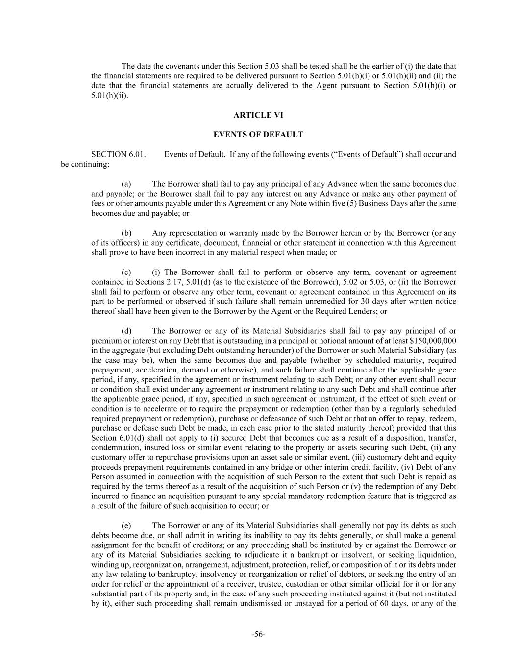 -56- The date the covenants under this Section 5.03 shall be tested shall be the earlier of (i) the date that the financial statements are required to be delivered pursuant to Section 5.01(h)(i) or 5.01(h)(ii) and (ii) the date that the financial statements are actually delivered to the Agent pursuant to Section 5.01(h)(i) or 5.01(h)(ii). ARTICLE VI EVENTS OF DEFAULT SECTION 6.01. Events of Default. If any of the following events (“Events of Default”) shall occur and be continuing: (a) The Borrower shall fail to pay any principal of any Advance when the same becomes due and payable; or the Borrower shall fail to pay any interest on any Advance or make any other payment of fees or other amounts payable under this Agreement or any Note within five (5) Business Days after the same becomes due and payable; or (b) Any representation or warranty made by the Borrower herein or by the Borrower (or any of its officers) in any certificate, document, financial or other statement in connection with this Agreement shall prove to have been incorrect in any material respect when made; or (c) (i) The Borrower shall fail to perform or observe any term, covenant or agreement contained in Sections 2.17, 5.01(d) (as to the existence of the Borrower), 5.02 or 5.03, or (ii) the Borrower shall fail to perform or observe any other term, covenant or agreement contained in this Agreement on its part to be performed or observed if such failure shall remain unremedied for 30 days after written notice thereof shall have been given to the Borrower by the Agent or the Required Lenders; or (d) The Borrower or any of its Material Subsidiaries shall fail to pay any principal of or premium or interest on any Debt that is outstanding in a principal or notional amount of at least $150,000,000 in the aggregate (but excluding Debt outstanding hereunder) of the Borrower or such Material Subsidiary (as the case may be), when the same becomes due and payable (whether by scheduled maturity, required prepayment, acceleration, demand or otherwise), and such failure shall continue after the applicable grace period, if any, specified in the agreement or instrument relating to such Debt; or any other event shall occur or condition shall exist under any agreement or instrument relating to any such Debt and shall continue after the applicable grace period, if any, specified in such agreement or instrument, if the effect of such event or condition is to accelerate or to require the prepayment or redemption (other than by a regularly scheduled required prepayment or redemption), purchase or defeasance of such Debt or that an offer to repay, redeem, purchase or defease such Debt be made, in each case prior to the stated maturity thereof; provided that this Section 6.01(d) shall not apply to (i) secured Debt that becomes due as a result of a disposition, transfer, condemnation, insured loss or similar event relating to the property or assets securing such Debt, (ii) any customary offer to repurchase provisions upon an asset sale or similar event, (iii) customary debt and equity proceeds prepayment requirements contained in any bridge or other interim credit facility, (iv) Debt of any Person assumed in connection with the acquisition of such Person to the extent that such Debt is repaid as required by the terms thereof as a result of the acquisition of such Person or (v) the redemption of any Debt incurred to finance an acquisition pursuant to any special mandatory redemption feature that is triggered as a result of the failure of such acquisition to occur; or (e) The Borrower or any of its Material Subsidiaries shall generally not pay its debts as such debts become due, or shall admit in writing its inability to pay its debts generally, or shall make a general assignment for the benefit of creditors; or any proceeding shall be instituted by or against the Borrower or any of its Material Subsidiaries seeking to adjudicate it a bankrupt or insolvent, or seeking liquidation, winding up, reorganization, arrangement, adjustment, protection, relief, or composition of it or its debts under any law relating to bankruptcy, insolvency or reorganization or relief of debtors, or seeking the entry of an order for relief or the appointment of a receiver, trustee, custodian or other similar official for it or for any substantial part of its property and, in the case of any such proceeding instituted against it (but not instituted by it), either such proceeding shall remain undismissed or unstayed for a period of 60 days, or any of the