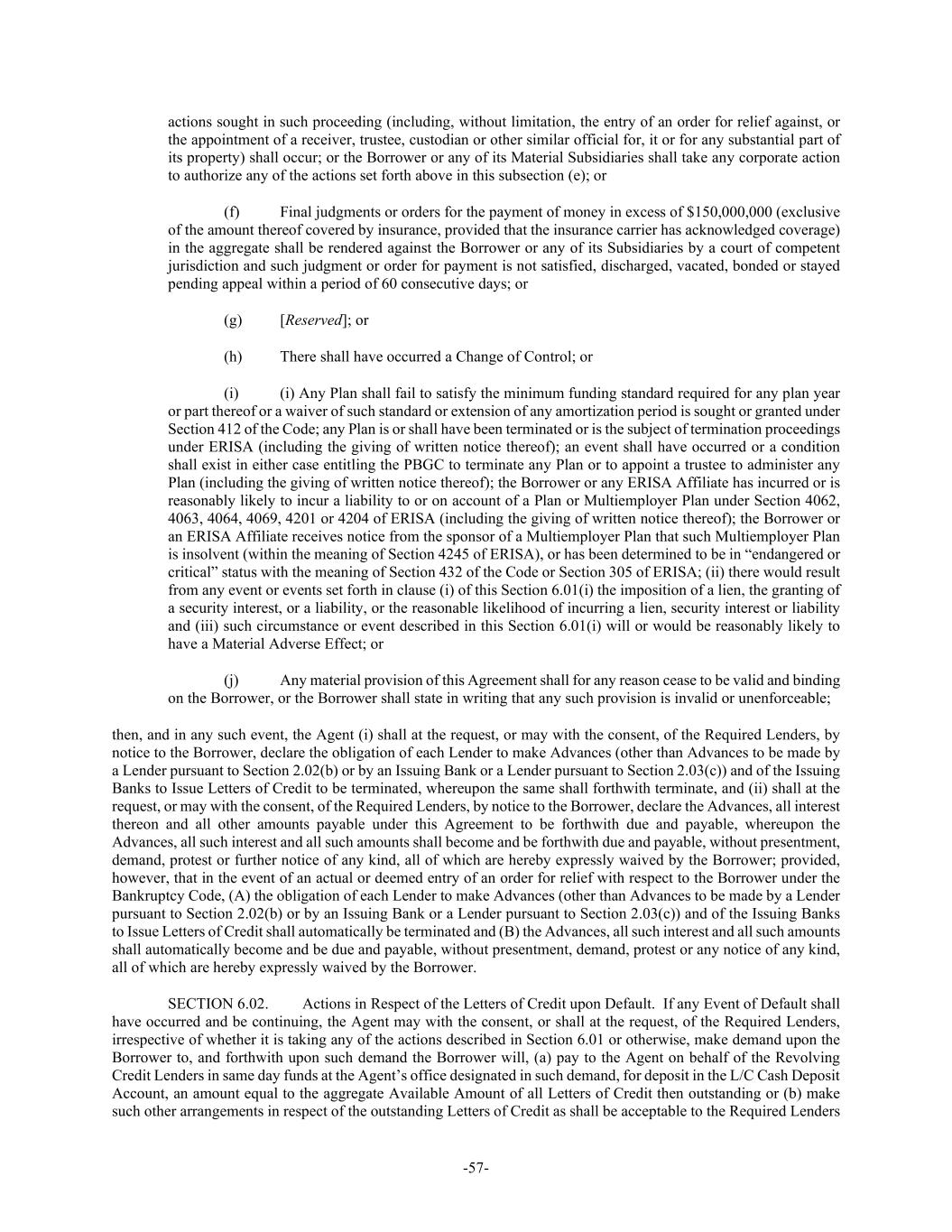 -57- actions sought in such proceeding (including, without limitation, the entry of an order for relief against, or the appointment of a receiver, trustee, custodian or other similar official for, it or for any substantial part of its property) shall occur; or the Borrower or any of its Material Subsidiaries shall take any corporate action to authorize any of the actions set forth above in this subsection (e); or (f) Final judgments or orders for the payment of money in excess of $150,000,000 (exclusive of the amount thereof covered by insurance, provided that the insurance carrier has acknowledged coverage) in the aggregate shall be rendered against the Borrower or any of its Subsidiaries by a court of competent jurisdiction and such judgment or order for payment is not satisfied, discharged, vacated, bonded or stayed pending appeal within a period of 60 consecutive days; or (g) [Reserved]; or (h) There shall have occurred a Change of Control; or (i) (i) Any Plan shall fail to satisfy the minimum funding standard required for any plan year or part thereof or a waiver of such standard or extension of any amortization period is sought or granted under Section 412 of the Code; any Plan is or shall have been terminated or is the subject of termination proceedings under ERISA (including the giving of written notice thereof); an event shall have occurred or a condition shall exist in either case entitling the PBGC to terminate any Plan or to appoint a trustee to administer any Plan (including the giving of written notice thereof); the Borrower or any ERISA Affiliate has incurred or is reasonably likely to incur a liability to or on account of a Plan or Multiemployer Plan under Section 4062, 4063, 4064, 4069, 4201 or 4204 of ERISA (including the giving of written notice thereof); the Borrower or an ERISA Affiliate receives notice from the sponsor of a Multiemployer Plan that such Multiemployer Plan is insolvent (within the meaning of Section 4245 of ERISA), or has been determined to be in “endangered or critical” status with the meaning of Section 432 of the Code or Section 305 of ERISA; (ii) there would result from any event or events set forth in clause (i) of this Section 6.01(i) the imposition of a lien, the granting of a security interest, or a liability, or the reasonable likelihood of incurring a lien, security interest or liability and (iii) such circumstance or event described in this Section 6.01(i) will or would be reasonably likely to have a Material Adverse Effect; or (j) Any material provision of this Agreement shall for any reason cease to be valid and binding on the Borrower, or the Borrower shall state in writing that any such provision is invalid or unenforceable; then, and in any such event, the Agent (i) shall at the request, or may with the consent, of the Required Lenders, by notice to the Borrower, declare the obligation of each Lender to make Advances (other than Advances to be made by a Lender pursuant to Section 2.02(b) or by an Issuing Bank or a Lender pursuant to Section 2.03(c)) and of the Issuing Banks to Issue Letters of Credit to be terminated, whereupon the same shall forthwith terminate, and (ii) shall at the request, or may with the consent, of the Required Lenders, by notice to the Borrower, declare the Advances, all interest thereon and all other amounts payable under this Agreement to be forthwith due and payable, whereupon the Advances, all such interest and all such amounts shall become and be forthwith due and payable, without presentment, demand, protest or further notice of any kind, all of which are hereby expressly waived by the Borrower; provided, however, that in the event of an actual or deemed entry of an order for relief with respect to the Borrower under the Bankruptcy Code, (A) the obligation of each Lender to make Advances (other than Advances to be made by a Lender pursuant to Section 2.02(b) or by an Issuing Bank or a Lender pursuant to Section 2.03(c)) and of the Issuing Banks to Issue Letters of Credit shall automatically be terminated and (B) the Advances, all such interest and all such amounts shall automatically become and be due and payable, without presentment, demand, protest or any notice of any kind, all of which are hereby expressly waived by the Borrower. SECTION 6.02. Actions in Respect of the Letters of Credit upon Default. If any Event of Default shall have occurred and be continuing, the Agent may with the consent, or shall at the request, of the Required Lenders, irrespective of whether it is taking any of the actions described in Section 6.01 or otherwise, make demand upon the Borrower to, and forthwith upon such demand the Borrower will, (a) pay to the Agent on behalf of the Revolving Credit Lenders in same day funds at the Agent’s office designated in such demand, for deposit in the L/C Cash Deposit Account, an amount equal to the aggregate Available Amount of all Letters of Credit then outstanding or (b) make such other arrangements in respect of the outstanding Letters of Credit as shall be acceptable to the Required Lenders