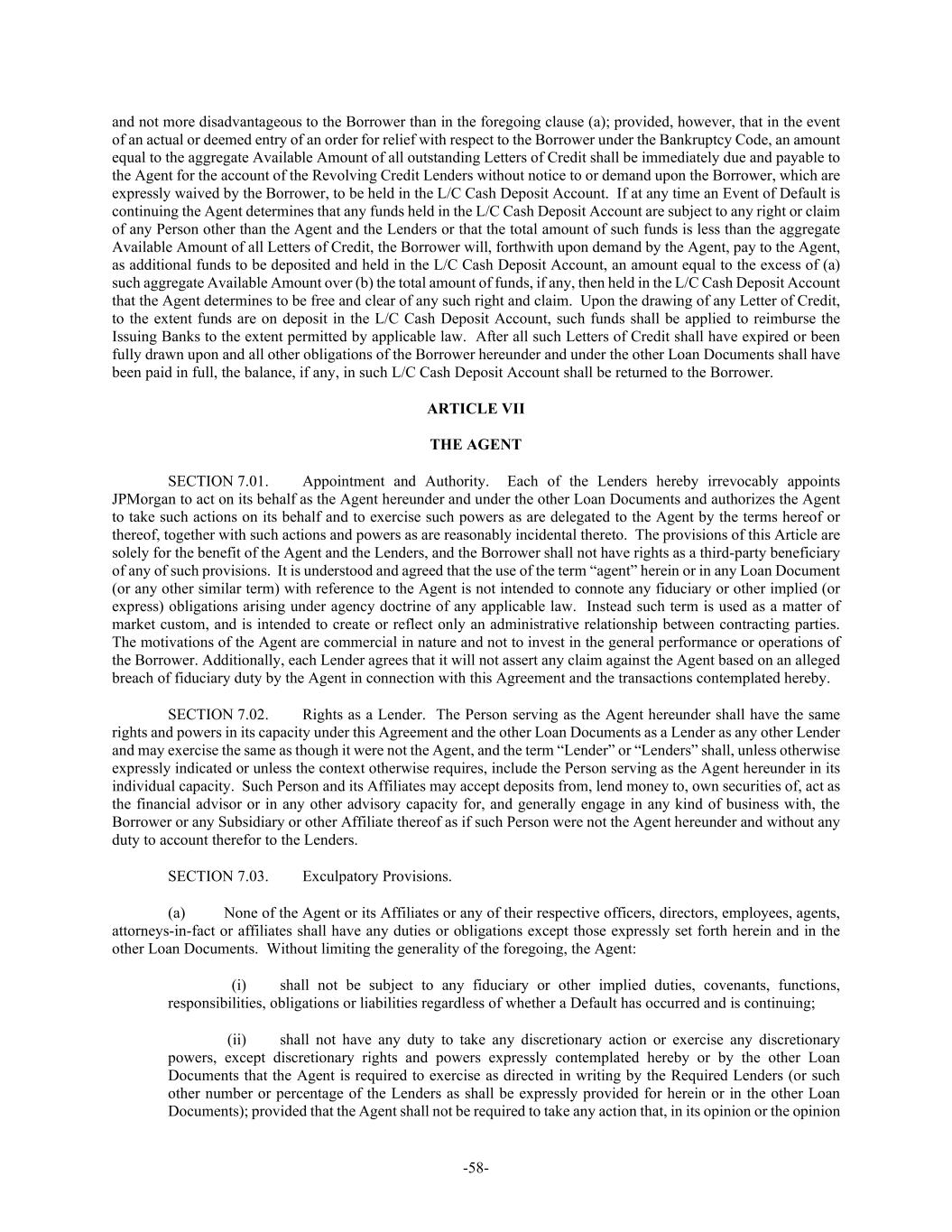 -58- and not more disadvantageous to the Borrower than in the foregoing clause (a); provided, however, that in the event of an actual or deemed entry of an order for relief with respect to the Borrower under the Bankruptcy Code, an amount equal to the aggregate Available Amount of all outstanding Letters of Credit shall be immediately due and payable to the Agent for the account of the Revolving Credit Lenders without notice to or demand upon the Borrower, which are expressly waived by the Borrower, to be held in the L/C Cash Deposit Account. If at any time an Event of Default is continuing the Agent determines that any funds held in the L/C Cash Deposit Account are subject to any right or claim of any Person other than the Agent and the Lenders or that the total amount of such funds is less than the aggregate Available Amount of all Letters of Credit, the Borrower will, forthwith upon demand by the Agent, pay to the Agent, as additional funds to be deposited and held in the L/C Cash Deposit Account, an amount equal to the excess of (a) such aggregate Available Amount over (b) the total amount of funds, if any, then held in the L/C Cash Deposit Account that the Agent determines to be free and clear of any such right and claim. Upon the drawing of any Letter of Credit, to the extent funds are on deposit in the L/C Cash Deposit Account, such funds shall be applied to reimburse the Issuing Banks to the extent permitted by applicable law. After all such Letters of Credit shall have expired or been fully drawn upon and all other obligations of the Borrower hereunder and under the other Loan Documents shall have been paid in full, the balance, if any, in such L/C Cash Deposit Account shall be returned to the Borrower. ARTICLE VII THE AGENT SECTION 7.01. Appointment and Authority. Each of the Lenders hereby irrevocably appoints JPMorgan to act on its behalf as the Agent hereunder and under the other Loan Documents and authorizes the Agent to take such actions on its behalf and to exercise such powers as are delegated to the Agent by the terms hereof or thereof, together with such actions and powers as are reasonably incidental thereto. The provisions of this Article are solely for the benefit of the Agent and the Lenders, and the Borrower shall not have rights as a third-party beneficiary of any of such provisions. It is understood and agreed that the use of the term “agent” herein or in any Loan Document (or any other similar term) with reference to the Agent is not intended to connote any fiduciary or other implied (or express) obligations arising under agency doctrine of any applicable law. Instead such term is used as a matter of market custom, and is intended to create or reflect only an administrative relationship between contracting parties. The motivations of the Agent are commercial in nature and not to invest in the general performance or operations of the Borrower. Additionally, each Lender agrees that it will not assert any claim against the Agent based on an alleged breach of fiduciary duty by the Agent in connection with this Agreement and the transactions contemplated hereby. SECTION 7.02. Rights as a Lender. The Person serving as the Agent hereunder shall have the same rights and powers in its capacity under this Agreement and the other Loan Documents as a Lender as any other Lender and may exercise the same as though it were not the Agent, and the term “Lender” or “Lenders” shall, unless otherwise expressly indicated or unless the context otherwise requires, include the Person serving as the Agent hereunder in its individual capacity. Such Person and its Affiliates may accept deposits from, lend money to, own securities of, act as the financial advisor or in any other advisory capacity for, and generally engage in any kind of business with, the Borrower or any Subsidiary or other Affiliate thereof as if such Person were not the Agent hereunder and without any duty to account therefor to the Lenders. SECTION 7.03. Exculpatory Provisions. (a) None of the Agent or its Affiliates or any of their respective officers, directors, employees, agents, attorneys-in-fact or affiliates shall have any duties or obligations except those expressly set forth herein and in the other Loan Documents. Without limiting the generality of the foregoing, the Agent: (i) shall not be subject to any fiduciary or other implied duties, covenants, functions, responsibilities, obligations or liabilities regardless of whether a Default has occurred and is continuing; (ii) shall not have any duty to take any discretionary action or exercise any discretionary powers, except discretionary rights and powers expressly contemplated hereby or by the other Loan Documents that the Agent is required to exercise as directed in writing by the Required Lenders (or such other number or percentage of the Lenders as shall be expressly provided for herein or in the other Loan Documents); provided that the Agent shall not be required to take any action that, in its opinion or the opinion
