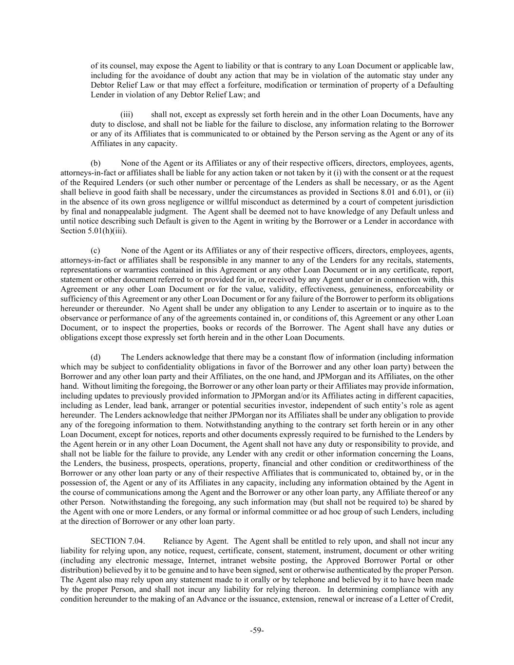 -59- of its counsel, may expose the Agent to liability or that is contrary to any Loan Document or applicable law, including for the avoidance of doubt any action that may be in violation of the automatic stay under any Debtor Relief Law or that may effect a forfeiture, modification or termination of property of a Defaulting Lender in violation of any Debtor Relief Law; and (iii) shall not, except as expressly set forth herein and in the other Loan Documents, have any duty to disclose, and shall not be liable for the failure to disclose, any information relating to the Borrower or any of its Affiliates that is communicated to or obtained by the Person serving as the Agent or any of its Affiliates in any capacity. (b) None of the Agent or its Affiliates or any of their respective officers, directors, employees, agents, attorneys-in-fact or affiliates shall be liable for any action taken or not taken by it (i) with the consent or at the request of the Required Lenders (or such other number or percentage of the Lenders as shall be necessary, or as the Agent shall believe in good faith shall be necessary, under the circumstances as provided in Sections 8.01 and 6.01), or (ii) in the absence of its own gross negligence or willful misconduct as determined by a court of competent jurisdiction by final and nonappealable judgment. The Agent shall be deemed not to have knowledge of any Default unless and until notice describing such Default is given to the Agent in writing by the Borrower or a Lender in accordance with Section 5.01(h)(iii). (c) None of the Agent or its Affiliates or any of their respective officers, directors, employees, agents, attorneys-in-fact or affiliates shall be responsible in any manner to any of the Lenders for any recitals, statements, representations or warranties contained in this Agreement or any other Loan Document or in any certificate, report, statement or other document referred to or provided for in, or received by any Agent under or in connection with, this Agreement or any other Loan Document or for the value, validity, effectiveness, genuineness, enforceability or sufficiency of this Agreement or any other Loan Document or for any failure of the Borrower to perform its obligations hereunder or thereunder. No Agent shall be under any obligation to any Lender to ascertain or to inquire as to the observance or performance of any of the agreements contained in, or conditions of, this Agreement or any other Loan Document, or to inspect the properties, books or records of the Borrower. The Agent shall have any duties or obligations except those expressly set forth herein and in the other Loan Documents. (d) The Lenders acknowledge that there may be a constant flow of information (including information which may be subject to confidentiality obligations in favor of the Borrower and any other loan party) between the Borrower and any other loan party and their Affiliates, on the one hand, and JPMorgan and its Affiliates, on the other hand. Without limiting the foregoing, the Borrower or any other loan party or their Affiliates may provide information, including updates to previously provided information to JPMorgan and/or its Affiliates acting in different capacities, including as Lender, lead bank, arranger or potential securities investor, independent of such entity’s role as agent hereunder. The Lenders acknowledge that neither JPMorgan nor its Affiliates shall be under any obligation to provide any of the foregoing information to them. Notwithstanding anything to the contrary set forth herein or in any other Loan Document, except for notices, reports and other documents expressly required to be furnished to the Lenders by the Agent herein or in any other Loan Document, the Agent shall not have any duty or responsibility to provide, and shall not be liable for the failure to provide, any Lender with any credit or other information concerning the Loans, the Lenders, the business, prospects, operations, property, financial and other condition or creditworthiness of the Borrower or any other loan party or any of their respective Affiliates that is communicated to, obtained by, or in the possession of, the Agent or any of its Affiliates in any capacity, including any information obtained by the Agent in the course of communications among the Agent and the Borrower or any other loan party, any Affiliate thereof or any other Person. Notwithstanding the foregoing, any such information may (but shall not be required to) be shared by the Agent with one or more Lenders, or any formal or informal committee or ad hoc group of such Lenders, including at the direction of Borrower or any other loan party. SECTION 7.04. Reliance by Agent. The Agent shall be entitled to rely upon, and shall not incur any liability for relying upon, any notice, request, certificate, consent, statement, instrument, document or other writing (including any electronic message, Internet, intranet website posting, the Approved Borrower Portal or other distribution) believed by it to be genuine and to have been signed, sent or otherwise authenticated by the proper Person. The Agent also may rely upon any statement made to it orally or by telephone and believed by it to have been made by the proper Person, and shall not incur any liability for relying thereon. In determining compliance with any condition hereunder to the making of an Advance or the issuance, extension, renewal or increase of a Letter of Credit,