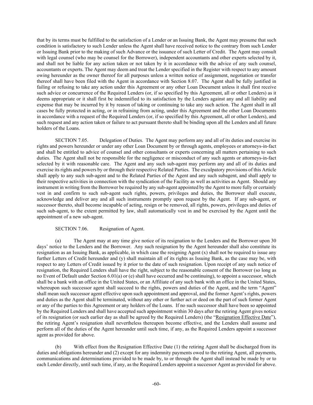 -60- that by its terms must be fulfilled to the satisfaction of a Lender or an Issuing Bank, the Agent may presume that such condition is satisfactory to such Lender unless the Agent shall have received notice to the contrary from such Lender or Issuing Bank prior to the making of such Advance or the issuance of such Letter of Credit. The Agent may consult with legal counsel (who may be counsel for the Borrower), independent accountants and other experts selected by it, and shall not be liable for any action taken or not taken by it in accordance with the advice of any such counsel, accountants or experts. The Agent may deem and treat the Lender specified in the Register with respect to any amount owing hereunder as the owner thereof for all purposes unless a written notice of assignment, negotiation or transfer thereof shall have been filed with the Agent in accordance with Section 8.07. The Agent shall be fully justified in failing or refusing to take any action under this Agreement or any other Loan Document unless it shall first receive such advice or concurrence of the Required Lenders (or, if so specified by this Agreement, all or other Lenders) as it deems appropriate or it shall first be indemnified to its satisfaction by the Lenders against any and all liability and expense that may be incurred by it by reason of taking or continuing to take any such action. The Agent shall in all cases be fully protected in acting, or in refraining from acting, under this Agreement and the other Loan Documents in accordance with a request of the Required Lenders (or, if so specified by this Agreement, all or other Lenders), and such request and any action taken or failure to act pursuant thereto shall be binding upon all the Lenders and all future holders of the Loans. SECTION 7.05. Delegation of Duties. The Agent may perform any and all of its duties and exercise its rights and powers hereunder or under any other Loan Document by or through agents, employees or attorneys-in-fact and shall be entitled to advice of counsel and other consultants or experts concerning all matters pertaining to such duties. The Agent shall not be responsible for the negligence or misconduct of any such agents or attorneys-in-fact selected by it with reasonable care. The Agent and any such sub-agent may perform any and all of its duties and exercise its rights and powers by or through their respective Related Parties. The exculpatory provisions of this Article shall apply to any such sub-agent and to the Related Parties of the Agent and any such subagent, and shall apply to their respective activities in connection with the syndication of the Facility as well as activities as Agent. Should any instrument in writing from the Borrower be required by any sub-agent appointed by the Agent to more fully or certainly vest in and confirm to such sub-agent such rights, powers, privileges and duties, the Borrower shall execute, acknowledge and deliver any and all such instruments promptly upon request by the Agent. If any sub-agent, or successor thereto, shall become incapable of acting, resign or be removed, all rights, powers, privileges and duties of such sub-agent, to the extent permitted by law, shall automatically vest in and be exercised by the Agent until the appointment of a new sub-agent. SECTION 7.06. Resignation of Agent. (a) The Agent may at any time give notice of its resignation to the Lenders and the Borrower upon 30 days’ notice to the Lenders and the Borrower. Any such resignation by the Agent hereunder shall also constitute its resignation as an Issuing Bank, as applicable, in which case the resigning Agent (x) shall not be required to issue any further Letters of Credit hereunder and (y) shall maintain all of its rights as Issuing Bank, as the case may be, with respect to any Letters of Credit issued by it prior to the date of such resignation. Upon receipt of any such notice of resignation, the Required Lenders shall have the right, subject to the reasonable consent of the Borrower (so long as no Event of Default under Section 6.01(a) or (e) shall have occurred and be continuing), to appoint a successor, which shall be a bank with an office in the United States, or an Affiliate of any such bank with an office in the United States, whereupon such successor agent shall succeed to the rights, powers and duties of the Agent, and the term “Agent” shall mean such successor agent effective upon such appointment and approval, and the former Agent’s rights, powers and duties as the Agent shall be terminated, without any other or further act or deed on the part of such former Agent or any of the parties to this Agreement or any holders of the Loans. If no such successor shall have been so appointed by the Required Lenders and shall have accepted such appointment within 30 days after the retiring Agent gives notice of its resignation (or such earlier day as shall be agreed by the Required Lenders) (the “Resignation Effective Date”), the retiring Agent’s resignation shall nevertheless thereupon become effective, and the Lenders shall assume and perform all of the duties of the Agent hereunder until such time, if any, as the Required Lenders appoint a successor agent as provided for above. (b) With effect from the Resignation Effective Date (1) the retiring Agent shall be discharged from its duties and obligations hereunder and (2) except for any indemnity payments owed to the retiring Agent, all payments, communications and determinations provided to be made by, to or through the Agent shall instead be made by or to each Lender directly, until such time, if any, as the Required Lenders appoint a successor Agent as provided for above.