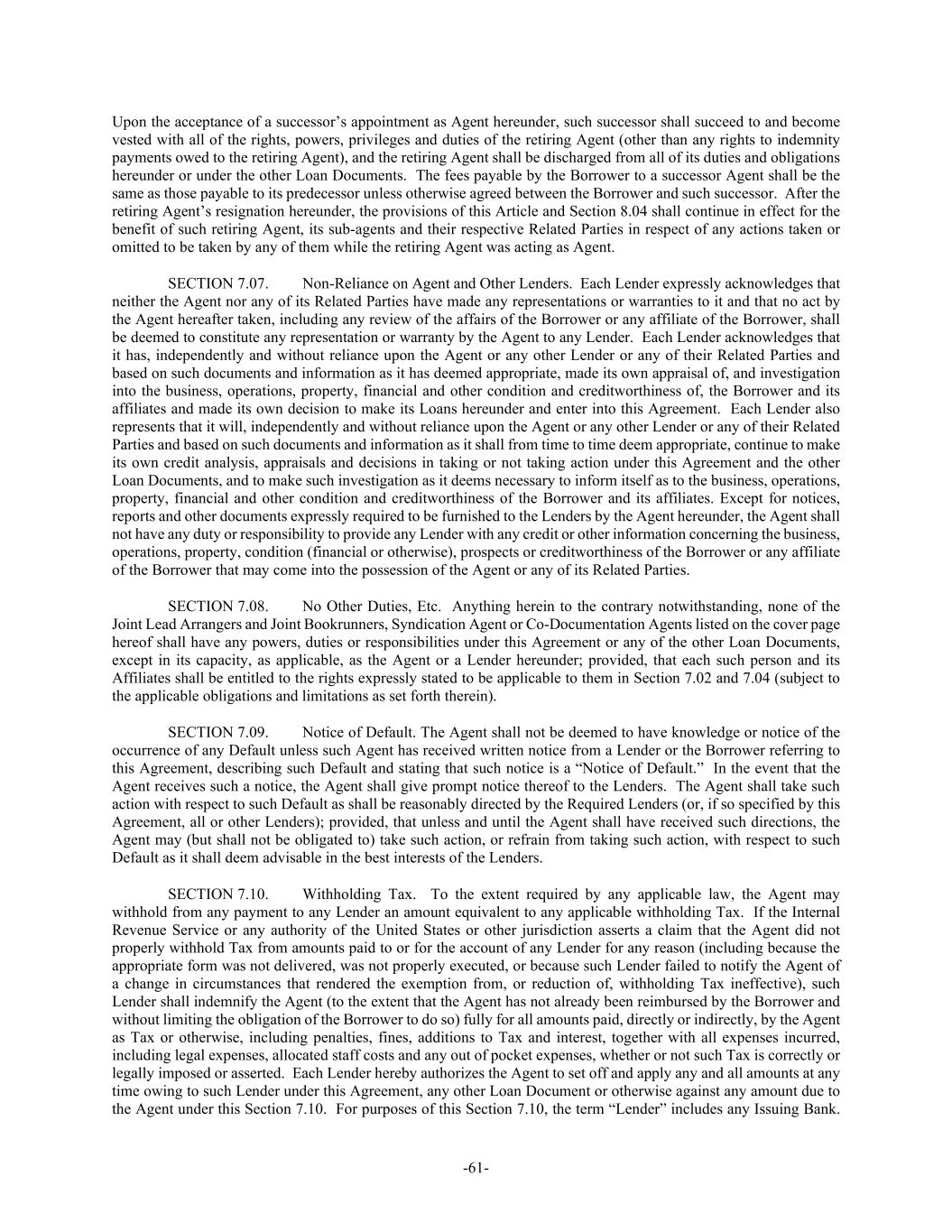 -61- Upon the acceptance of a successor’s appointment as Agent hereunder, such successor shall succeed to and become vested with all of the rights, powers, privileges and duties of the retiring Agent (other than any rights to indemnity payments owed to the retiring Agent), and the retiring Agent shall be discharged from all of its duties and obligations hereunder or under the other Loan Documents. The fees payable by the Borrower to a successor Agent shall be the same as those payable to its predecessor unless otherwise agreed between the Borrower and such successor. After the retiring Agent’s resignation hereunder, the provisions of this Article and Section 8.04 shall continue in effect for the benefit of such retiring Agent, its sub-agents and their respective Related Parties in respect of any actions taken or omitted to be taken by any of them while the retiring Agent was acting as Agent. SECTION 7.07. Non-Reliance on Agent and Other Lenders. Each Lender expressly acknowledges that neither the Agent nor any of its Related Parties have made any representations or warranties to it and that no act by the Agent hereafter taken, including any review of the affairs of the Borrower or any affiliate of the Borrower, shall be deemed to constitute any representation or warranty by the Agent to any Lender. Each Lender acknowledges that it has, independently and without reliance upon the Agent or any other Lender or any of their Related Parties and based on such documents and information as it has deemed appropriate, made its own appraisal of, and investigation into the business, operations, property, financial and other condition and creditworthiness of, the Borrower and its affiliates and made its own decision to make its Loans hereunder and enter into this Agreement. Each Lender also represents that it will, independently and without reliance upon the Agent or any other Lender or any of their Related Parties and based on such documents and information as it shall from time to time deem appropriate, continue to make its own credit analysis, appraisals and decisions in taking or not taking action under this Agreement and the other Loan Documents, and to make such investigation as it deems necessary to inform itself as to the business, operations, property, financial and other condition and creditworthiness of the Borrower and its affiliates. Except for notices, reports and other documents expressly required to be furnished to the Lenders by the Agent hereunder, the Agent shall not have any duty or responsibility to provide any Lender with any credit or other information concerning the business, operations, property, condition (financial or otherwise), prospects or creditworthiness of the Borrower or any affiliate of the Borrower that may come into the possession of the Agent or any of its Related Parties. SECTION 7.08. No Other Duties, Etc. Anything herein to the contrary notwithstanding, none of the Joint Lead Arrangers and Joint Bookrunners, Syndication Agent or Co-Documentation Agents listed on the cover page hereof shall have any powers, duties or responsibilities under this Agreement or any of the other Loan Documents, except in its capacity, as applicable, as the Agent or a Lender hereunder; provided, that each such person and its Affiliates shall be entitled to the rights expressly stated to be applicable to them in Section 7.02 and 7.04 (subject to the applicable obligations and limitations as set forth therein). SECTION 7.09. Notice of Default. The Agent shall not be deemed to have knowledge or notice of the occurrence of any Default unless such Agent has received written notice from a Lender or the Borrower referring to this Agreement, describing such Default and stating that such notice is a “Notice of Default.” In the event that the Agent receives such a notice, the Agent shall give prompt notice thereof to the Lenders. The Agent shall take such action with respect to such Default as shall be reasonably directed by the Required Lenders (or, if so specified by this Agreement, all or other Lenders); provided, that unless and until the Agent shall have received such directions, the Agent may (but shall not be obligated to) take such action, or refrain from taking such action, with respect to such Default as it shall deem advisable in the best interests of the Lenders. SECTION 7.10. Withholding Tax. To the extent required by any applicable law, the Agent may withhold from any payment to any Lender an amount equivalent to any applicable withholding Tax. If the Internal Revenue Service or any authority of the United States or other jurisdiction asserts a claim that the Agent did not properly withhold Tax from amounts paid to or for the account of any Lender for any reason (including because the appropriate form was not delivered, was not properly executed, or because such Lender failed to notify the Agent of a change in circumstances that rendered the exemption from, or reduction of, withholding Tax ineffective), such Lender shall indemnify the Agent (to the extent that the Agent has not already been reimbursed by the Borrower and without limiting the obligation of the Borrower to do so) fully for all amounts paid, directly or indirectly, by the Agent as Tax or otherwise, including penalties, fines, additions to Tax and interest, together with all expenses incurred, including legal expenses, allocated staff costs and any out of pocket expenses, whether or not such Tax is correctly or legally imposed or asserted. Each Lender hereby authorizes the Agent to set off and apply any and all amounts at any time owing to such Lender under this Agreement, any other Loan Document or otherwise against any amount due to the Agent under this Section 7.10. For purposes of this Section 7.10, the term “Lender” includes any Issuing Bank.