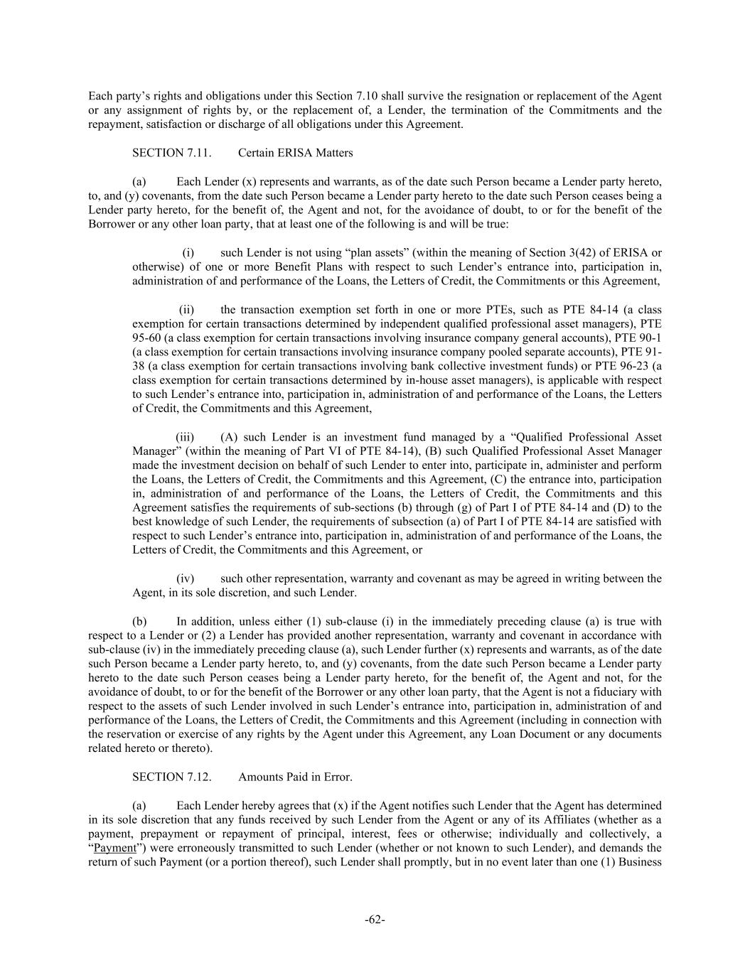 -62- Each party’s rights and obligations under this Section 7.10 shall survive the resignation or replacement of the Agent or any assignment of rights by, or the replacement of, a Lender, the termination of the Commitments and the repayment, satisfaction or discharge of all obligations under this Agreement. SECTION 7.11. Certain ERISA Matters (a) Each Lender (x) represents and warrants, as of the date such Person became a Lender party hereto, to, and (y) covenants, from the date such Person became a Lender party hereto to the date such Person ceases being a Lender party hereto, for the benefit of, the Agent and not, for the avoidance of doubt, to or for the benefit of the Borrower or any other loan party, that at least one of the following is and will be true: (i) such Lender is not using “plan assets” (within the meaning of Section 3(42) of ERISA or otherwise) of one or more Benefit Plans with respect to such Lender’s entrance into, participation in, administration of and performance of the Loans, the Letters of Credit, the Commitments or this Agreement, (ii) the transaction exemption set forth in one or more PTEs, such as PTE 84-14 (a class exemption for certain transactions determined by independent qualified professional asset managers), PTE 95-60 (a class exemption for certain transactions involving insurance company general accounts), PTE 90-1 (a class exemption for certain transactions involving insurance company pooled separate accounts), PTE 91- 38 (a class exemption for certain transactions involving bank collective investment funds) or PTE 96-23 (a class exemption for certain transactions determined by in-house asset managers), is applicable with respect to such Lender’s entrance into, participation in, administration of and performance of the Loans, the Letters of Credit, the Commitments and this Agreement, (iii) (A) such Lender is an investment fund managed by a “Qualified Professional Asset Manager” (within the meaning of Part VI of PTE 84-14), (B) such Qualified Professional Asset Manager made the investment decision on behalf of such Lender to enter into, participate in, administer and perform the Loans, the Letters of Credit, the Commitments and this Agreement, (C) the entrance into, participation in, administration of and performance of the Loans, the Letters of Credit, the Commitments and this Agreement satisfies the requirements of sub-sections (b) through (g) of Part I of PTE 84-14 and (D) to the best knowledge of such Lender, the requirements of subsection (a) of Part I of PTE 84-14 are satisfied with respect to such Lender’s entrance into, participation in, administration of and performance of the Loans, the Letters of Credit, the Commitments and this Agreement, or (iv) such other representation, warranty and covenant as may be agreed in writing between the Agent, in its sole discretion, and such Lender. (b) In addition, unless either (1) sub-clause (i) in the immediately preceding clause (a) is true with respect to a Lender or (2) a Lender has provided another representation, warranty and covenant in accordance with sub-clause (iv) in the immediately preceding clause (a), such Lender further (x) represents and warrants, as of the date such Person became a Lender party hereto, to, and (y) covenants, from the date such Person became a Lender party hereto to the date such Person ceases being a Lender party hereto, for the benefit of, the Agent and not, for the avoidance of doubt, to or for the benefit of the Borrower or any other loan party, that the Agent is not a fiduciary with respect to the assets of such Lender involved in such Lender’s entrance into, participation in, administration of and performance of the Loans, the Letters of Credit, the Commitments and this Agreement (including in connection with the reservation or exercise of any rights by the Agent under this Agreement, any Loan Document or any documents related hereto or thereto). SECTION 7.12. Amounts Paid in Error. (a) Each Lender hereby agrees that (x) if the Agent notifies such Lender that the Agent has determined in its sole discretion that any funds received by such Lender from the Agent or any of its Affiliates (whether as a payment, prepayment or repayment of principal, interest, fees or otherwise; individually and collectively, a “Payment”) were erroneously transmitted to such Lender (whether or not known to such Lender), and demands the return of such Payment (or a portion thereof), such Lender shall promptly, but in no event later than one (1) Business