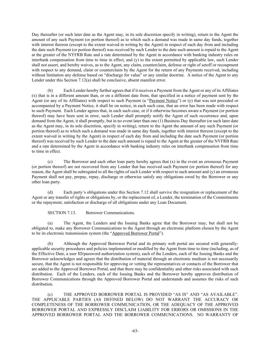 -63- Day thereafter (or such later date as the Agent may, in its sole discretion specify in writing), return to the Agent the amount of any such Payment (or portion thereof) as to which such a demand was made in same day funds, together with interest thereon (except to the extent waived in writing by the Agent) in respect of each day from and including the date such Payment (or portion thereof) was received by such Lender to the date such amount is repaid to the Agent at the greater of the NYFRB Rate and a rate determined by the Agent in accordance with banking industry rules on interbank compensation from time to time in effect, and (y) to the extent permitted by applicable law, such Lender shall not assert, and hereby waives, as to the Agent, any claim, counterclaim, defense or right of setoff or recoupment with respect to any demand, claim or counterclaim by the Agent for the return of any Payments received, including without limitation any defense based on “discharge for value” or any similar doctrine. A notice of the Agent to any Lender under this Section 7.12(a) shall be conclusive, absent manifest error. (b) Each Lender hereby further agrees that if it receives a Payment from the Agent or any of its Affiliates (x) that is in a different amount than, or on a different date from, that specified in a notice of payment sent by the Agent (or any of its Affiliates) with respect to such Payment (a “Payment Notice”) or (y) that was not preceded or accompanied by a Payment Notice, it shall be on notice, in each such case, that an error has been made with respect to such Payment. Each Lender agrees that, in each such case, or if it otherwise becomes aware a Payment (or portion thereof) may have been sent in error, such Lender shall promptly notify the Agent of such occurrence and, upon demand from the Agent, it shall promptly, but in no event later than one (1) Business Day thereafter (or such later date as the Agent may, in its sole discretion, specify in writing), return to the Agent the amount of any such Payment (or portion thereof) as to which such a demand was made in same day funds, together with interest thereon (except to the extent waived in writing by the Agent) in respect of each day from and including the date such Payment (or portion thereof) was received by such Lender to the date such amount is repaid to the Agent at the greater of the NYFRB Rate and a rate determined by the Agent in accordance with banking industry rules on interbank compensation from time to time in effect. (c) The Borrower and each other loan party hereby agrees that (x) in the event an erroneous Payment (or portion thereof) are not recovered from any Lender that has received such Payment (or portion thereof) for any reason, the Agent shall be subrogated to all the rights of such Lender with respect to such amount and (y) an erroneous Payment shall not pay, prepay, repay, discharge or otherwise satisfy any obligations owed by the Borrower or any other loan party. (d) Each party’s obligations under this Section 7.12 shall survive the resignation or replacement of the Agent or any transfer of rights or obligations by, or the replacement of, a Lender, the termination of the Commitments or the repayment, satisfaction or discharge of all obligations under any Loan Document. SECTION 7.13. Borrower Communications. (a) The Agent, the Lenders and the Issuing Banks agree that the Borrower may, but shall not be obligated to, make any Borrower Communications to the Agent through an electronic platform chosen by the Agent to be its electronic transmission system (the “Approved Borrower Portal”). (b) Although the Approved Borrower Portal and its primary web portal are secured with generally- applicable security procedures and policies implemented or modified by the Agent from time to time (including, as of the Effective Date, a user ID/password authorization system), each of the Lenders, each of the Issuing Banks and the Borrower acknowledges and agrees that the distribution of material through an electronic medium is not necessarily secure, that the Agent is not responsible for approving or vetting the representatives or contacts of the Borrower that are added to the Approved Borrower Portal, and that there may be confidentiality and other risks associated with such distribution. Each of the Lenders, each of the Issuing Banks and the Borrower hereby approves distribution of Borrower Communications through the Approved Borrower Portal and understands and assumes the risks of such distribution. (c) THE APPROVED BORROWER PORTAL IS PROVIDED “AS IS” AND “AS AVAILABLE”. THE APPLICABLE PARTIES (AS DEFINED BELOW) DO NOT WARRANT THE ACCURACY OR COMPLETENESS OF THE BORROWER COMMUNICATION, OR THE ADEQUACY OF THE APPROVED BORROWER PORTAL AND EXPRESSLY DISCLAIM LIABILITY FOR ERRORS OR OMISSIONS IN THE APPROVED BORROWER PORTAL AND THE BORROWER COMMUNICATIONS. NO WARRANTY OF