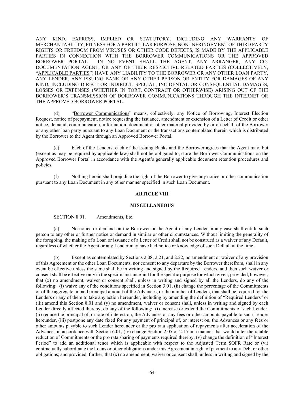 -64- ANY KIND, EXPRESS, IMPLIED OR STATUTORY, INCLUDING ANY WARRANTY OF MERCHANTABILITY, FITNESS FOR A PARTICULAR PURPOSE, NON-INFRINGEMENT OF THIRD PARTY RIGHTS OR FREEDOM FROM VIRUSES OR OTHER CODE DEFECTS, IS MADE BY THE APPLICABLE PARTIES IN CONNECTION WITH THE BORROWER COMMUNICATIONS OR THE APPROVED BORROWER PORTAL. IN NO EVENT SHALL THE AGENT, ANY ARRANGER, ANY CO- DOCUMENTATION AGENT, OR ANY OF THEIR RESPECTIVE RELATED PARTIES (COLLECTIVELY, “APPLICABLE PARTIES”) HAVE ANY LIABILITY TO THE BORROWER OR ANY OTHER LOAN PARTY, ANY LENDER, ANY ISSUING BANK OR ANY OTHER PERSON OR ENTITY FOR DAMAGES OF ANY KIND, INCLUDING DIRECT OR INDIRECT, SPECIAL, INCIDENTAL OR CONSEQUENTIAL DAMAGES, LOSSES OR EXPENSES (WHETHER IN TORT, CONTRACT OR OTHERWISE) ARISING OUT OF THE BORROWER’S TRANSMISSION OF BORROWER COMMUNICATIONS THROUGH THE INTERNET OR THE APPROVED BORROWER PORTAL. (d) “Borrower Communications” means, collectively, any Notice of Borrowing, Interest Election Request, notice of prepayment, notice requesting the issuance, amendment or extension of a Letter of Credit or other notice, demand, communication, information, document or other material provided by or on behalf of the Borrower or any other loan party pursuant to any Loan Document or the transactions contemplated therein which is distributed by the Borrower to the Agent through an Approved Borrower Portal. (e) Each of the Lenders, each of the Issuing Banks and the Borrower agrees that the Agent may, but (except as may be required by applicable law) shall not be obligated to, store the Borrower Communications on the Approved Borrower Portal in accordance with the Agent’s generally applicable document retention procedures and policies. (f) Nothing herein shall prejudice the right of the Borrower to give any notice or other communication pursuant to any Loan Document in any other manner specified in such Loan Document. ARTICLE VIII MISCELLANEOUS SECTION 8.01. Amendments, Etc. (a) No notice or demand on the Borrower or the Agent or any Lender in any case shall entitle such person to any other or further notice or demand in similar or other circumstances. Without limiting the generality of the foregoing, the making of a Loan or issuance of a Letter of Credit shall not be construed as a waiver of any Default, regardless of whether the Agent or any Lender may have had notice or knowledge of such Default at the time. (b) Except as contemplated by Sections 2.08, 2.21, and 2.22, no amendment or waiver of any provision of this Agreement or the other Loan Documents, nor consent to any departure by the Borrower therefrom, shall in any event be effective unless the same shall be in writing and signed by the Required Lenders, and then such waiver or consent shall be effective only in the specific instance and for the specific purpose for which given; provided, however, that (x) no amendment, waiver or consent shall, unless in writing and signed by all the Lenders, do any of the following: (i) waive any of the conditions specified in Section 3.01, (ii) change the percentage of the Commitments or of the aggregate unpaid principal amount of the Advances, or the number of Lenders, that shall be required for the Lenders or any of them to take any action hereunder, including by amending the definition of “Required Lenders” or (iii) amend this Section 8.01 and (y) no amendment, waiver or consent shall, unless in writing and signed by each Lender directly affected thereby, do any of the following: (i) increase or extend the Commitments of such Lender, (ii) reduce the principal of, or rate of interest on, the Advances or any fees or other amounts payable to such Lender hereunder, (iii) postpone any date fixed for any payment of principal of, or interest on, the Advances or any fees or other amounts payable to such Lender hereunder or the pro rata application of repayments after acceleration of the Advances in accordance with Section 6.01, (iv) change Section 2.05 or 2.15 in a manner that would alter the ratable reduction of Commitments or the pro rata sharing of payments required thereby, (v) change the definition of “Interest Period” to add an additional tenor which is applicable with respect to the Adjusted Term SOFR Rate or (vi) contractually subordinate the Loans or other obligations under this Agreement in right of payment to any Debt or other obligations; and provided, further, that (x) no amendment, waiver or consent shall, unless in writing and signed by the