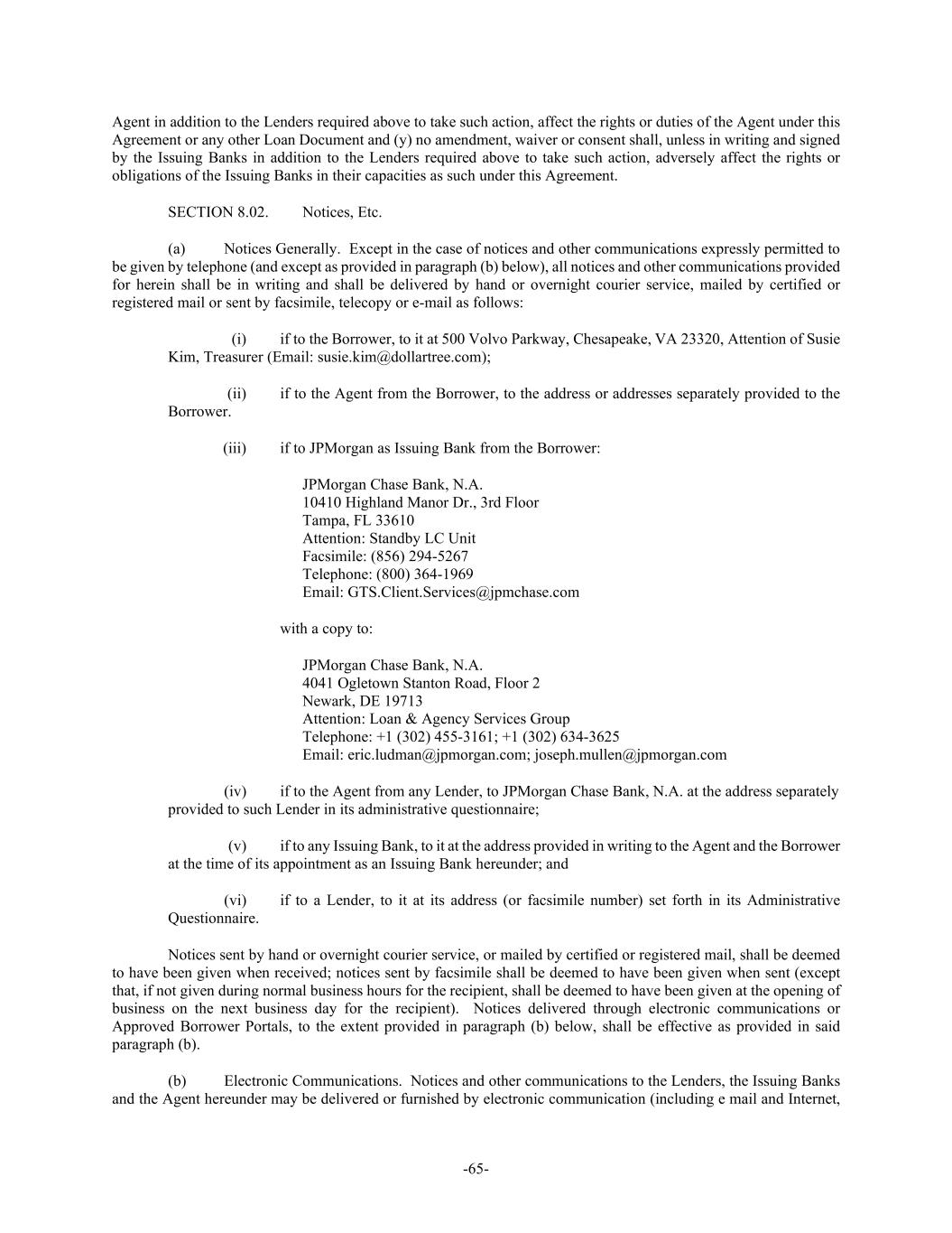 -65- Agent in addition to the Lenders required above to take such action, affect the rights or duties of the Agent under this Agreement or any other Loan Document and (y) no amendment, waiver or consent shall, unless in writing and signed by the Issuing Banks in addition to the Lenders required above to take such action, adversely affect the rights or obligations of the Issuing Banks in their capacities as such under this Agreement. SECTION 8.02. Notices, Etc. (a) Notices Generally. Except in the case of notices and other communications expressly permitted to be given by telephone (and except as provided in paragraph (b) below), all notices and other communications provided for herein shall be in writing and shall be delivered by hand or overnight courier service, mailed by certified or registered mail or sent by facsimile, telecopy or e-mail as follows: (i) if to the Borrower, to it at 500 Volvo Parkway, Chesapeake, VA 23320, Attention of Susie Kim, Treasurer (Email: susie.kim@dollartree.com); (ii) if to the Agent from the Borrower, to the address or addresses separately provided to the Borrower. (iii) if to JPMorgan as Issuing Bank from the Borrower: JPMorgan Chase Bank, N.A. 10410 Highland Manor Dr., 3rd Floor Tampa, FL 33610 Attention: Standby LC Unit Facsimile: (856) 294-5267 Telephone: (800) 364-1969 Email: GTS.Client.Services@jpmchase.com with a copy to: JPMorgan Chase Bank, N.A. 4041 Ogletown Stanton Road, Floor 2 Newark, DE 19713 Attention: Loan & Agency Services Group Telephone: +1 (302) 455-3161; +1 (302) 634-3625 Email: eric.ludman@jpmorgan.com; joseph.mullen@jpmorgan.com (iv) if to the Agent from any Lender, to JPMorgan Chase Bank, N.A. at the address separately provided to such Lender in its administrative questionnaire; (v) if to any Issuing Bank, to it at the address provided in writing to the Agent and the Borrower at the time of its appointment as an Issuing Bank hereunder; and (vi) if to a Lender, to it at its address (or facsimile number) set forth in its Administrative Questionnaire. Notices sent by hand or overnight courier service, or mailed by certified or registered mail, shall be deemed to have been given when received; notices sent by facsimile shall be deemed to have been given when sent (except that, if not given during normal business hours for the recipient, shall be deemed to have been given at the opening of business on the next business day for the recipient). Notices delivered through electronic communications or Approved Borrower Portals, to the extent provided in paragraph (b) below, shall be effective as provided in said paragraph (b). (b) Electronic Communications. Notices and other communications to the Lenders, the Issuing Banks and the Agent hereunder may be delivered or furnished by electronic communication (including e mail and Internet,
