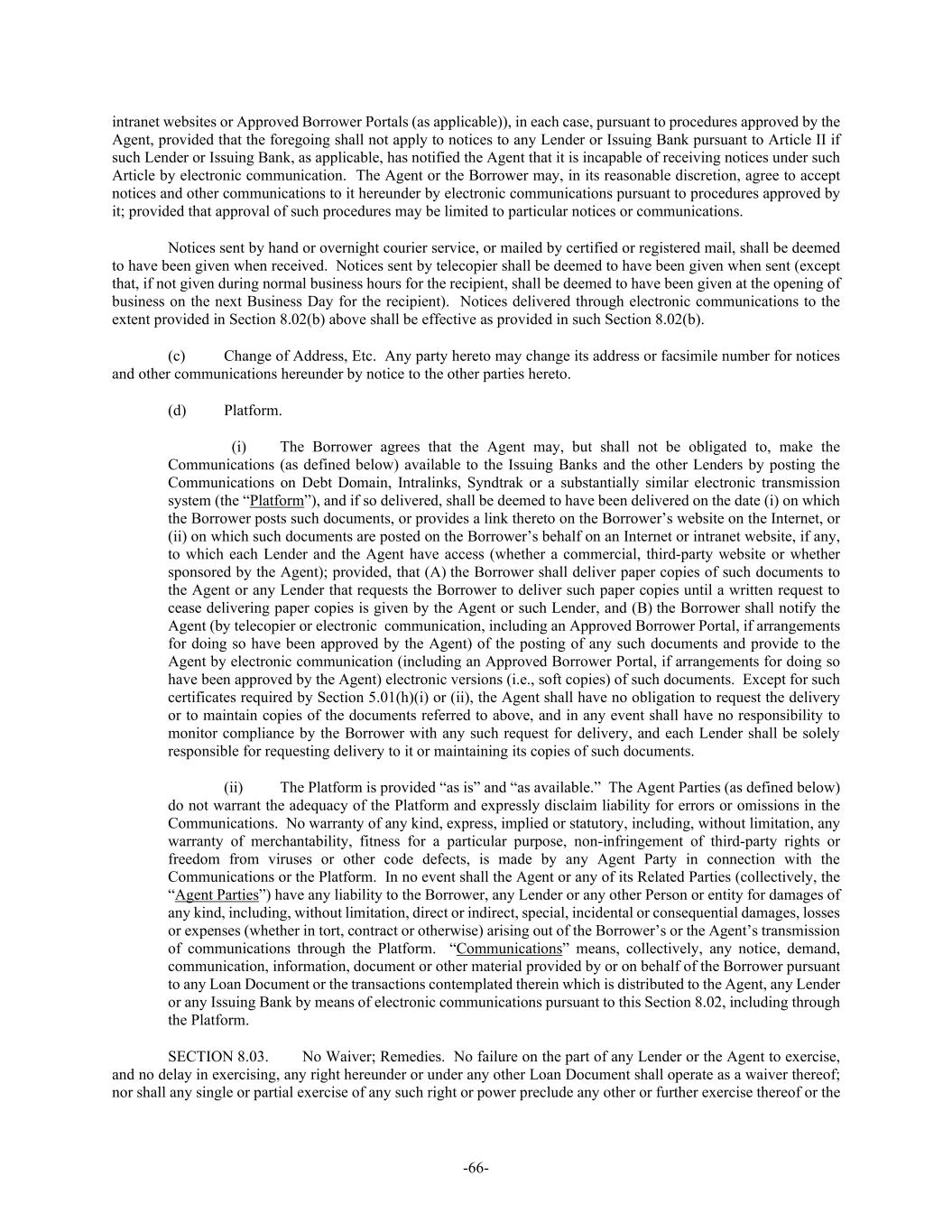-66- intranet websites or Approved Borrower Portals (as applicable)), in each case, pursuant to procedures approved by the Agent, provided that the foregoing shall not apply to notices to any Lender or Issuing Bank pursuant to Article II if such Lender or Issuing Bank, as applicable, has notified the Agent that it is incapable of receiving notices under such Article by electronic communication. The Agent or the Borrower may, in its reasonable discretion, agree to accept notices and other communications to it hereunder by electronic communications pursuant to procedures approved by it; provided that approval of such procedures may be limited to particular notices or communications. Notices sent by hand or overnight courier service, or mailed by certified or registered mail, shall be deemed to have been given when received. Notices sent by telecopier shall be deemed to have been given when sent (except that, if not given during normal business hours for the recipient, shall be deemed to have been given at the opening of business on the next Business Day for the recipient). Notices delivered through electronic communications to the extent provided in Section 8.02(b) above shall be effective as provided in such Section 8.02(b). (c) Change of Address, Etc. Any party hereto may change its address or facsimile number for notices and other communications hereunder by notice to the other parties hereto. (d) Platform. (i) The Borrower agrees that the Agent may, but shall not be obligated to, make the Communications (as defined below) available to the Issuing Banks and the other Lenders by posting the Communications on Debt Domain, Intralinks, Syndtrak or a substantially similar electronic transmission system (the “Platform”), and if so delivered, shall be deemed to have been delivered on the date (i) on which the Borrower posts such documents, or provides a link thereto on the Borrower’s website on the Internet, or (ii) on which such documents are posted on the Borrower’s behalf on an Internet or intranet website, if any, to which each Lender and the Agent have access (whether a commercial, third-party website or whether sponsored by the Agent); provided, that (A) the Borrower shall deliver paper copies of such documents to the Agent or any Lender that requests the Borrower to deliver such paper copies until a written request to cease delivering paper copies is given by the Agent or such Lender, and (B) the Borrower shall notify the Agent (by telecopier or electronic communication, including an Approved Borrower Portal, if arrangements for doing so have been approved by the Agent) of the posting of any such documents and provide to the Agent by electronic communication (including an Approved Borrower Portal, if arrangements for doing so have been approved by the Agent) electronic versions (i.e., soft copies) of such documents. Except for such certificates required by Section 5.01(h)(i) or (ii), the Agent shall have no obligation to request the delivery or to maintain copies of the documents referred to above, and in any event shall have no responsibility to monitor compliance by the Borrower with any such request for delivery, and each Lender shall be solely responsible for requesting delivery to it or maintaining its copies of such documents. (ii) The Platform is provided “as is” and “as available.” The Agent Parties (as defined below) do not warrant the adequacy of the Platform and expressly disclaim liability for errors or omissions in the Communications. No warranty of any kind, express, implied or statutory, including, without limitation, any warranty of merchantability, fitness for a particular purpose, non-infringement of third-party rights or freedom from viruses or other code defects, is made by any Agent Party in connection with the Communications or the Platform. In no event shall the Agent or any of its Related Parties (collectively, the “Agent Parties”) have any liability to the Borrower, any Lender or any other Person or entity for damages of any kind, including, without limitation, direct or indirect, special, incidental or consequential damages, losses or expenses (whether in tort, contract or otherwise) arising out of the Borrower’s or the Agent’s transmission of communications through the Platform. “Communications” means, collectively, any notice, demand, communication, information, document or other material provided by or on behalf of the Borrower pursuant to any Loan Document or the transactions contemplated therein which is distributed to the Agent, any Lender or any Issuing Bank by means of electronic communications pursuant to this Section 8.02, including through the Platform. SECTION 8.03. No Waiver; Remedies. No failure on the part of any Lender or the Agent to exercise, and no delay in exercising, any right hereunder or under any other Loan Document shall operate as a waiver thereof; nor shall any single or partial exercise of any such right or power preclude any other or further exercise thereof or the