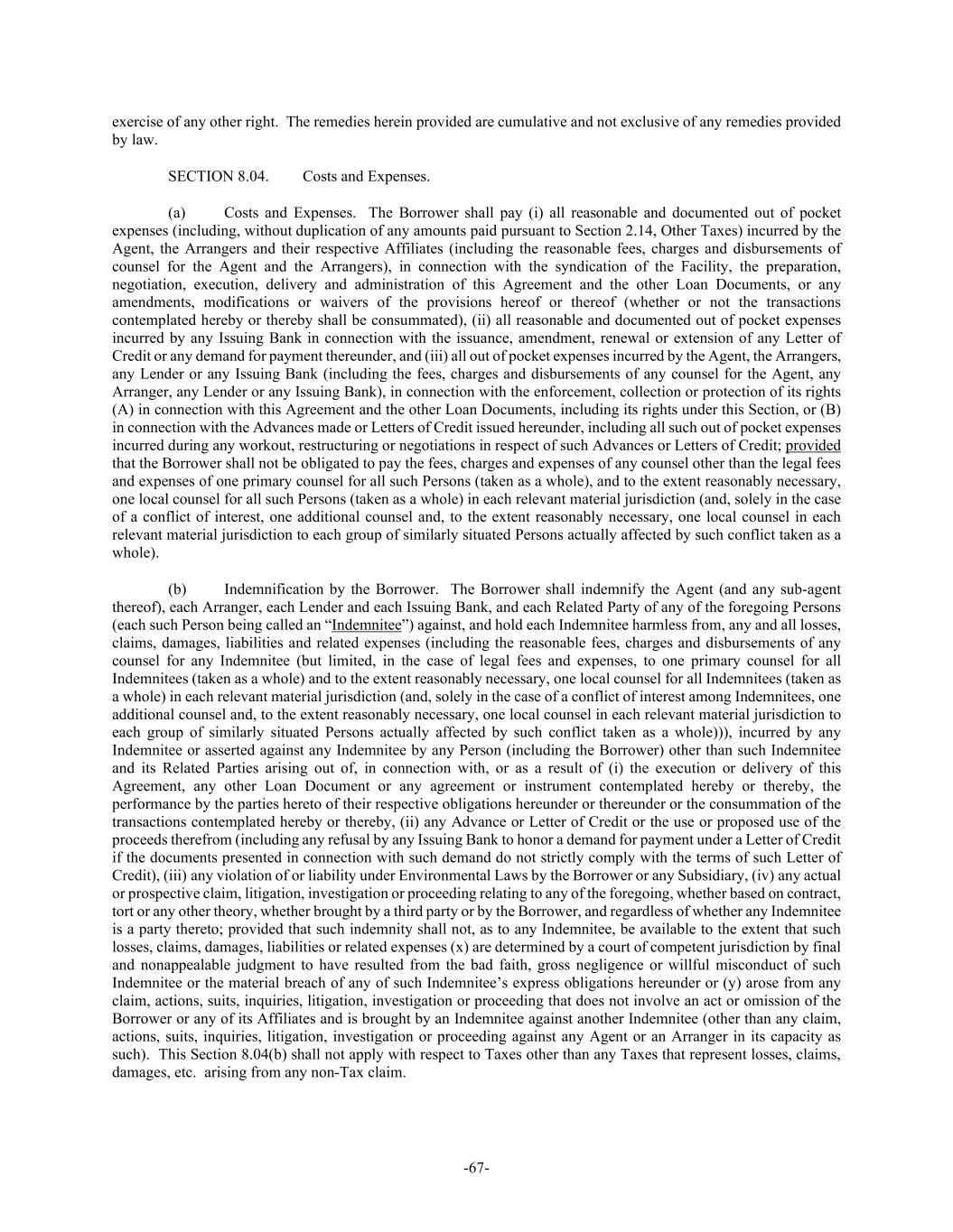 -67- exercise of any other right. The remedies herein provided are cumulative and not exclusive of any remedies provided by law. SECTION 8.04. Costs and Expenses. (a) Costs and Expenses. The Borrower shall pay (i) all reasonable and documented out of pocket expenses (including, without duplication of any amounts paid pursuant to Section 2.14, Other Taxes) incurred by the Agent, the Arrangers and their respective Affiliates (including the reasonable fees, charges and disbursements of counsel for the Agent and the Arrangers), in connection with the syndication of the Facility, the preparation, negotiation, execution, delivery and administration of this Agreement and the other Loan Documents, or any amendments, modifications or waivers of the provisions hereof or thereof (whether or not the transactions contemplated hereby or thereby shall be consummated), (ii) all reasonable and documented out of pocket expenses incurred by any Issuing Bank in connection with the issuance, amendment, renewal or extension of any Letter of Credit or any demand for payment thereunder, and (iii) all out of pocket expenses incurred by the Agent, the Arrangers, any Lender or any Issuing Bank (including the fees, charges and disbursements of any counsel for the Agent, any Arranger, any Lender or any Issuing Bank), in connection with the enforcement, collection or protection of its rights (A) in connection with this Agreement and the other Loan Documents, including its rights under this Section, or (B) in connection with the Advances made or Letters of Credit issued hereunder, including all such out of pocket expenses incurred during any workout, restructuring or negotiations in respect of such Advances or Letters of Credit; provided that the Borrower shall not be obligated to pay the fees, charges and expenses of any counsel other than the legal fees and expenses of one primary counsel for all such Persons (taken as a whole), and to the extent reasonably necessary, one local counsel for all such Persons (taken as a whole) in each relevant material jurisdiction (and, solely in the case of a conflict of interest, one additional counsel and, to the extent reasonably necessary, one local counsel in each relevant material jurisdiction to each group of similarly situated Persons actually affected by such conflict taken as a whole). (b) Indemnification by the Borrower. The Borrower shall indemnify the Agent (and any sub-agent thereof), each Arranger, each Lender and each Issuing Bank, and each Related Party of any of the foregoing Persons (each such Person being called an “Indemnitee”) against, and hold each Indemnitee harmless from, any and all losses, claims, damages, liabilities and related expenses (including the reasonable fees, charges and disbursements of any counsel for any Indemnitee (but limited, in the case of legal fees and expenses, to one primary counsel for all Indemnitees (taken as a whole) and to the extent reasonably necessary, one local counsel for all Indemnitees (taken as a whole) in each relevant material jurisdiction (and, solely in the case of a conflict of interest among Indemnitees, one additional counsel and, to the extent reasonably necessary, one local counsel in each relevant material jurisdiction to each group of similarly situated Persons actually affected by such conflict taken as a whole))), incurred by any Indemnitee or asserted against any Indemnitee by any Person (including the Borrower) other than such Indemnitee and its Related Parties arising out of, in connection with, or as a result of (i) the execution or delivery of this Agreement, any other Loan Document or any agreement or instrument contemplated hereby or thereby, the performance by the parties hereto of their respective obligations hereunder or thereunder or the consummation of the transactions contemplated hereby or thereby, (ii) any Advance or Letter of Credit or the use or proposed use of the proceeds therefrom (including any refusal by any Issuing Bank to honor a demand for payment under a Letter of Credit if the documents presented in connection with such demand do not strictly comply with the terms of such Letter of Credit), (iii) any violation of or liability under Environmental Laws by the Borrower or any Subsidiary, (iv) any actual or prospective claim, litigation, investigation or proceeding relating to any of the foregoing, whether based on contract, tort or any other theory, whether brought by a third party or by the Borrower, and regardless of whether any Indemnitee is a party thereto; provided that such indemnity shall not, as to any Indemnitee, be available to the extent that such losses, claims, damages, liabilities or related expenses (x) are determined by a court of competent jurisdiction by final and nonappealable judgment to have resulted from the bad faith, gross negligence or willful misconduct of such Indemnitee or the material breach of any of such Indemnitee’s express obligations hereunder or (y) arose from any claim, actions, suits, inquiries, litigation, investigation or proceeding that does not involve an act or omission of the Borrower or any of its Affiliates and is brought by an Indemnitee against another Indemnitee (other than any claim, actions, suits, inquiries, litigation, investigation or proceeding against any Agent or an Arranger in its capacity as such). This Section 8.04(b) shall not apply with respect to Taxes other than any Taxes that represent losses, claims, damages, etc. arising from any non-Tax claim.