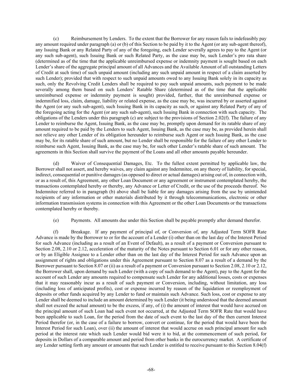 -68- (c) Reimbursement by Lenders. To the extent that the Borrower for any reason fails to indefeasibly pay any amount required under paragraph (a) or (b) of this Section to be paid by it to the Agent (or any sub-agent thereof), any Issuing Bank or any Related Party of any of the foregoing, each Lender severally agrees to pay to the Agent (or any such sub-agent), such Issuing Bank or such Related Party, as the case may be, such Lender’s pro rata share (determined as of the time that the applicable unreimbursed expense or indemnity payment is sought based on each Lender’s share of the aggregate principal amount of all Advances and the Available Amount of all outstanding Letters of Credit at such time) of such unpaid amount (including any such unpaid amount in respect of a claim asserted by such Lender); provided that with respect to such unpaid amounts owed to any Issuing Bank solely in its capacity as such, only the Revolving Credit Lenders shall be required to pay such unpaid amounts, such payment to be made severally among them based on such Lenders’ Ratable Share (determined as of the time that the applicable unreimbursed expense or indemnity payment is sought) provided, further, that the unreimbursed expense or indemnified loss, claim, damage, liability or related expense, as the case may be, was incurred by or asserted against the Agent (or any such sub-agent), such Issuing Bank in its capacity as such, or against any Related Party of any of the foregoing acting for the Agent (or any such sub-agent), such Issuing Bank in connection with such capacity. The obligations of the Lenders under this paragraph (c) are subject to the provisions of Section 2.02(f). The failure of any Lender to reimburse the Agent, Issuing Bank, as the case may be, promptly upon demand for its ratable share of any amount required to be paid by the Lenders to such Agent, Issuing Bank, as the case may be, as provided herein shall not relieve any other Lender of its obligation hereunder to reimburse such Agent or such Issuing Bank, as the case may be, for its ratable share of such amount, but no Lender shall be responsible for the failure of any other Lender to reimburse such Agent, Issuing Bank, as the case may be, for such other Lender’s ratable share of such amount. The agreements in this Section shall survive the payment of the Loans and all other amounts payable hereunder. (d) Waiver of Consequential Damages, Etc. To the fullest extent permitted by applicable law, the Borrower shall not assert, and hereby waives, any claim against any Indemnitee, on any theory of liability, for special, indirect, consequential or punitive damages (as opposed to direct or actual damages) arising out of, in connection with, or as a result of, this Agreement, any other Loan Document or any agreement or instrument contemplated hereby, the transactions contemplated hereby or thereby, any Advance or Letter of Credit, or the use of the proceeds thereof. No Indemnitee referred to in paragraph (b) above shall be liable for any damages arising from the use by unintended recipients of any information or other materials distributed by it through telecommunications, electronic or other information transmission systems in connection with this Agreement or the other Loan Documents or the transactions contemplated hereby or thereby. (e) Payments. All amounts due under this Section shall be payable promptly after demand therefor. (f) Breakage. If any payment of principal of, or Conversion of, any Adjusted Term SOFR Rate Advance is made by the Borrower to or for the account of a Lender (i) other than on the last day of the Interest Period for such Advance (including as a result of an Event of Default), as a result of a payment or Conversion pursuant to Section 2.08, 2.10 or 2.12, acceleration of the maturity of the Notes pursuant to Section 6.01 or for any other reason, or by an Eligible Assignee to a Lender other than on the last day of the Interest Period for such Advance upon an assignment of rights and obligations under this Agreement pursuant to Section 8.07 as a result of a demand by the Borrower pursuant to Section 8.07 or (ii) as a result of a payment or Conversion pursuant to Section 2.08, 2.10 or 2.12, the Borrower shall, upon demand by such Lender (with a copy of such demand to the Agent), pay to the Agent for the account of such Lender any amounts required to compensate such Lender for any additional losses, costs or expenses that it may reasonably incur as a result of such payment or Conversion, including, without limitation, any loss (including loss of anticipated profits), cost or expense incurred by reason of the liquidation or reemployment of deposits or other funds acquired by any Lender to fund or maintain such Advance. Such loss, cost or expense to any Lender shall be deemed to include an amount determined by such Lender (it being understood that the deemed amount shall not exceed the actual amount) to be the excess, if any, of (i) the amount of interest that would have accrued on the principal amount of such Loan had such event not occurred, at the Adjusted Term SOFR Rate that would have been applicable to such Loan, for the period from the date of such event to the last day of the then current Interest Period therefor (or, in the case of a failure to borrow, convert or continue, for the period that would have been the Interest Period for such Loan), over (ii) the amount of interest that would accrue on such principal amount for such period at the interest rate which such Lender would bid were it to bid, at the commencement of such period, for deposits in Dollars of a comparable amount and period from other banks in the eurocurrency market. A certificate of any Lender setting forth any amount or amounts that such Lender is entitled to receive pursuant to this Section 8.04(f)